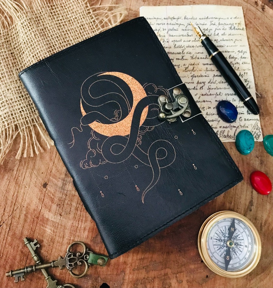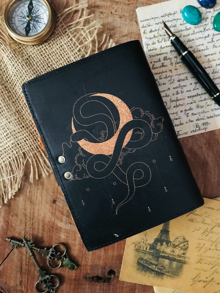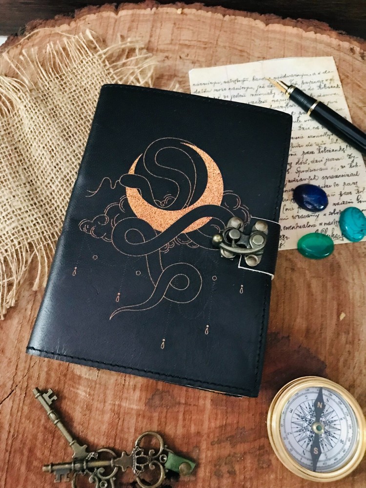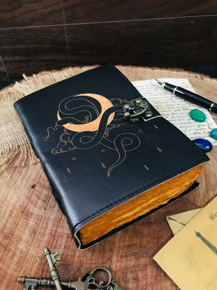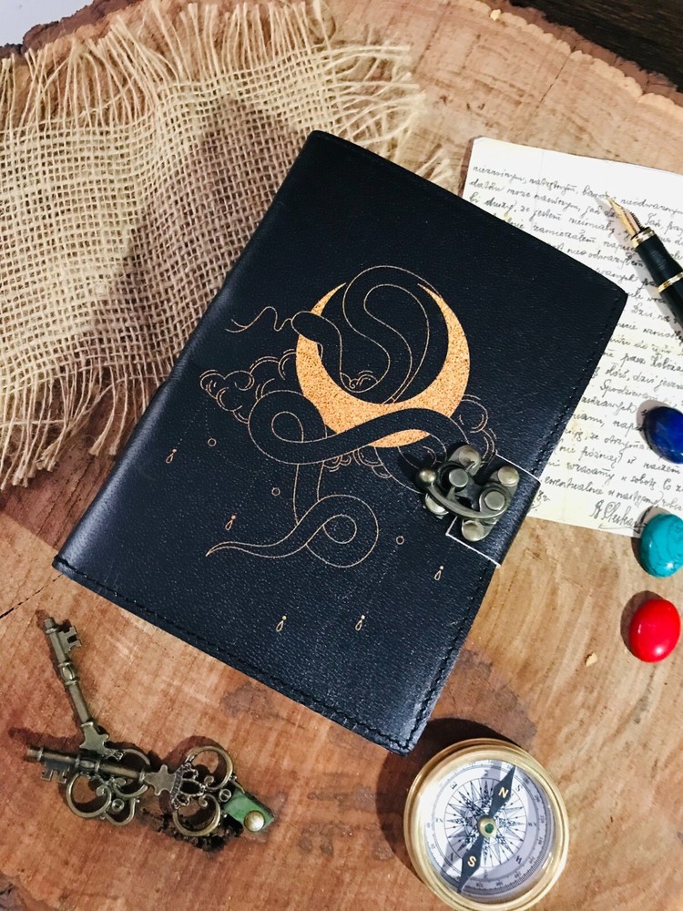 1. Premium Quality Leather: Our leather journals are crafted using top-grade, genuine leather that not only looks stunning but also ensures durability and longevity. 2. SERPENTINE LEATHER PRINTED DESIGN : P erfectly print with the Serpentine Moon designs, this journal makes a thoughtful gift to anyone of different cultures. The Serpentine symbolizes firmness, strength, and power while the moon represents calmness, beauty, and nurturing 3. UV Printing Technology: We employ state-of-the-art UV printing technology to adorn our leather journals with intricate designs, patterns, or personalization. This process offers vibrant colors and sharp details that won't fade or wear over time. 4. Aesthetic Appeal: The UV printing adds a touch of elegance and sophistication to each leather journal, making it a stylish accessory that stands out from the crowd. 5. Smooth and Acid-Free Pages: Our journals feature high-quality, acid-free paper that is a delight to write on. The smooth texture ensures a seamless writing experience without any ink bleed-through. 6. Versatile Use: Whether you use it as a personal diary, sketchbook, travel journal, or a thoughtful gift, our UV print leather journals cater to a variety of needs and preferences. 7. Great for Special Occasions: Commemorate milestones, anniversaries, or special events with a custom UV print leather journal that captures the essence of the moment. 8. Perfect Gift Choice: Our UV print leather journals make thoughtful and cherished gifts for friends, family, colleagues, or anyone who appreciates the art of writing and appreciates beautiful craftsmanship. 9. Environmental Consciousness: We prioritize sustainability in our materials and production processes, ensuring our journals are eco-friendly and responsible. 10. Timeless Keepsake: As a combination of premium materials, cutting-edge printing, and timeless design, our UV print leather journals become cherished keepsakes that preserve memories for generations. Experience the unmatched elegance and craftsmanship of our UV print leather journals, and elevate your writing and gifting experience to a whole new level. Nautical design, Serpentine Symbol Leather Journal, Intricate Double snake cover, Halloween Gift, Eco-friendly pages, 200 deckle edge pages, Recycled cotton, Luxurious writing experience, Sustainable writing experience, Handmade craftsmanship, Handcrafted journal, Unique work of perfection, C-Lock security, Style and privacy, Customized experience, Comfortable writing experience