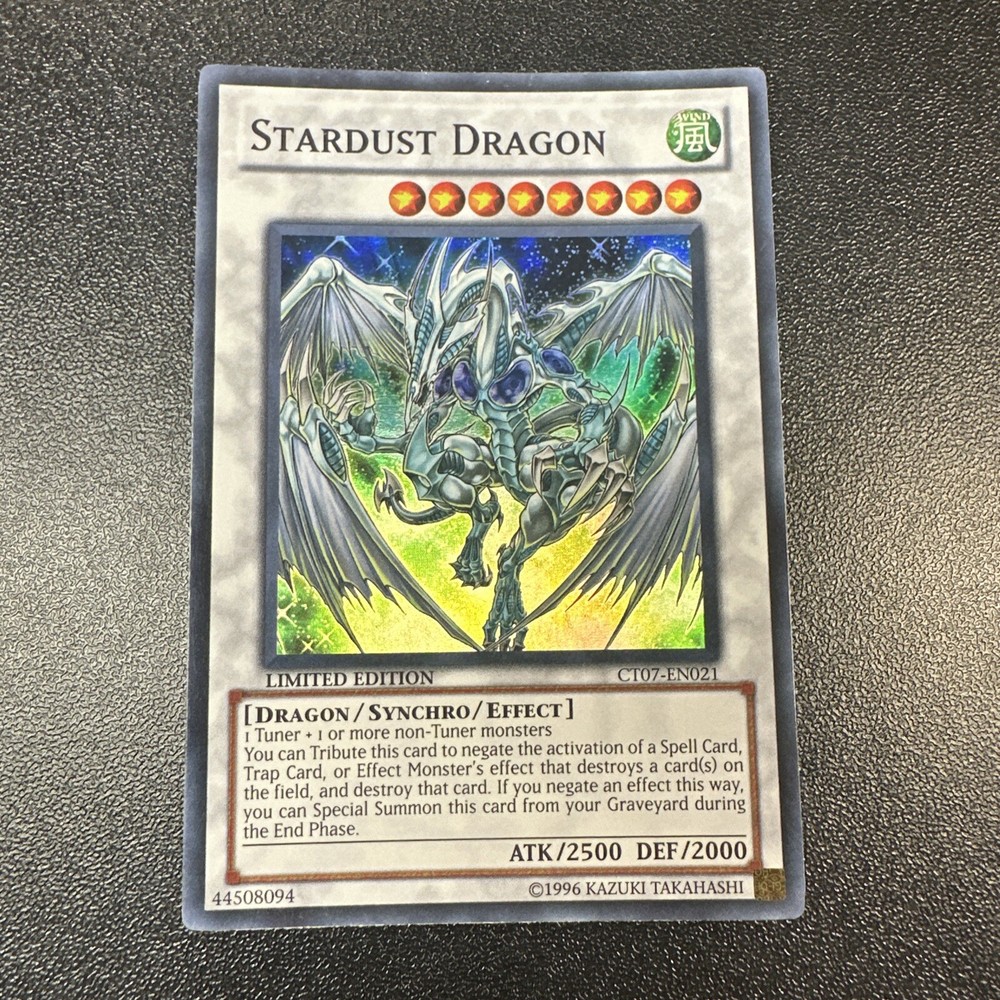 This limited edition Stardust Dragon card is a must-have for any Yu-Gi-Oh! TCG collector. With its super rare status and holographic finish, this card is sure to be a standout addition to your collection. The card features the iconic Dragon creature/monster type and is written in English language. As a fan of the game, you know the value of rare and unique cards. This Stardust Dragon card is no exception, with its CT07-EN021 card number and NM grade. Add this card to your collection today and experience the thrill of owning a limited edition item.