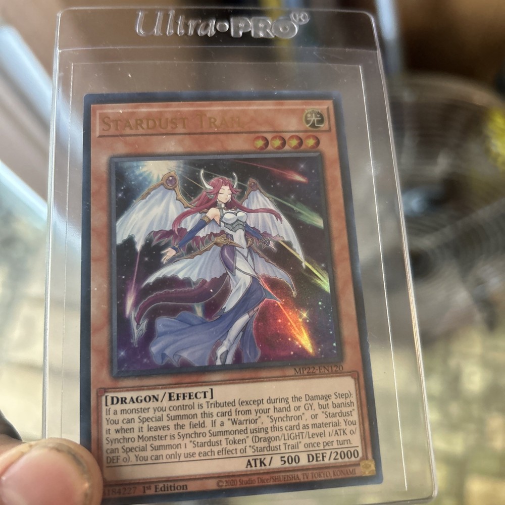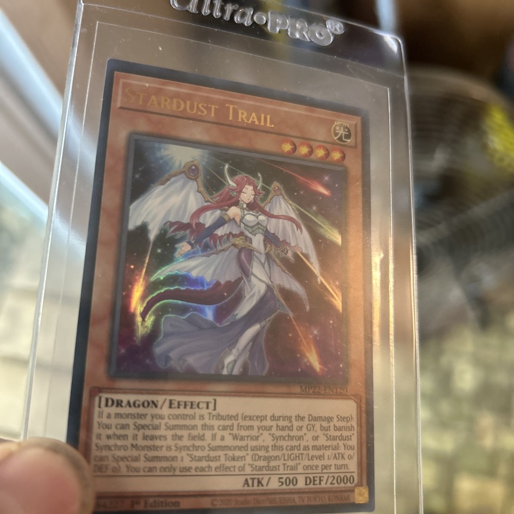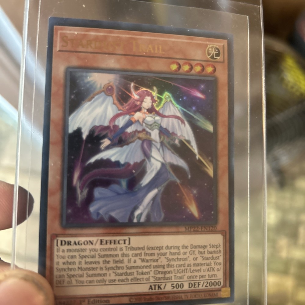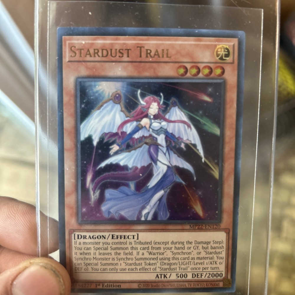 The Stardust Trail MP22-EN120 2022 Tin of the Pharaoh's Gods 1st Edition is an ultra rare Yu-Gi-Oh! TCG card manufactured by Konami. This English language card features a dragon creature type with 2000 defense and 500 attack power. As part of the 2022 Tin of the Pharaoh's Gods set, this light attribute card is a valuable addition to any collector's deck.