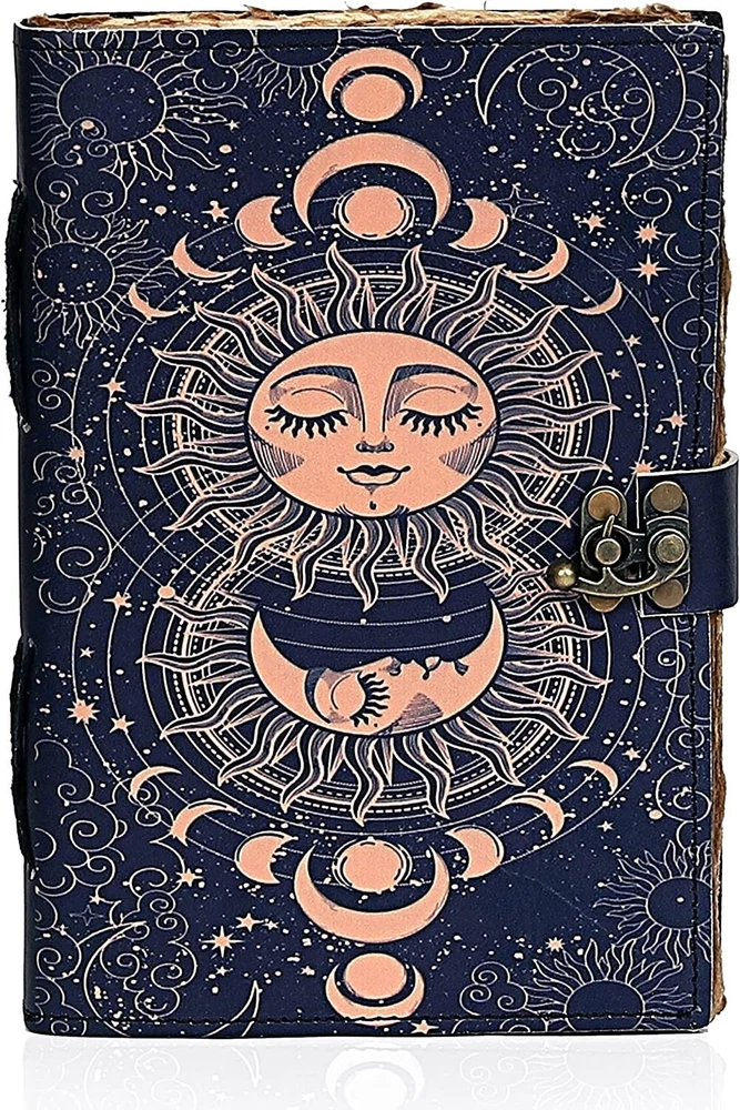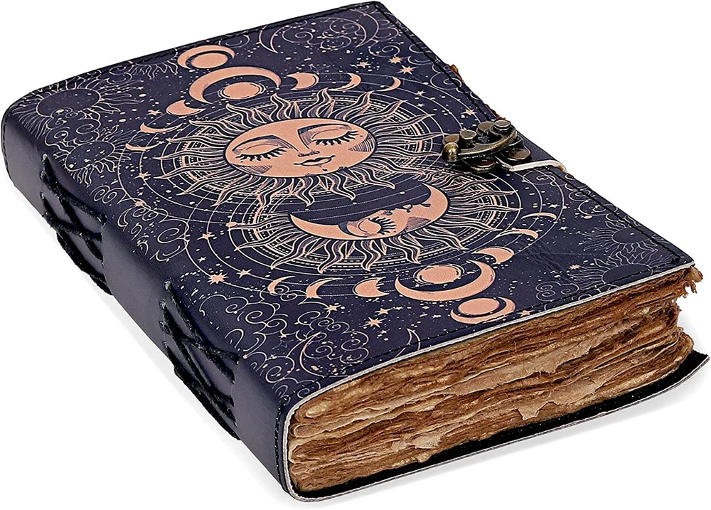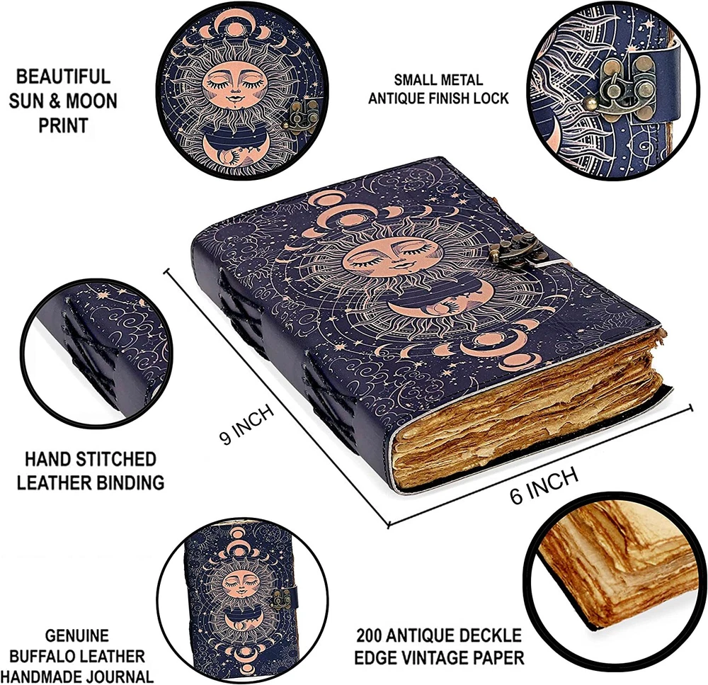 Imported. Handmade Leather Journal. Dimensions - 9 Inch ( Height ) x 2" Inch ( Width ) x 6" Inch ( Length ) Inches. Beautiful Sun & Moon Emboss Both Side ( Front and Back Side ). Original Antique Brass Clasp - Easy for Use. recycled handmade plain ( blank ) Deckle Edge paper used for Sketch, Writing. Sun & Moon Emboss journal, Vintage Journal, Sun moon Journal, Leather Sketchbook, Leather Notebook, Leather Journal for Men, Leather Journal for Women. sun moon journal, sun moon notebook, sun moon sketchbook, sun and moon journal, sun and moon notebook, sun and moon sketchbook, leather journal for men, leather journal for women, leather diary, leather vintage journal, vintage journal, vintage journal for men, handmade journal, leather handmade journal.