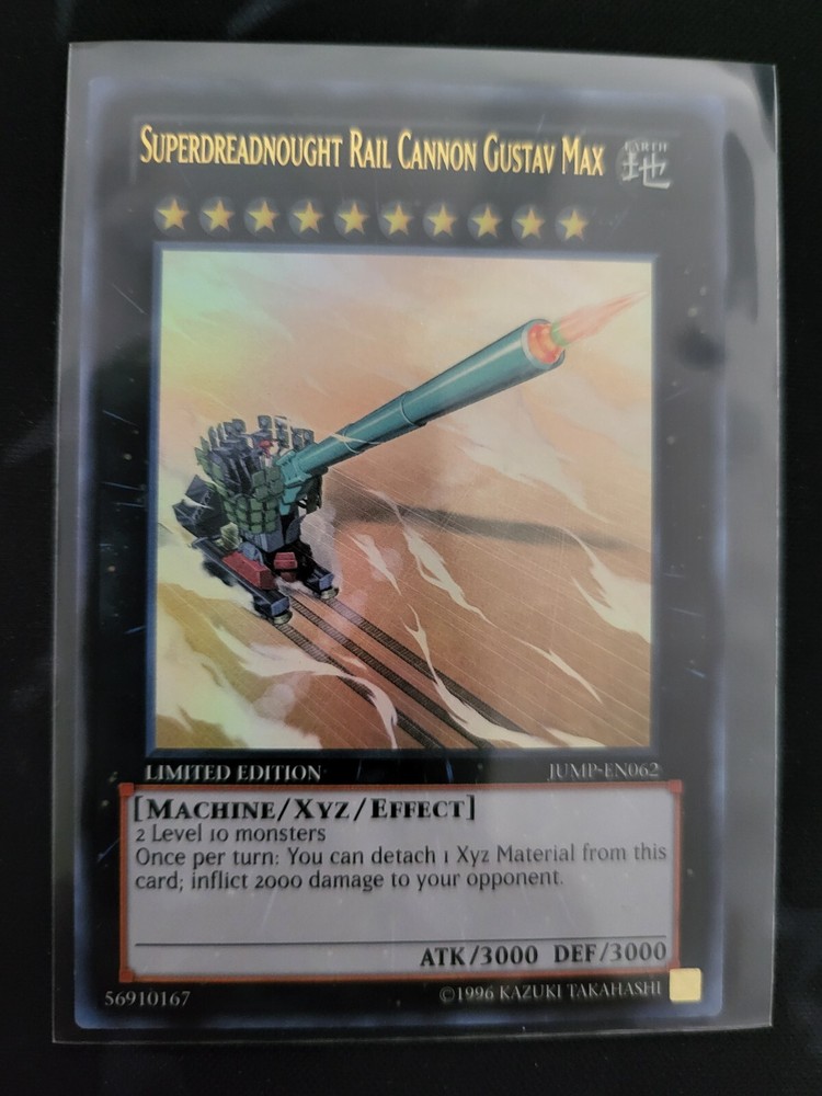 The Superdreadnought Rail Cannon Gustav Max (CT10-EN007) 2013 Collectors Tin Limited is a Yu-Gi-Oh! TCG collectible card from the 2013 Collectors Tins set. This super rare English-language card features an Earth attribute, belongs to the Machine creature type, and has a defense/toughness and attack/power of 3000. Manufactured by Konami, this Xyz and Effect card is a limited edition collectible that is sure to appeal to fans of the game.