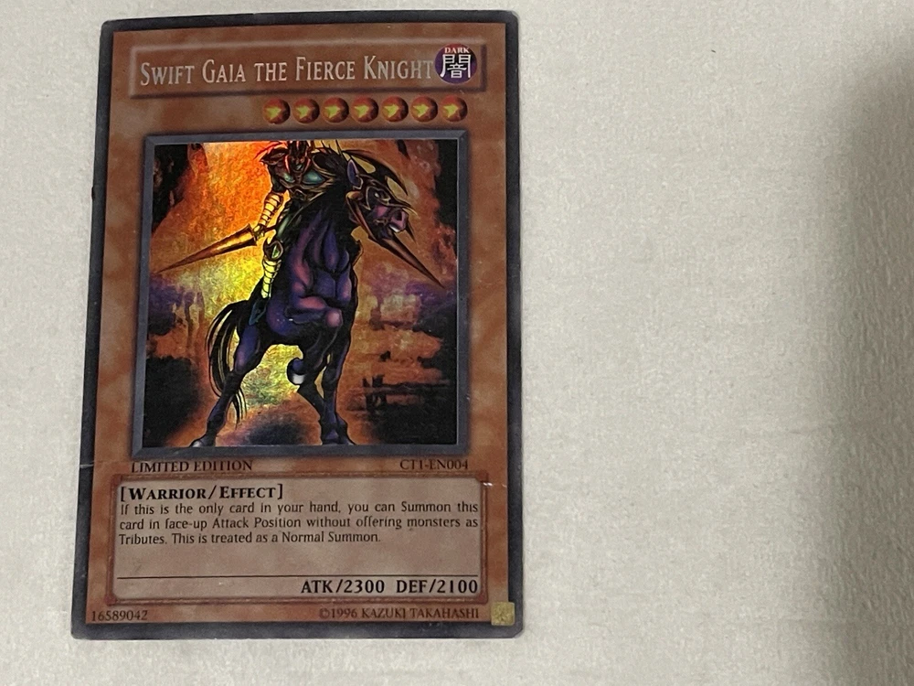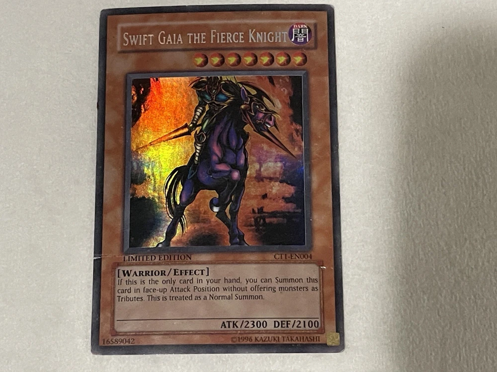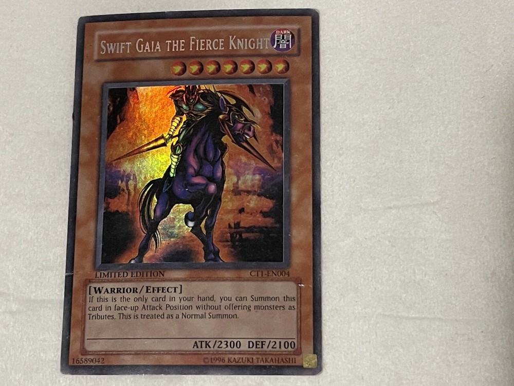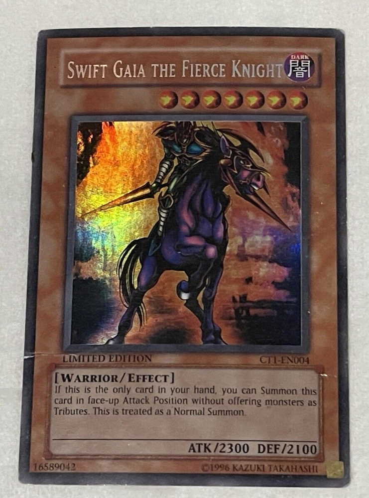 Swift Gaia The Fierce Knight CT1-EN004 MIsprint Heavy Play. This is the Misprint Secret Rare. Its missing the vertical line holographic pattern that normally comes with secret rares. Please check phot...