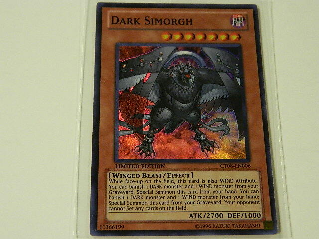IF YOU COLLECT POKEMON OR YUGIHO CARDS, PLEASE CHECK OUT MY OTHER AUCTIONS. SAVE ME AS A FAVORITE SELLER TO GET ALERTS OF WHAT I LIST WEEKLY! CARD: #CT08-EN006 Dark Simorgh (Limited Edition), just a beautiful card, PSA ready! DOMESTIC SHIPPING & HANDLING: First card is $3.50, each additional card is just .50 cents! I NTERNATIONAL SHIPPING & HANDLING: I will ship either First Class if package is under the 4 pound limit, or Priority Mail. Shipping abroad is very expensive usually and it is also very difficult for me. If you have any special requests on shipping ask me before you bid on auction. Ii will combine shipping whenever possible, there are size and weight restrictions shipping internationally so combining shipping is not always possible. Some things I cannot do and some i will not do.