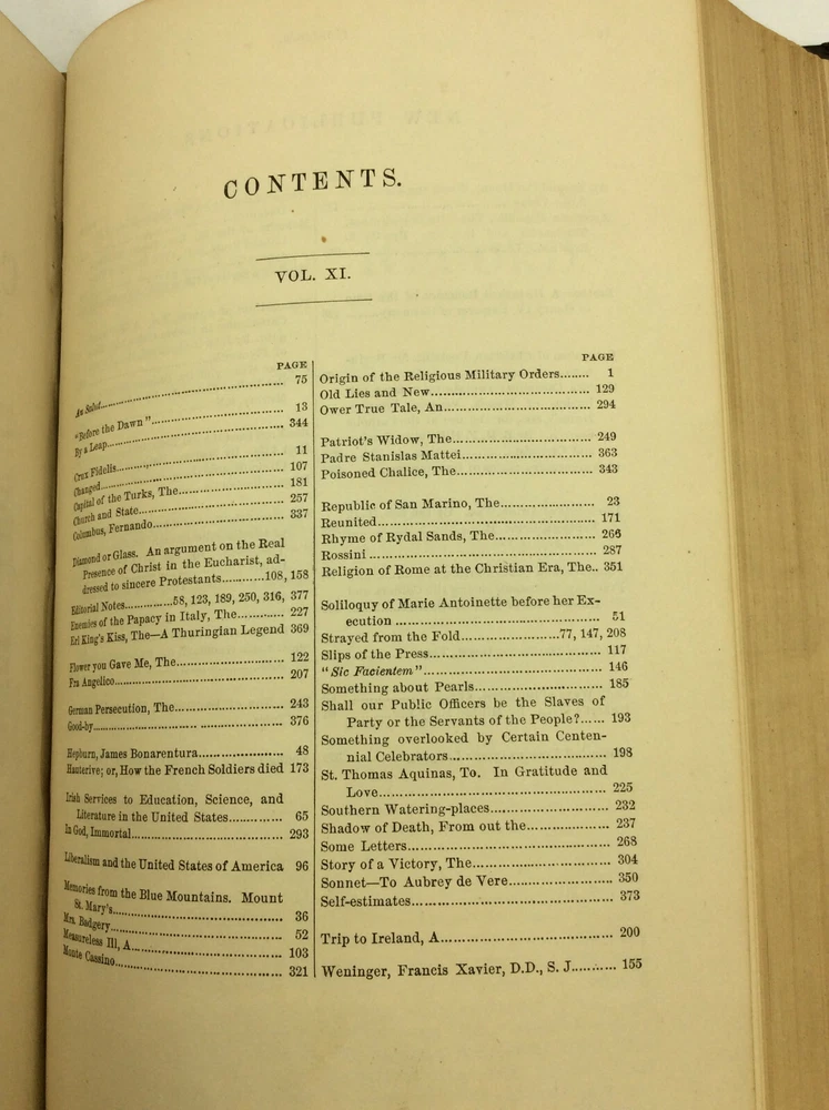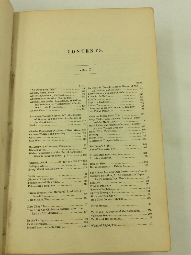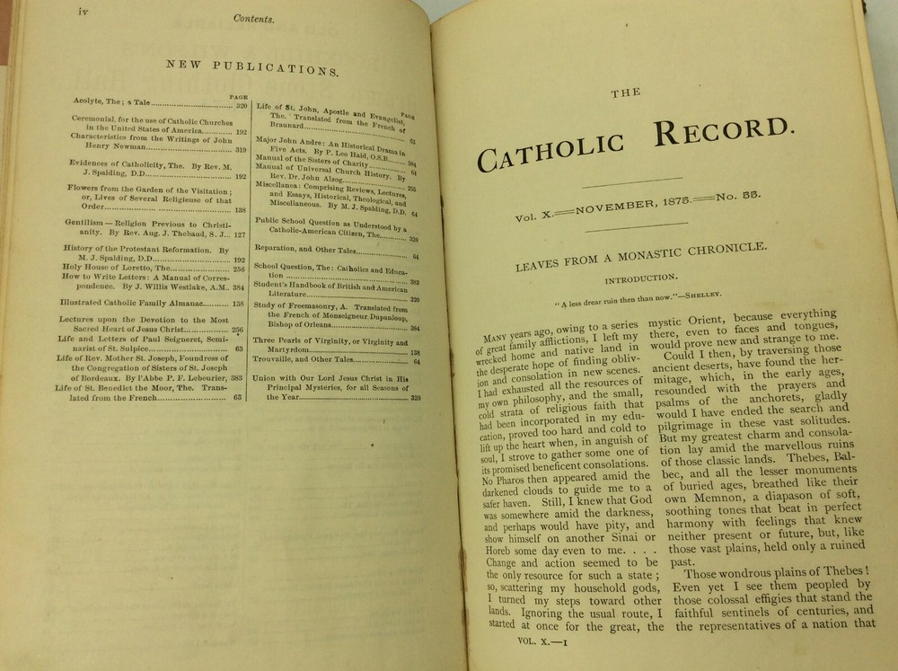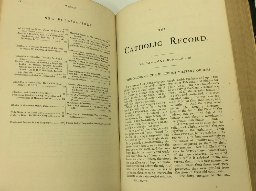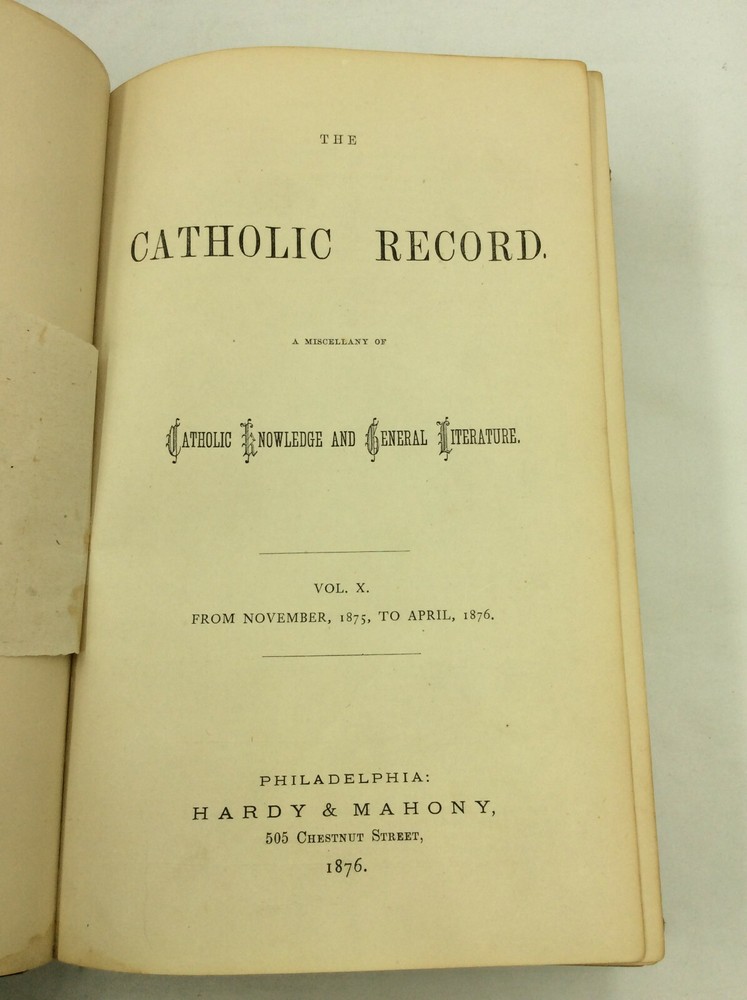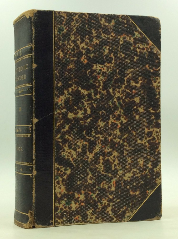 THE CATHOLIC RECORD. A Miscellany of Catholic Knowledge and General Literature. (Vols. X-XI) Philadelphia: Hardy & Mahony, 1876. Leather. 384p; 384p. A hardcover book bound in 3/4 black leather with marbled boards. Good condition. Edges heavily rubbed; small split at the foot of the spine. Top corner of the front free endpaper has been clipped off. Owner inscription on first blank page. Some occasional mild foxing and light stains inside. Faint dampstain on bottom foredge. Otherwise, text clean and binding tight. Item #170880 A bound volume of the Catholic Record containing the monthly issues from November 1875 (no. 55) through October 1876 (no. 66).