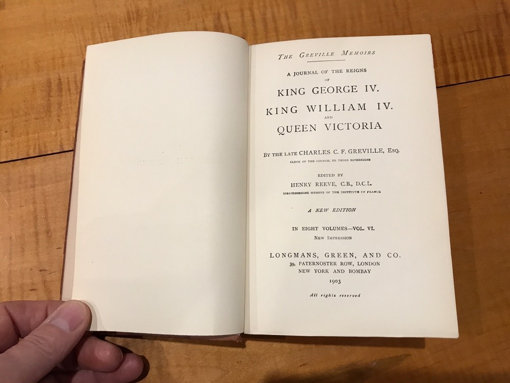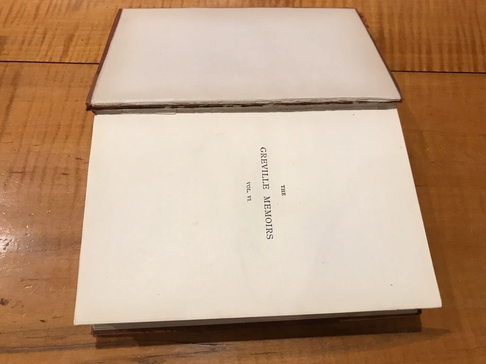 THE GREVILLE MOMOIRS A JOURNAL OF THE REIGNS OF KING GEORGE IV KING WILLIAM IV AND QUEEN VICTORIA A NEW EDITION DATED 1904 BY CHARLES C.F. GREVILLE Edited by HENRY REEVE 4 VOLUMES #2 , #4, #6, & volume #8 Printed in London by Longman’s Green, and company 1/4 BOUND LEATHER GILT TOP EDGES MARBLED END PAPERS ALL 4 VOLUMES ARE CLEAN WITH TIGHT BINDINGS NO RIPS TEARS OR MARKINGS. Just volume 6 has a cracked hinge but still solid and intact. ALL 4 VOLUMES SHOW MODERATE WEAR ON LEATHER SPLINES BUT NORMAL FOR THE AGE. CAN SAY ENOUGH ABOUT HOW EXCEPTIONALLY CLEAN THESE 4 VOLUMES ARE ON THE INTERIOR. LOOK OVER AND SEE ALL 12 PICTURES PLEASE LOOK OVER ALL THE PICTURES I GENERALLY TAKE 12 and USE PICTURE IN PICTURE TO SAVE SPACE AND PROVIDE AS MUCH DETAIL AS POSSIBLE. PLEASE JUDGE CONDITION FOR YOURSELF. I WILL ALWAYS POINT OUT ANYTHING AND DO MY BEST TO DESCRIBE AS MUCH AS POSSIBLE. NO RESERVE NEVER !! I WILL NOT END AUCTIONS EARLY. All the records radio parts pieces paper catalogs & phonograph items we list come from the estate of Dr. James M. Kinney of New Windsor, Maryland, one of the East Coast’s largest record collectors. Do not hesitate to make a reasonable offer on Buy-It-Now items. Your satisfaction is my goal. If you want additional information, or more pictures, please contact me. INVOICING: If you'd like combined shipping rates, or if you'd like any shipping changes (upgraded shipping, insurance, or signature confirmation), PLEASE ASK SHIPPING: INTERNATIONAL SHIPPING: Please do not ask me to circumnavigate custom and duty laws. I will do everything to provide the most economical & safest shipping i possibly can.