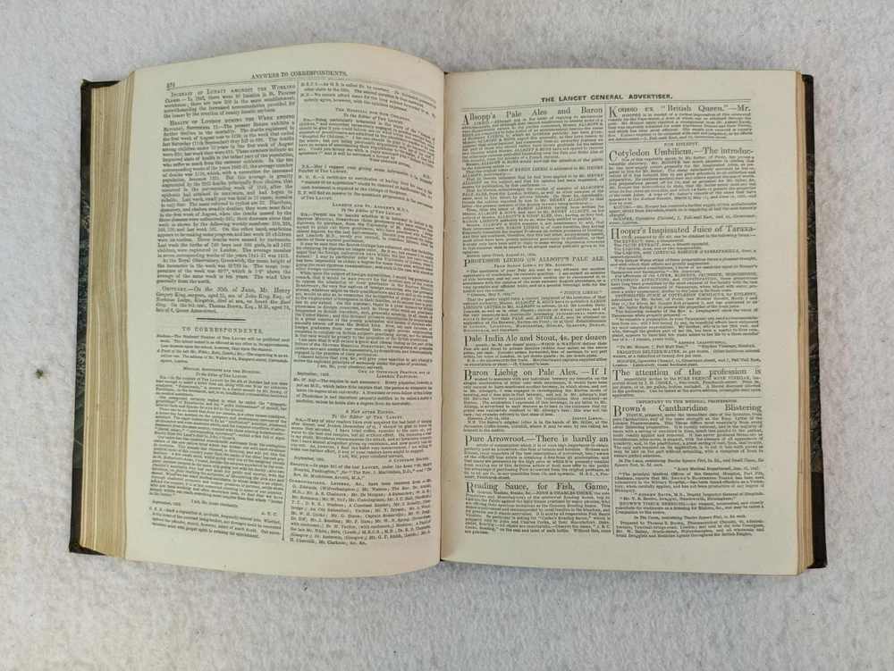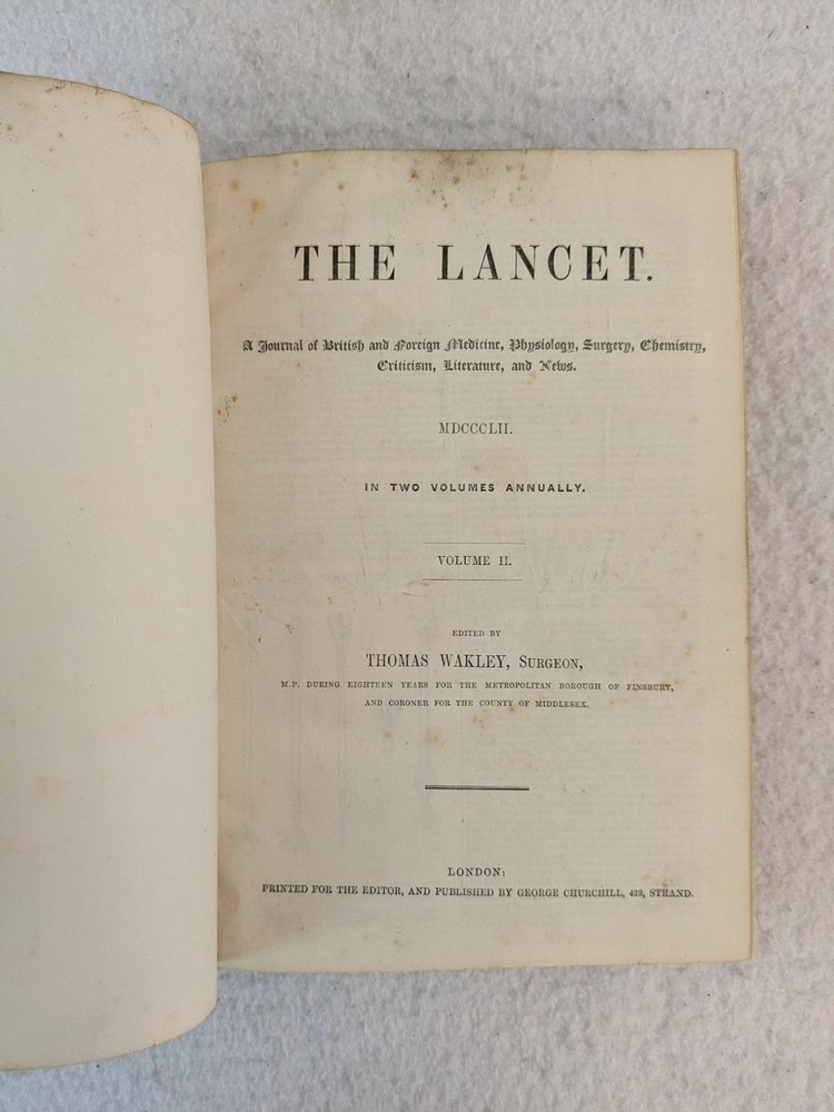 THE LANCET A journal of British and foreign medicine, physiology, surgery, chemistry, criticism, literature and news. 1852 Volume II July 3 - December 25 Published by George Churchill , London In very good condition. Please examine photos for details. Condition: We strive to describe and photograph the condition of every item as accurately as possible. Photos are of the actual item that is being sold. Please examine the photos carefully for any condition details and possible flaws. Best Offers: Items are available for offers after being listed for 30 days. We consider all offers in relation to current market values. We try to respond almost immediately to most offers. Most of our counteroffers are firm but we are open to bargaining. Shipping for US Customers: We combine shipping. All of our orders are packed carefully to prevent damage during shipment. We ship most of our items within 24 hours. Shipping for International Customers: All international orders are shipped via Ebay's Global Shipping Program. Contact Us: We are available 7 days a week and are happy to answer any questions you may have. Attention Sellers - Get Templates Image Hosting, Scheduling at Auctiva.com.