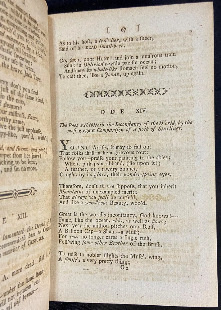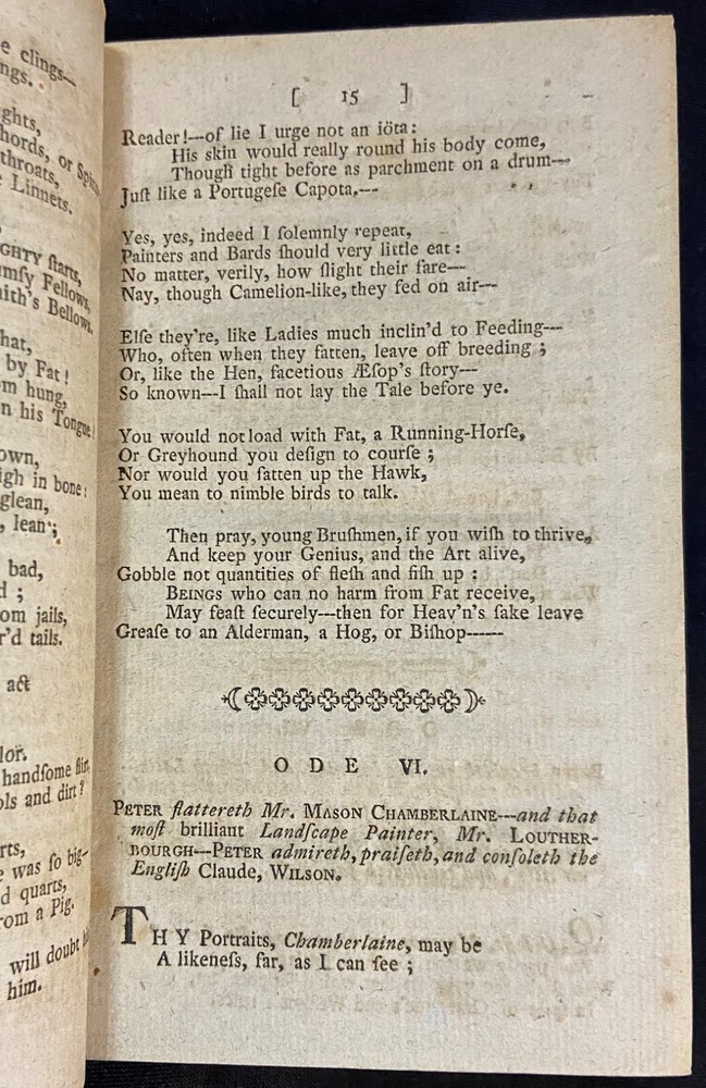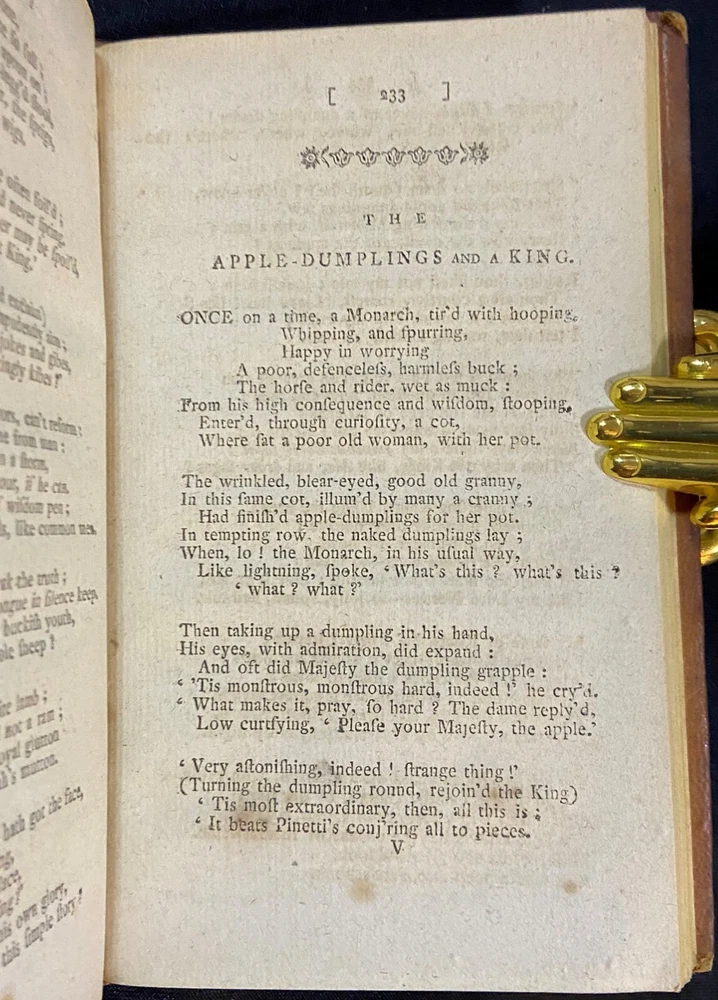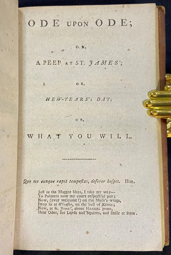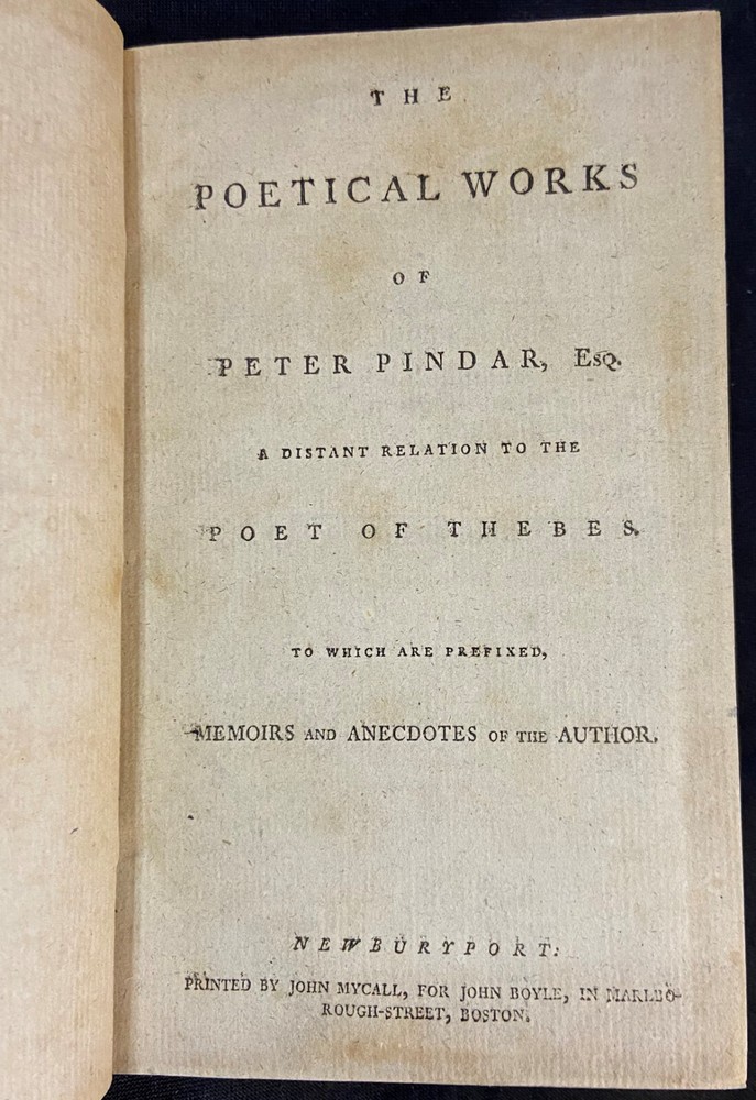 Rare original early American imprint of, "The Poetical Works of Peter Pindar." There is no printed publishing date, but this edition is dated to about 1790 by Evans (Proposals for printing were published in the Essex journal, Newburyport, Sept. 29 and Nov. 10, 1790). The book is overall in good antiquarian condition with some typical signs of wear and age. The covers have some mild wear. There is cracking to the leather joints; however, the binding of the book is still good and sound. The interior is toned from age with some occasional light foxing. Along with that there may be the occasional page with some kind of other minor imperfection, such as a creased corner, small chip or tear, minor marking, light bit of soiling or grubbiness, etc. The book measures approximately 6 3/4 inches by 4 1/8 inches and is 314 pages long. Please look at all of the photos to further note the condition.