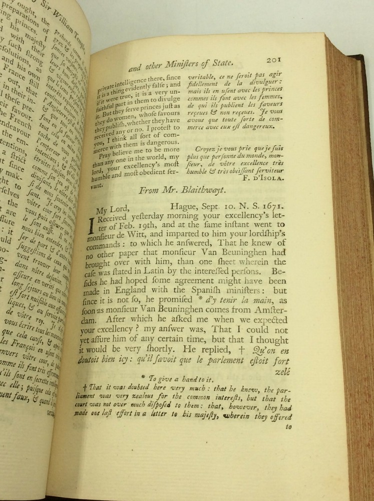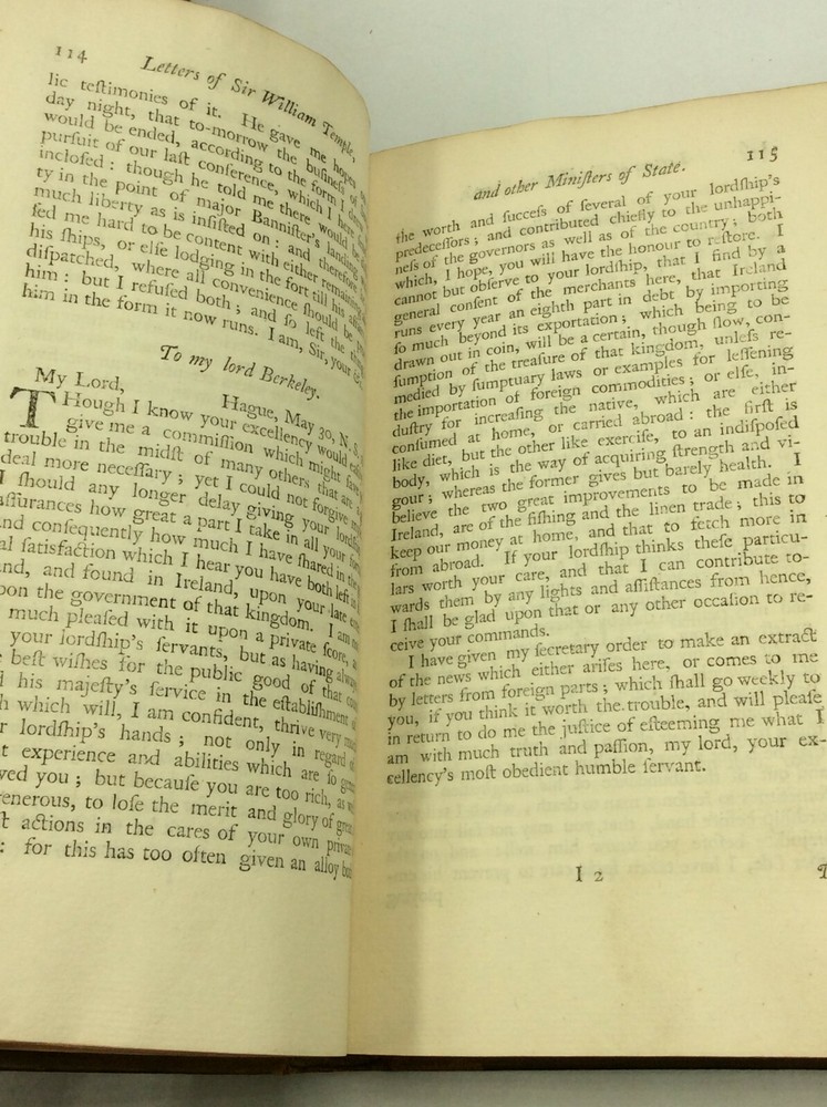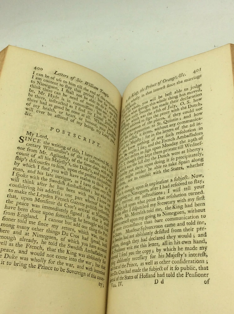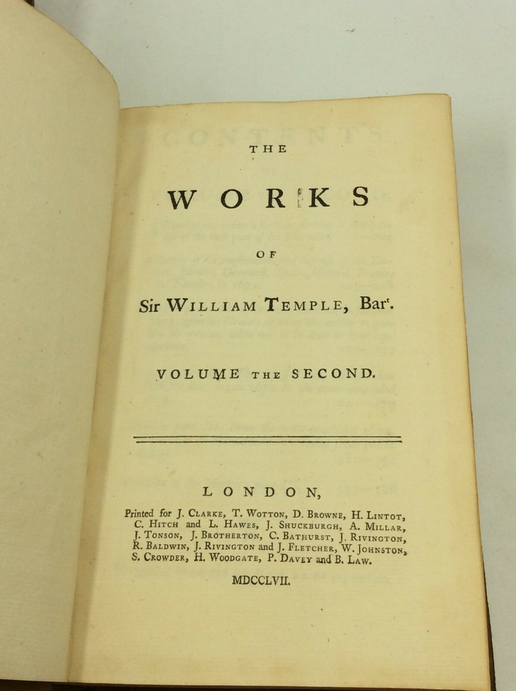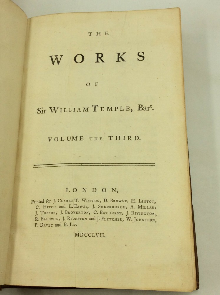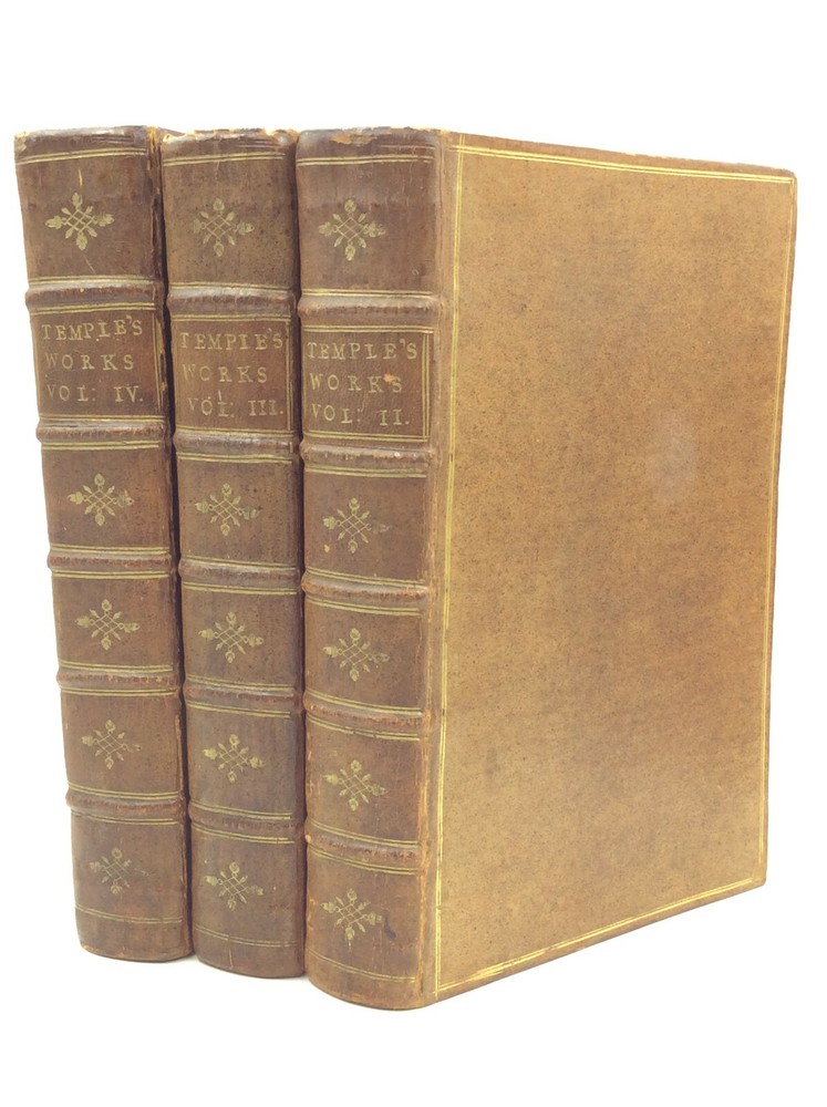 William Temple THE WORKS OF SIR WILLIAM TEMPLE, Bart., Volumes II-IV London: J. Clarke, T. Wotton, D. Browne, et al. 1757. Leather. 3 vols. 568p; 544p; 466p; index. A set of three hardcover books bound in full 18th-century paneled calf. Very good condition for their age! Edges and spines lightly chafed, but the gilt detailing on the spines is still vivid. Corners lightly bumped. Bookplate and pencil notation inside each volume's front cover. Empty paper sleeve inside volume III's back cover. Otherwise, text unmarked and binding secure across the set. Item #176388 Includes only volumes 2, 3, and 4; LACKS volume 1.