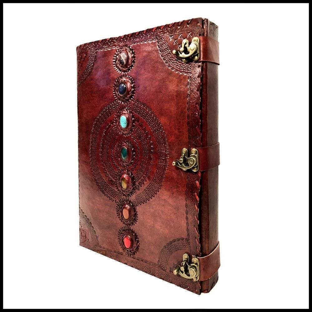 TUZECH Chakra Journal Handmade Huge Leather Bound Journal for Women and Men Book of Shadows Diary College Book Poetry Sketch Spell Book - 1.8 FEET - Giant Leather Diary (22 Inches) 240 Pages Product Details Brand: TUZECH Color: Brown Theme: Book Sheet Size: A4 Pages: 200 Pages Cover Material: Real Leather Style: Vintage Ruling Type: Plain Special Feature: Lock Product Dimensions: 22"L x 14"W x 1.5"Th Manufacturer: The Immart global Brand: TUZECH Item Weight: 10.6 ounces Product Dimensions: 22 x 14 x 1.5 inches Item model number: GLOBAL001 Is Discontinued By Manufacturer: No Color: Brown Cover Material: Real Leather Material Type: Leather Number of Items: 1 Size: 22 Inches Ruling: Plain Sheet Size: A4 Paper Finish: Ultra Smooth Manufacturer Part Number: GLOBAL001 Date First Available: April 9, 2019 Handcrafted leather journal dimension : 22(H) x 14(L) x 1.5(W) inches , ( 1.8 FEET HIGH) also available in different sizes. Our handmade artisan leather journals are crafted from genuine leather. The Chakra coloured gem stones and brass latch give this notebook a magical spell book feel. Organizer has three vintage style bronze C-Lock to keep your notebook safe and organizable. Being hand-made from 100% natural leather, our journals can vary in look & shade producing a unique item, no two are quite the same. Planner contains recycled cotton blank pages which are perfect for mini notes. Handcraft leather diary is an awesome find for book lover or literature gift. Suitable for both men or women, this daily travelers notebook is a perfect present for an avid writer. Ideal to give for birthday, valentines, graduation or wedding anniversary. Pen out your thoughts, sketch or keep notes in these exquisitely crafted pieces of art. Designed to stand out from the crowd. Vintage and antique appearence. This old-fashioned leather has an amazing smell! More than just a diary / notebook, your seven chakra embossed leather journal is sure to earn a place as your most prized possession. Naturally tanned with oil, a special keepsake for your thoughts, plans & ideas.