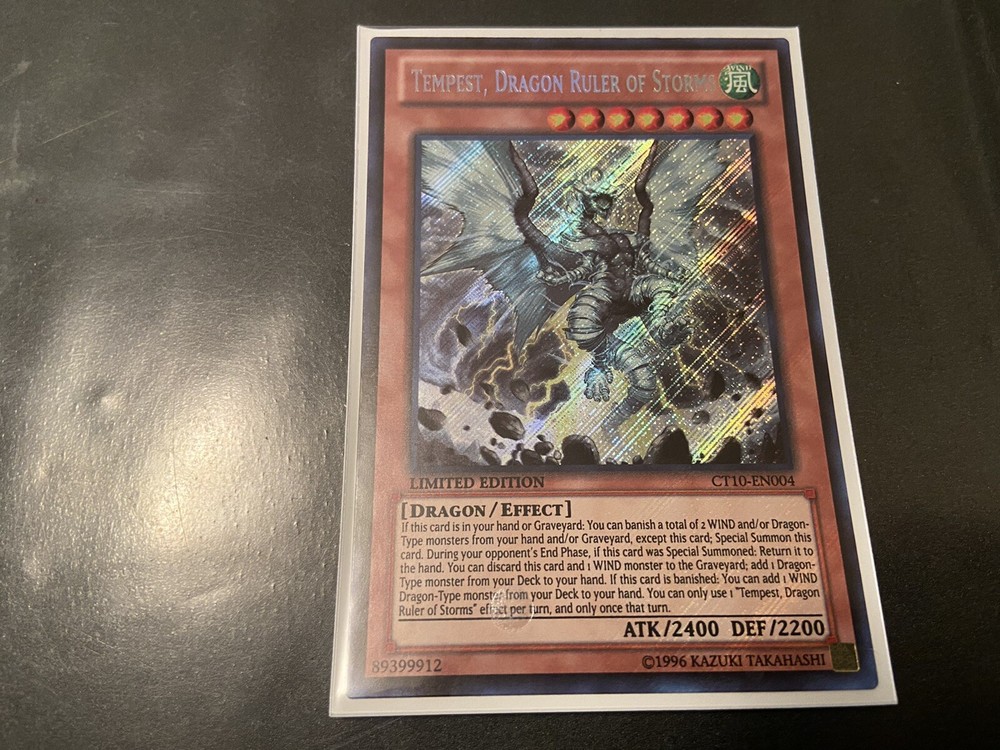 The Tempest, Dragon Ruler of Storms Secret Rare Limited Edition CT10-EN004 card is a highly sought-after collectible for Yu-Gi-Oh! TCG enthusiasts. This English-language card, part of the 2013 Collectors Tins set, features a powerful Wind-type Dragon character with impressive attack and defense stats of 2400 and 2200, respectively. Produced by Konami in the United States, this holo-finished card with a mint condition is a valuable addition to any collector's deck. The limited edition nature of this card makes it a special and sought-after piece for fans of the game.