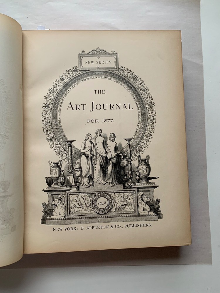 The Art Journal for 1877 . VOL 3 NY Published by Appleton & co 1877 D. A ppleton and Co. began The Art Journal in 1875 as an American edition of the older London-based ART JOURNAL. It included original content as well as content from the London journal. The journal was taken over by Patterson and Neilson around 1881, and ceased publication in 1887. Over all in great condition, some scratches and scuffs on cover, all pages in perfect condition.