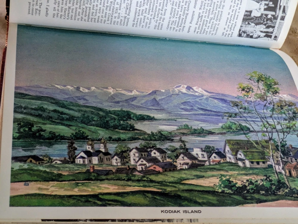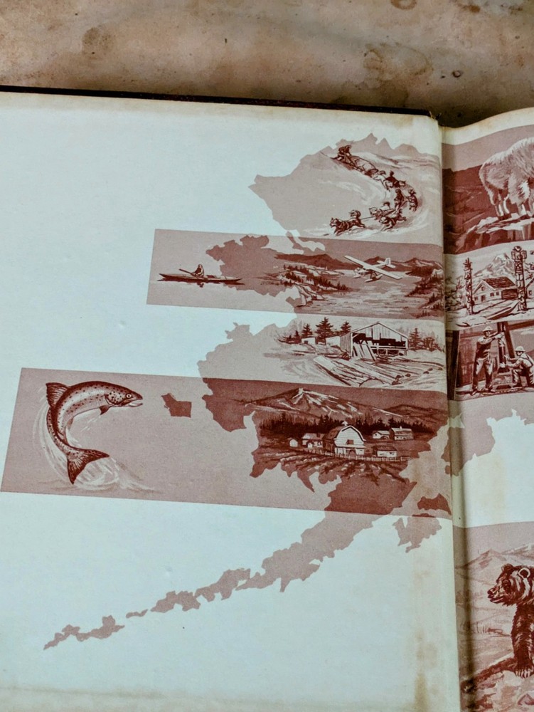 Pencil writing inside front cover. Rounded cover corners. Color of leather has faded. See pics. Very interesting beautiful outdoors book. Delve into the rich history and diverse culture of Alaska with this leather-bound edition of "The Alaska Book" from 1960. Published by encyclopedia Britannica, the book offers an in-depth look at Alaska's past and present, enveloped in the elegance of a timeless leather binding. It stands as a testament to the enduring appeal of print media, exploring various topics that cater to both bibliophiles and enthusiasts of Alaskan heritage.