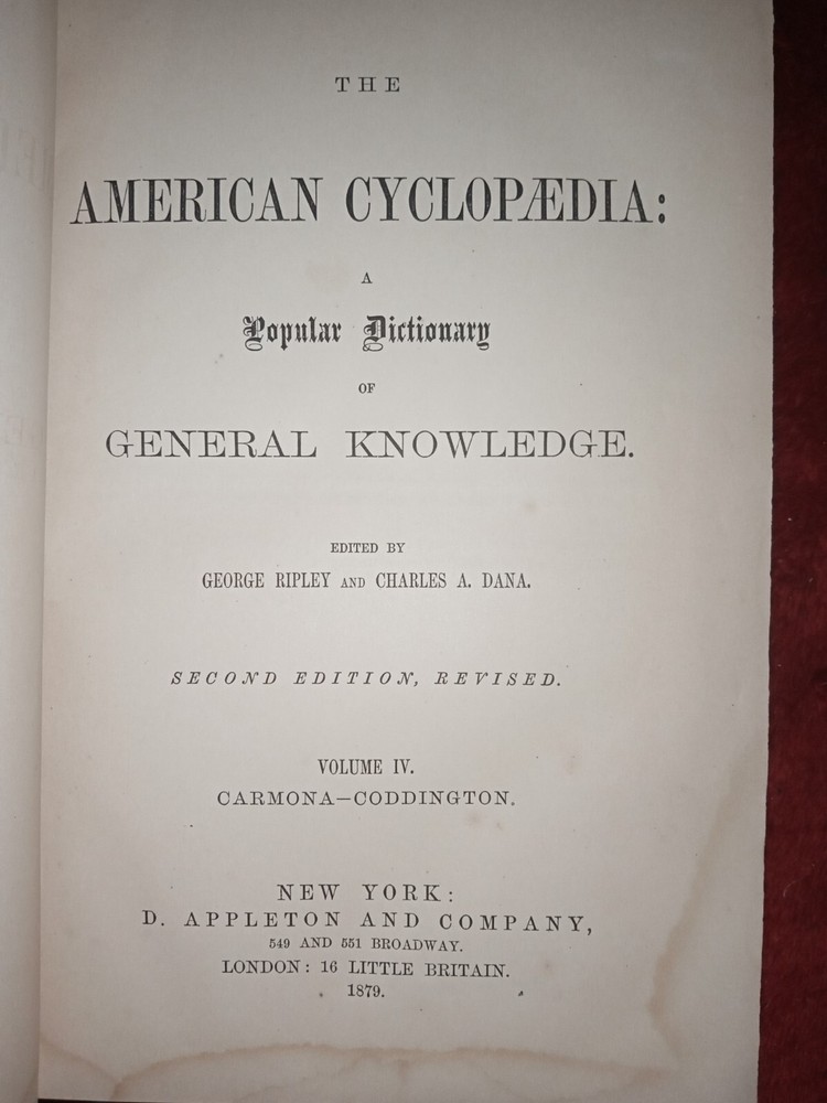 The American Cyclopedia Popular Dictionary Of General Knowledge 1858,1878 Published By Appleton & Co. 2nd Edition Revised Vol. IV Edited By George Ripley & Charles A. Dana. See Pictures Provided For T...