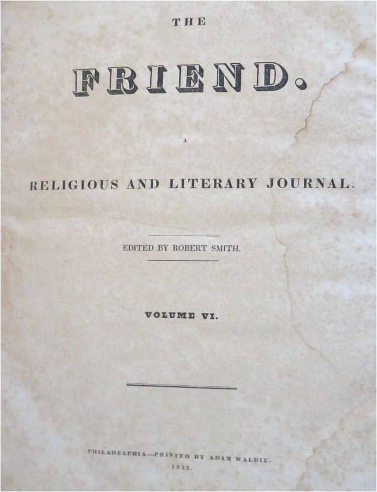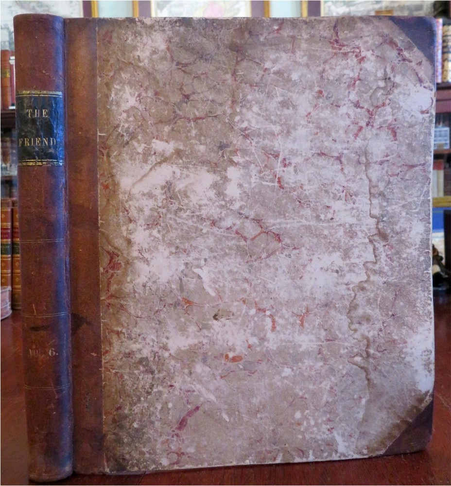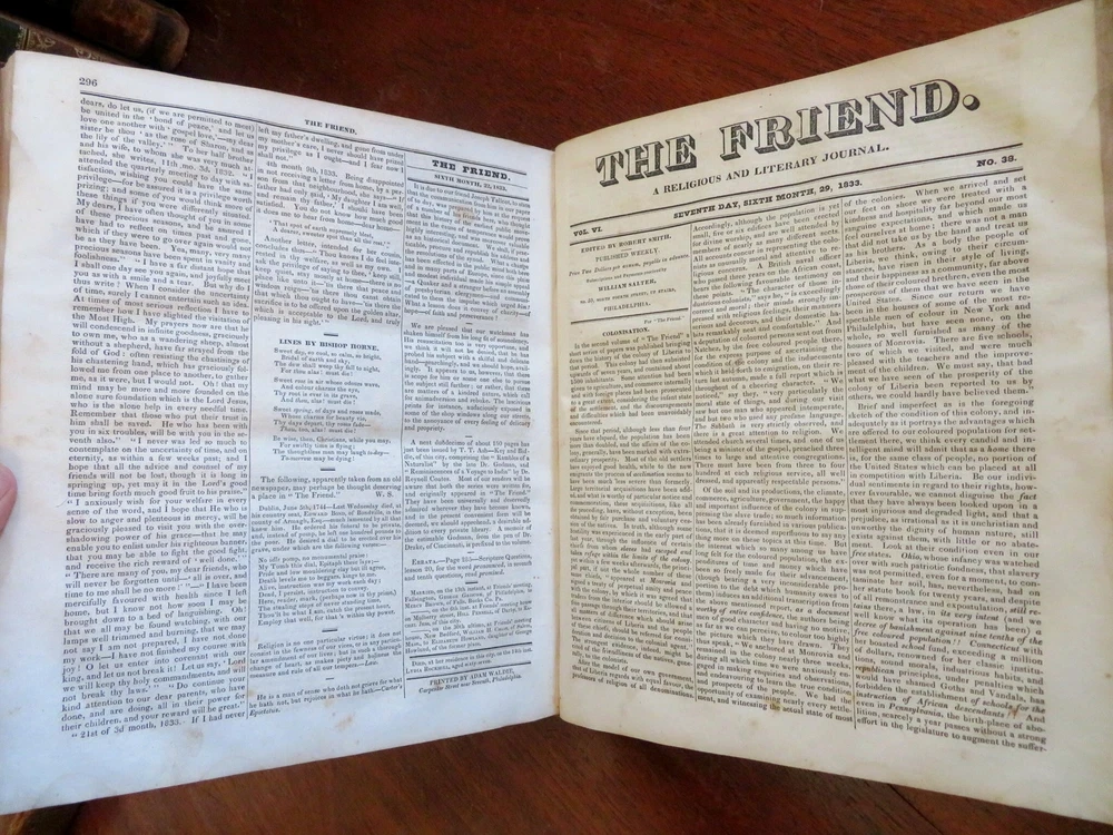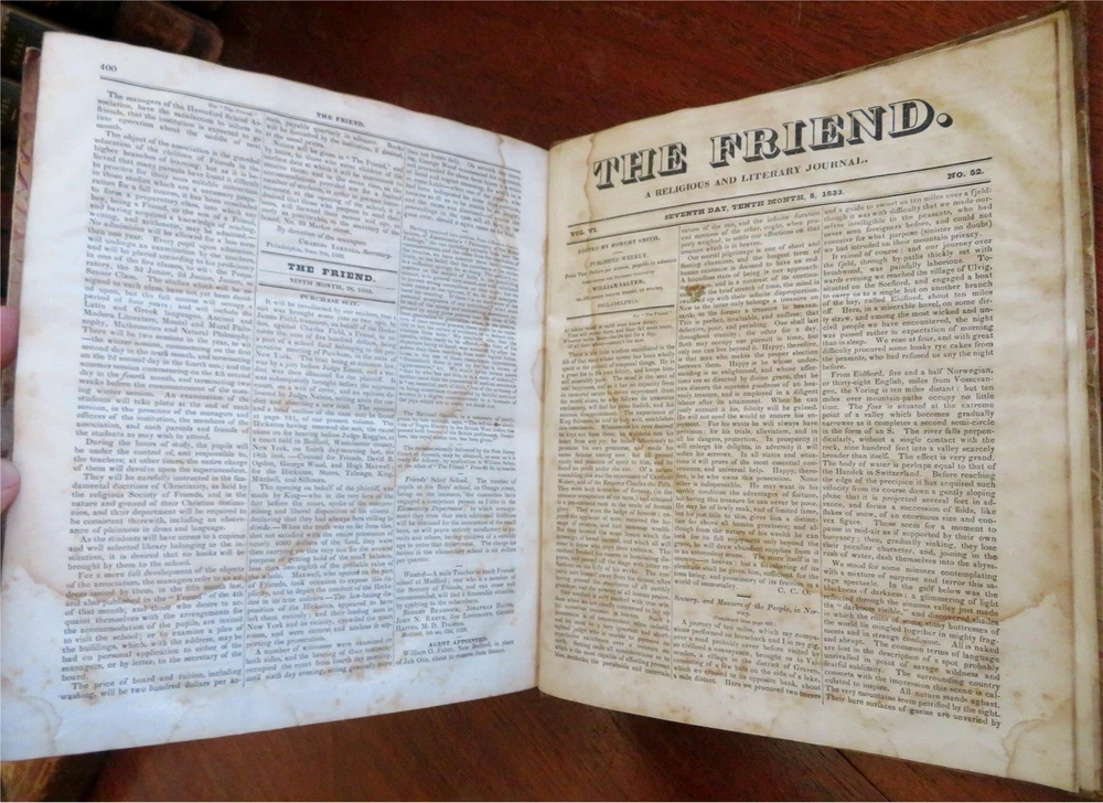 The Friend American Religious & Literary Journal 1833 Robert Smith leather book The Friend American Religious & Literary Journal 1833 Robert Smith leather book (Old Books, 19th Century Books, Leather Books, Americana, Religion, Christianity, Literature, Periodicals). The Friend: A Religious and Literary Journal, ed. by Robert Smith. Published 1833, Philadelphia by Adam Waldie. 416 pages. Text in English. Index at front. Volume begins with Oct. 13, 1832 issue and continues on weekly until Oct. 5, 1833, so one consecutive year of issues. Appears to be consecutive and uninterrupted, but not collated page by page. Each issue is 8 pp. Attractive antiquarian 1/2 leather binding, smooth spine, gilt bands, gilt title lettering on contrasting black leather label, marbled covers. Book is physically old and shows some signs of handling and time. Binding gently age worn but still appealing, leather and joints slightly rubbed but still supple, remains overall very attractive as an object. Text block paper is well age toned as typical, moderate to heavy old damp staining, internally book remains mostly tight and sound. Still attractive on the shelf. Book displays a unique age patina, any age flaws seem easy to overlook or forgive. Please review photos for more detailed attempt to present this rare book as it survives. We often over-describe any flaws that many sellers would not even bother to mention since most people would overlook them as minor and unworthy of comment. Many people tell us the books they receive from us are nicer in person than it appears on the screen. We want you to be clear about what you are buying, so we take many photos and try to describe it clearly. Book Measures c. 11 1/4" H x 9 1/2" W. [B5026].