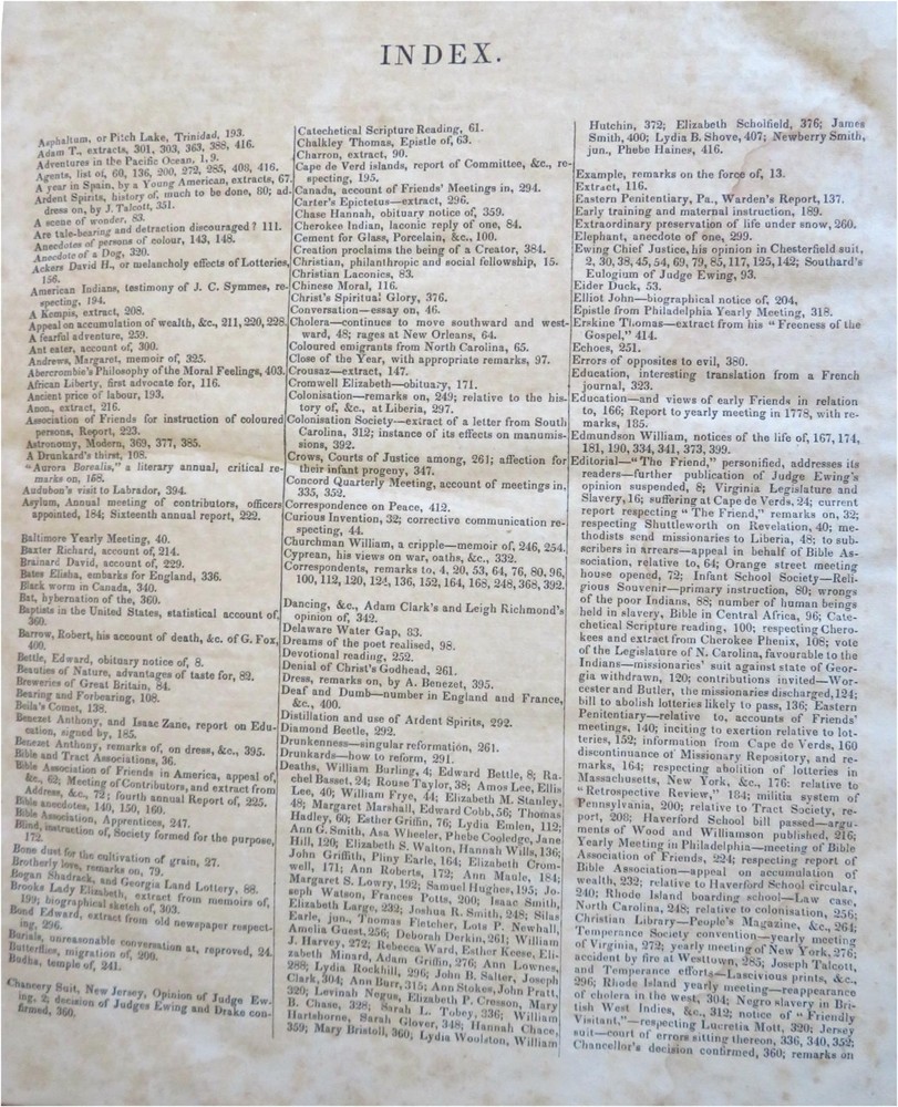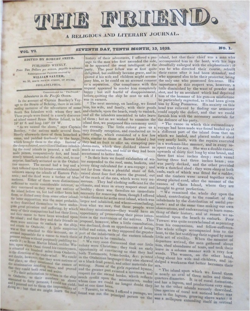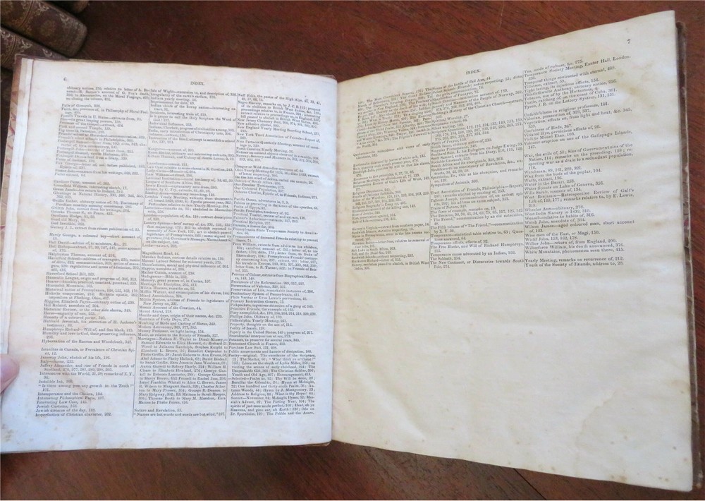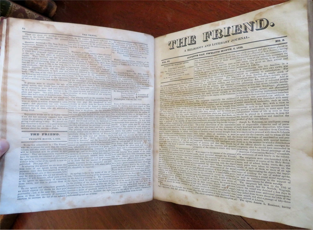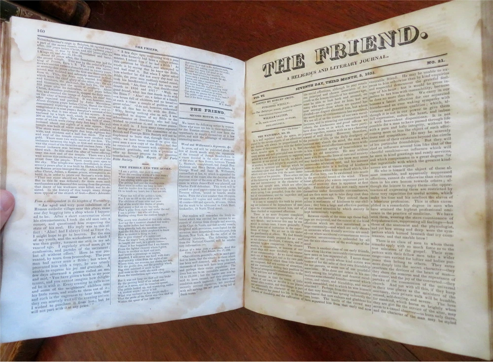 The Friend American Religious & Literary Journal 1833 Robert Smith leather book The Friend American Religious & Literary Journal 1833 Robert Smith leather book (Old Books, 19th Century Books, Leather Books, Americana, Religion, Christianity, Literature, Periodicals). The Friend: A Religious and Literary Journal, ed. by Robert Smith. Published 1833, Philadelphia by Adam Waldie. 416 pages. Text in English. Index at front. Volume begins with Oct. 13, 1832 issue and continues on weekly until Oct. 5, 1833, so one consecutive year of issues. Appears to be consecutive and uninterrupted, but not collated page by page. Each issue is 8 pp. Attractive antiquarian 1/2 leather binding, smooth spine, gilt bands, gilt title lettering on contrasting black leather label, marbled covers. Book is physically old and shows some signs of handling and time. Binding gently age worn but still appealing, leather and joints slightly rubbed but still supple, remains overall very attractive as an object. Text block paper is well age toned as typical, moderate to heavy old damp staining, internally book remains mostly tight and sound. Still attractive on the shelf. Book displays a unique age patina, any age flaws seem easy to overlook or forgive. Please review photos for more detailed attempt to present this rare book as it survives. We often over-describe any flaws that many sellers would not even bother to mention since most people would overlook them as minor and unworthy of comment. Many people tell us the books they receive from us are nicer in person than it appears on the screen. We want you to be clear about what you are buying, so we take many photos and try to describe it clearly. Book Measures c. 11 1/4" H x 9 1/2" W. [B5026].