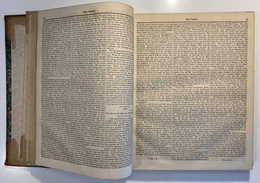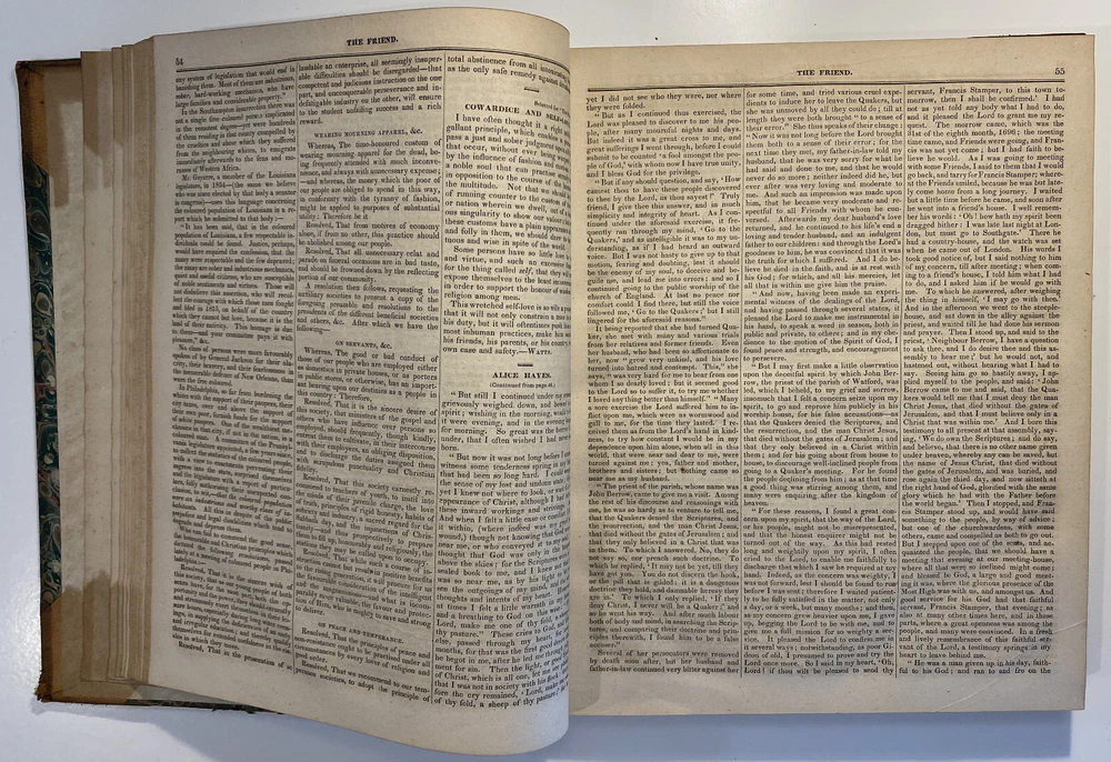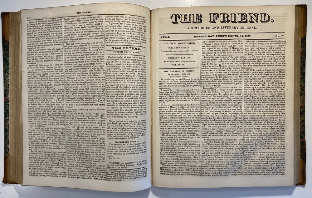 Title: The Friend. A Religious and Literary Journal. Volume X. Editor: Robert Smith Printer: Adam Waldie, Philadelphia Year: 1836-1837 Details: Volume 10, comprising Vol. X., No. 1 (“Seventh Day, Tenth Month, 8, 1836”) to No. 52 (“Seventh Day, Ninth Month, 30, 1837”). With index. Topics include the Adelphi school, American Indians, the African slave trade and Texas, the Association of Friends for the instruction of coloured persons, Elisha Bates, Richard Baxter, Robert Barclay, Solomon Bayley, Catherine E. Beecher, the Beaconites, the Bible Association of Friends in America, crabs, Nathaniel C. Crenshaw, colonization in Liberia, coloured people of Pittsburg and Cincinnati, emancipation in the West Indies and John Eliot, the apostle of the Indians [6], 416pp.; 11 x 9.5 in.
