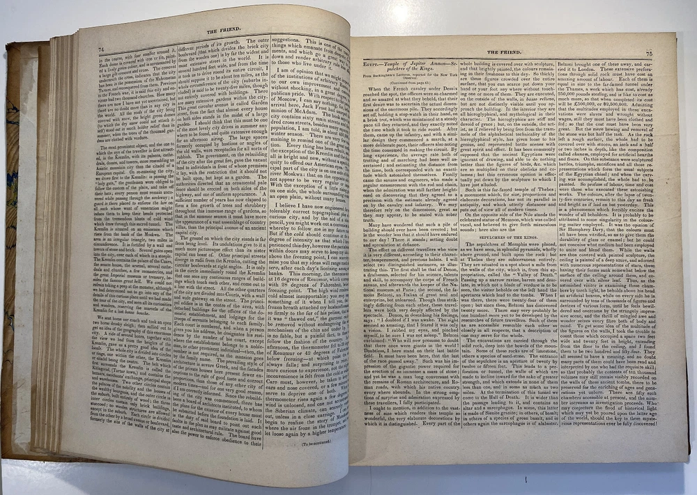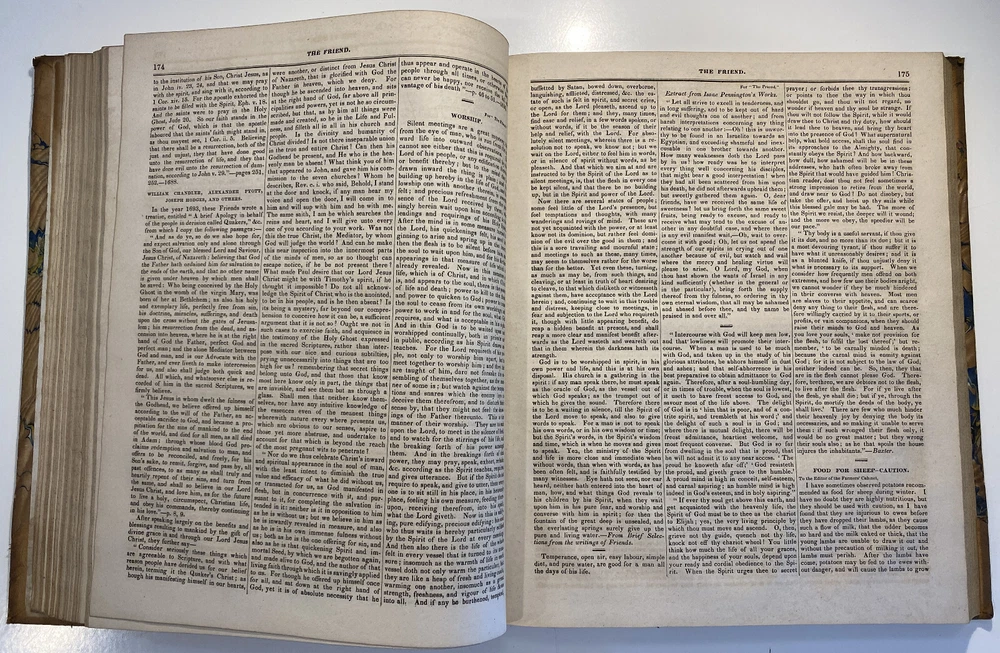 Title: The Friend. A Religious and Literary Journal. Volume XII. Editor: Robert Smith Printer: Adam Waldie, Philadelphia Year: 1838-1839 Details: Volume 12, comprising Vol. XII, No. 1 (“Seventh Day, Tenth Month, 6, 1838”) to No. 52 (“Seventh Day, Ninth Month, 28, 1839”). With index. Topics include Artesian wells, the African slave trade, the remarkable account of Laura Bridgeman, Sarah Bowson, Nathaniel Bowditch, the state of morals in Boston, bees, Buckingham’s lectures, the cultivation of Brussels sprouts, Buxton Fowell’s book on the African slave trade, Richard Claridge, the Cherokees of North Carolina, the American Peace Society, the deaf and dumb, and the sagacity of doves. [6], 416pp.; 11 x 9.5 in.
