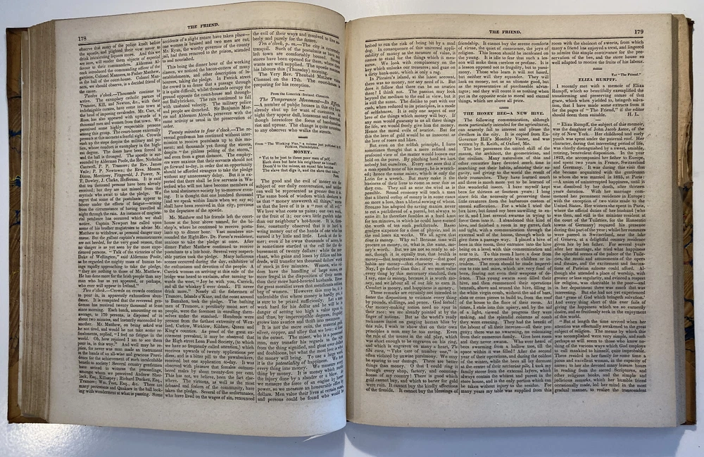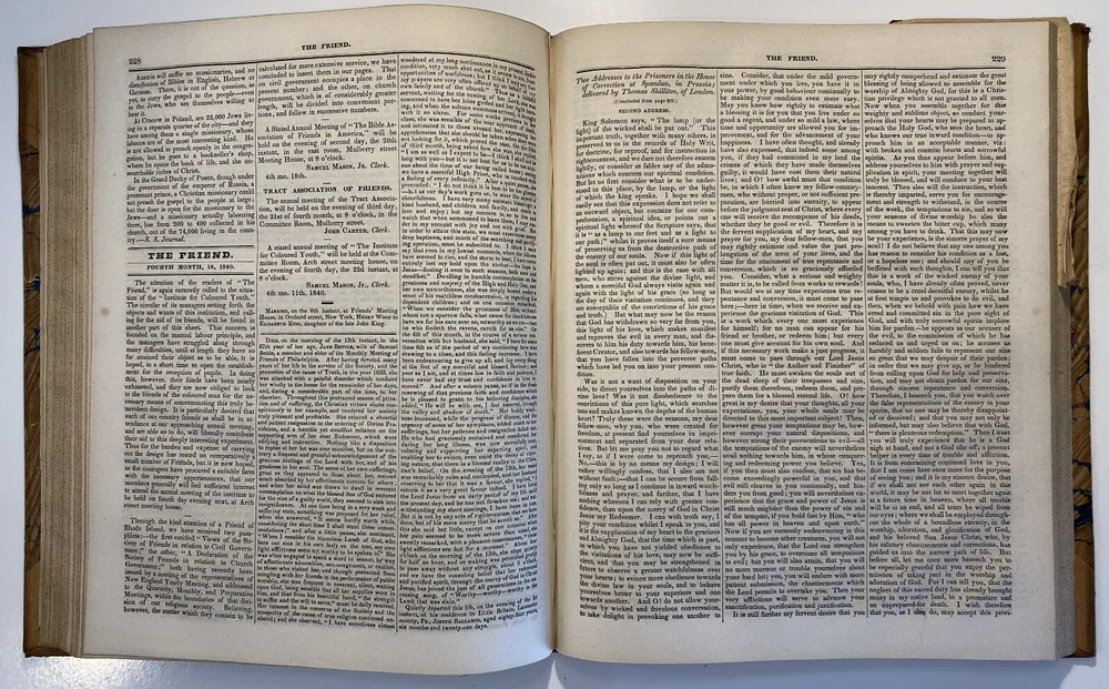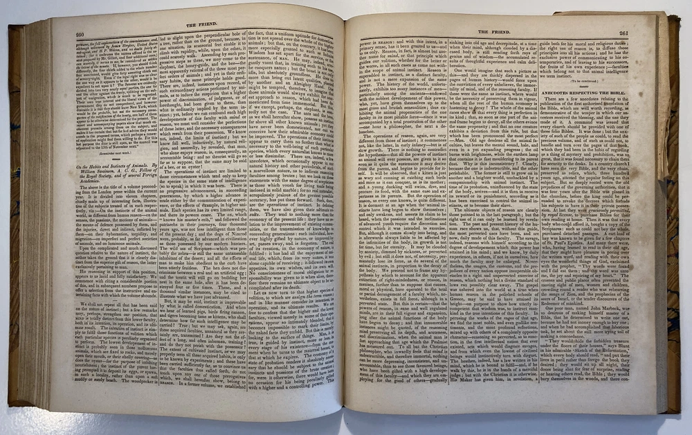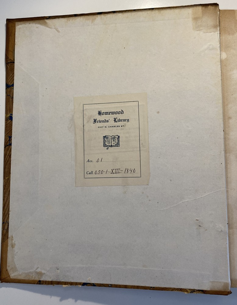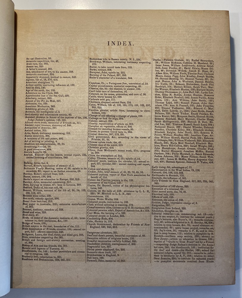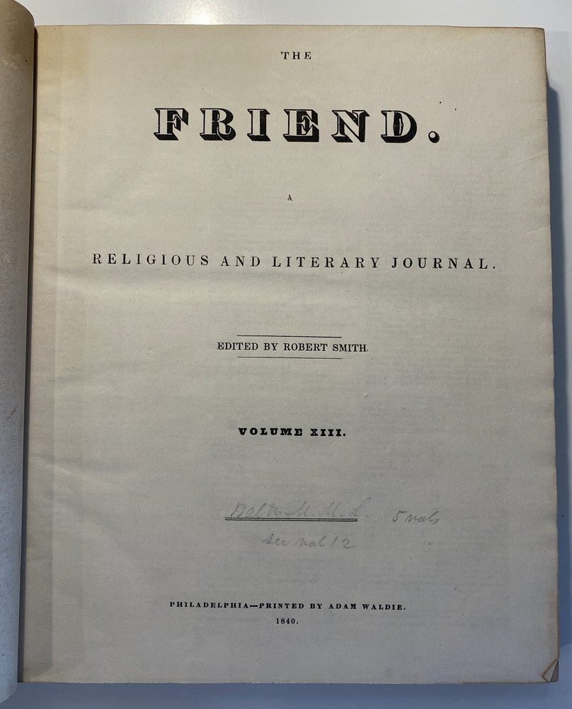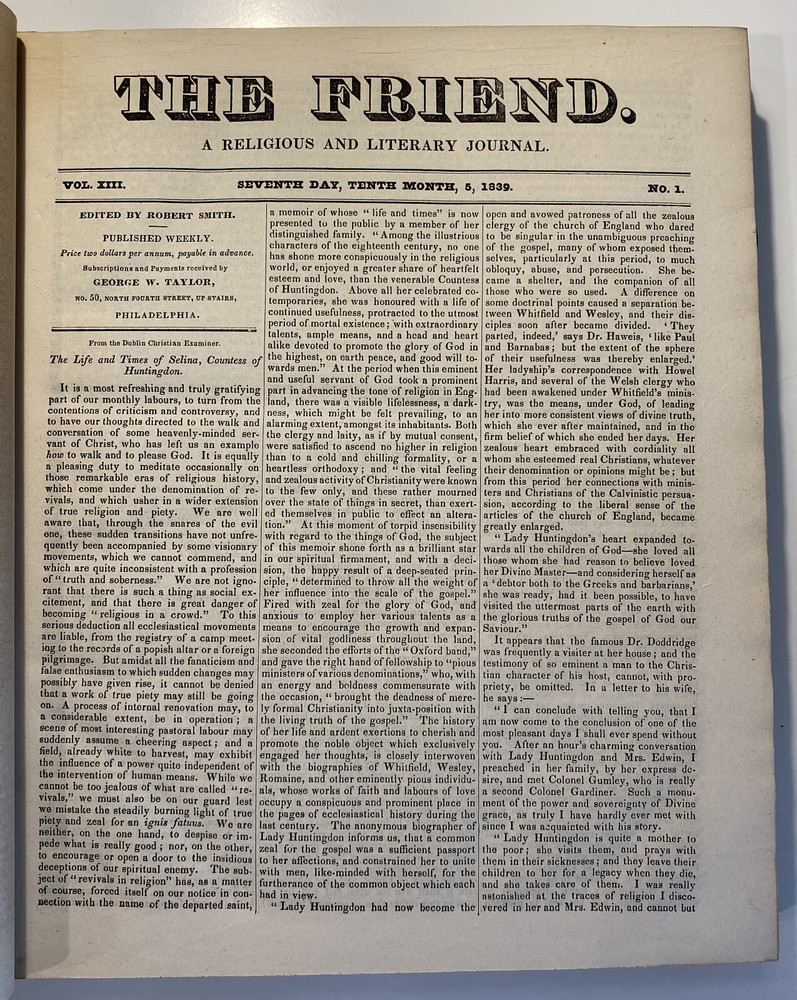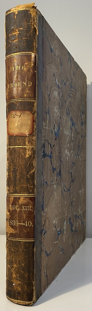 Title: The Friend. Religious and Literary Journal. Volume XIII. Editor: Robert Smith Publisher: Adam Waldie, Philadelphia Year: 1839-1840 Details: Comprising Vol. XIII, No. 1 (October 5, 1839) through Vol. XIII, No. 52 (August 26, 1840). With index. Topics include American aborigines, the enervating influence of ancient spirits, the intelligence of animals, an anti-slavery and colonization society, the decision in favor of the captives of the Amistad, bread from beet-root, an exhortation to brotherly love, the Chinese opium trade, cotton and slavery, instruction to “coloured people,” the beautiful expression of a “deaf and dumb person,” “dull boys,” emancipation in the West Indies, and the execution of a criminal. [6], 416pp.; 11 x 9.5 in.