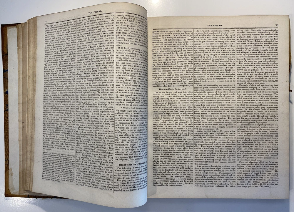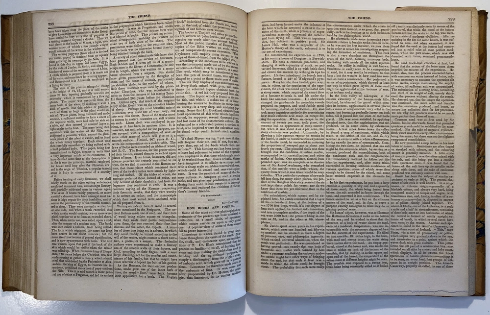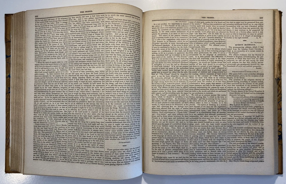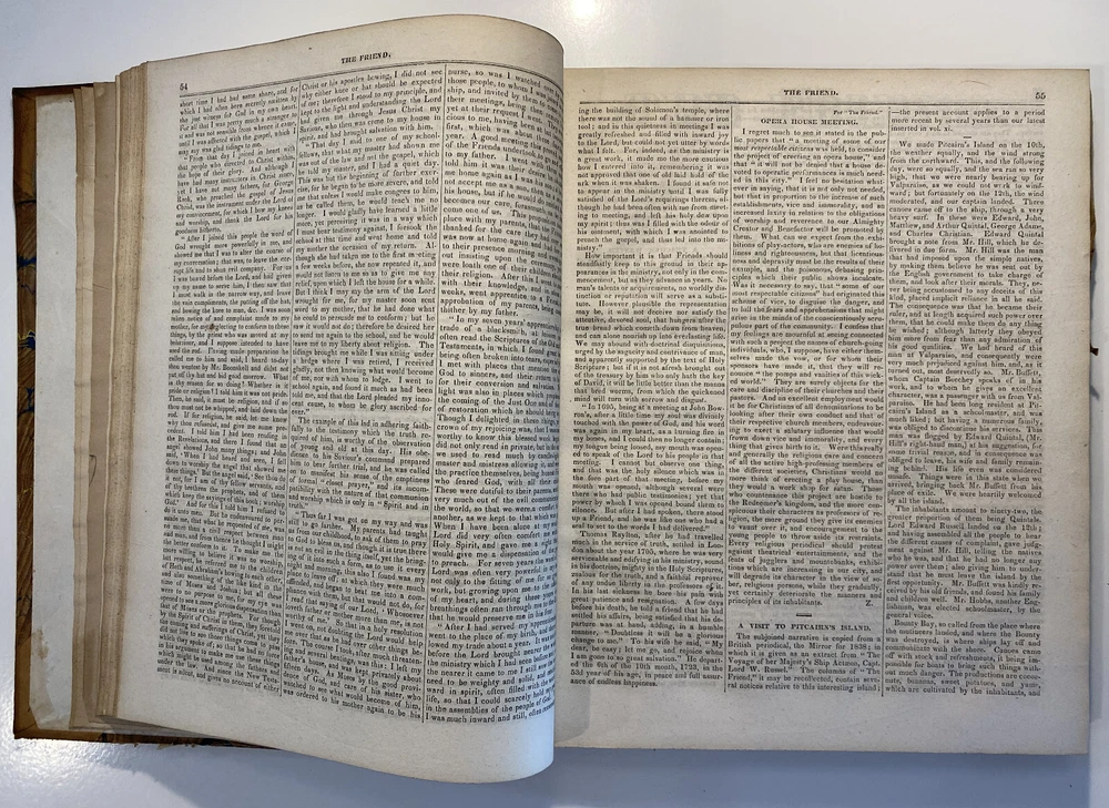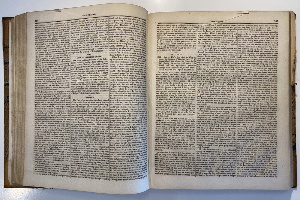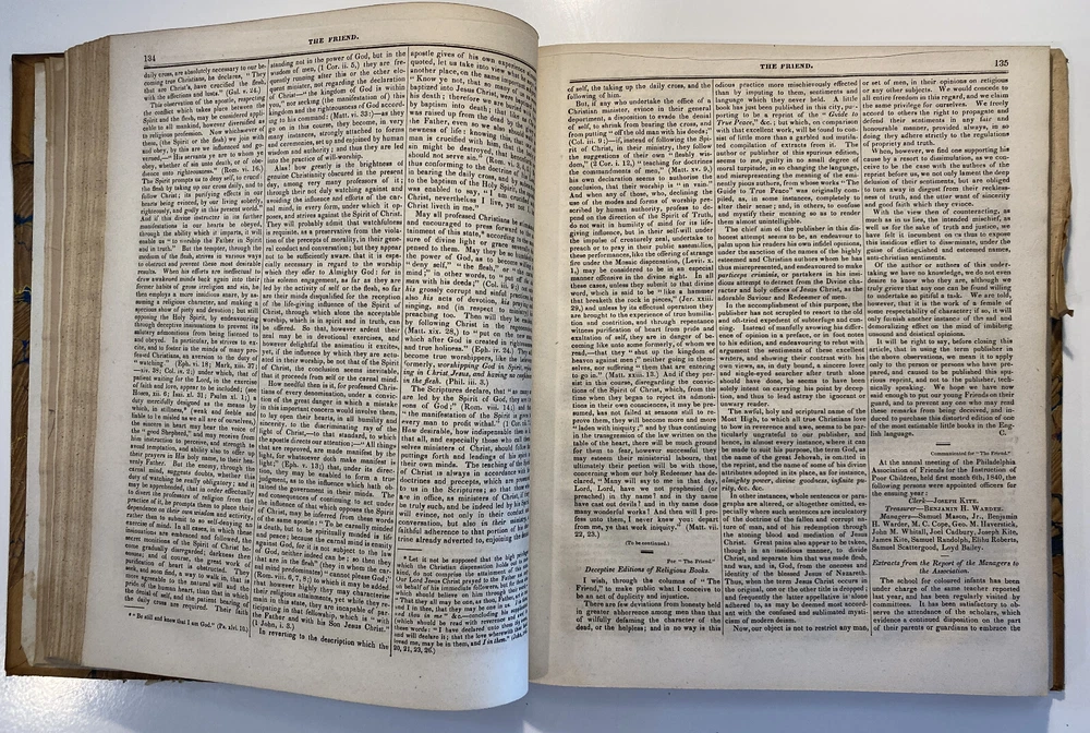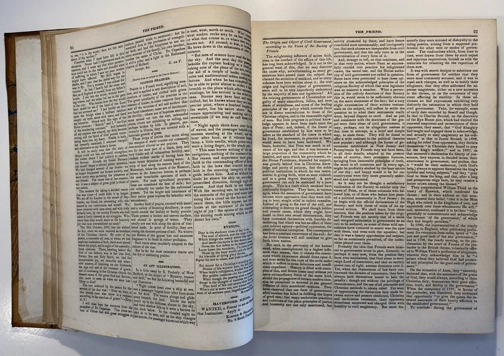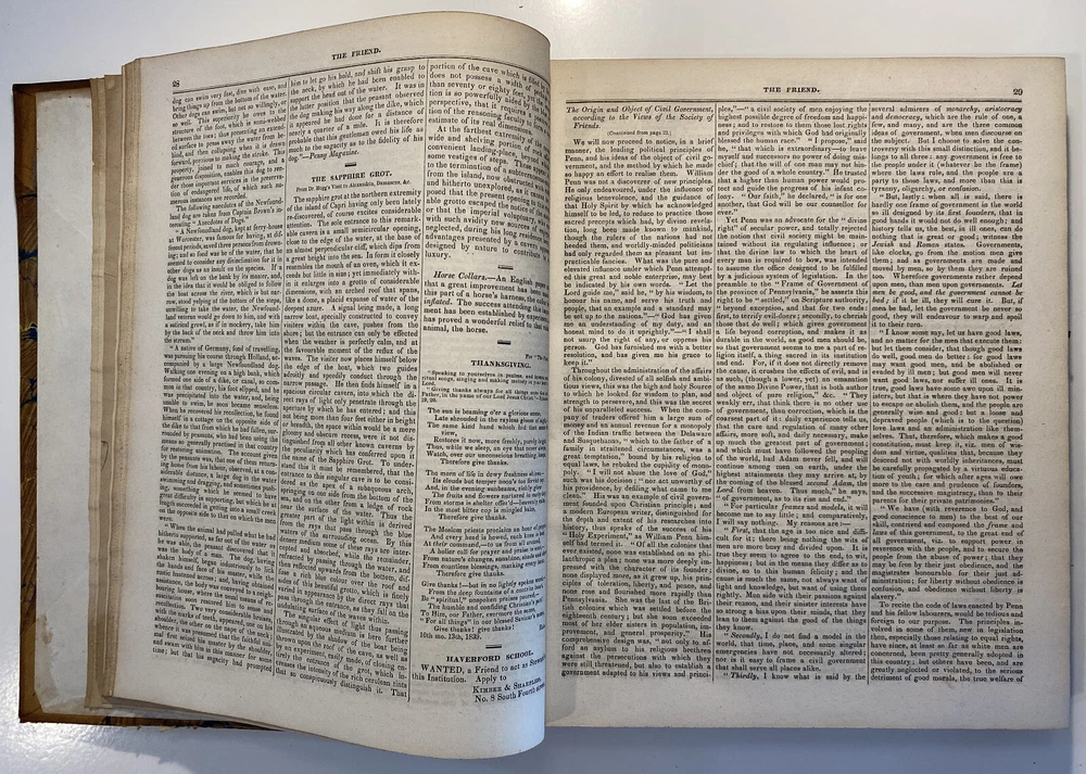 Title: The Friend. Religious and Literary Journal. Volume XIII. Editor: Robert Smith Publisher: Adam Waldie, Philadelphia Year: 1839-1840 Details: Comprising Vol. XIII, No. 1 (October 5, 1839) through Vol. XIII, No. 52 (August 26, 1840). With index. Topics include American aborigines, the enervating influence of ancient spirits, the intelligence of animals, an anti-slavery and colonization society, the decision in favor of the captives of the Amistad, bread from beet-root, an exhortation to brotherly love, the Chinese opium trade, cotton and slavery, instruction to “coloured people,” the beautiful expression of a “deaf and dumb person,” “dull boys,” emancipation in the West Indies, and the execution of a criminal. [6], 416pp.; 11 x 9.5 in.