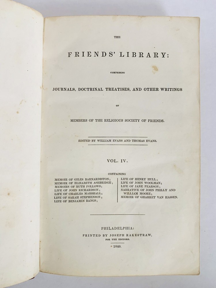 The Friends' Library: Comprising Journals, Doctrinal Treatises, and Other Writings if Members of the Religious Society of Friends. Edited by William Evans and Thomas Evans Volume IV Hardcover Full Leather Binding with red and black leather labels and gilt titling to spine Marble end papers 480 pages Containing - Memoir of Giles Barnardiston - Memoir of Elizabeth Ashbridge - Memoirs of Ruth Follows - Life of John Richardson - Life of Charles Marshall - Life of Sarah Stephenson - Life of Benjamin Bangs - Life of Henry Hull - Life of John Woolman - Life of Jane Pearson - Narrative of John Philly and William Moore - Memoir of Gharret Van Hassen Book is in Very Good Condition Very light foxing in areas of the book Please see photos for specific condition information