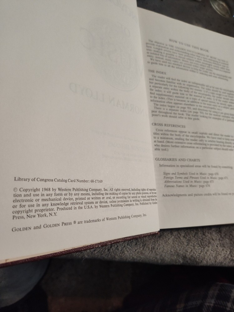 This is the first edition, and an early printing (perhaps the first) of a classic educational resource about music. Norman Lloyd's The Golden Encyclopedia of Music is an in-depth examination of music exploring the extent of historical understanding during one of the most productive musical eras. This copy is in very good to fine condition. There is wear around the spine's endcaps, there is some wear around edges of the hardcover. This copy does not feature a dust jacket. All pages sit firmly in a strong binding, the book seems to have only one interior marking, a number four on a title page. 720 Numbered Pages.