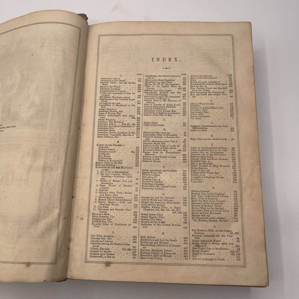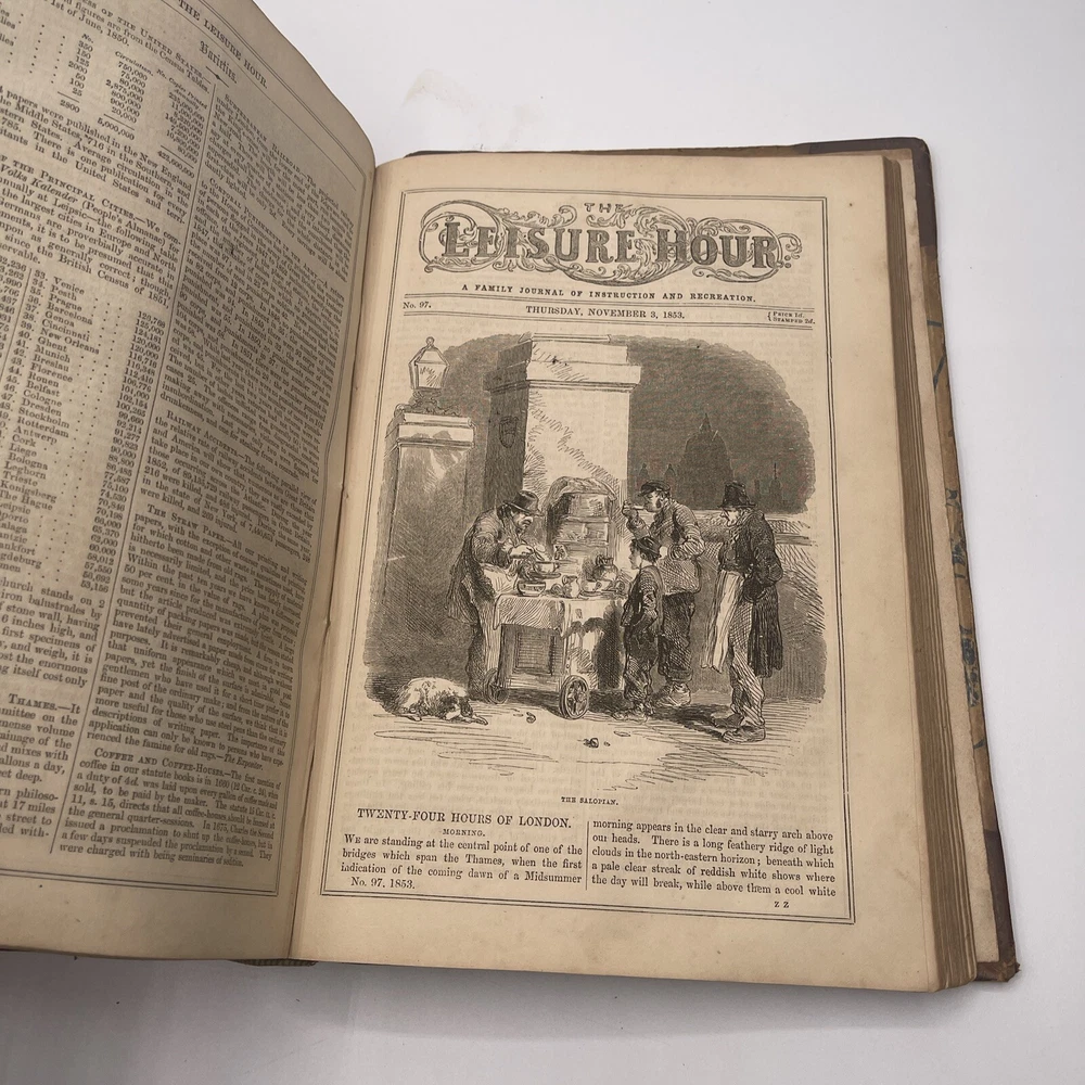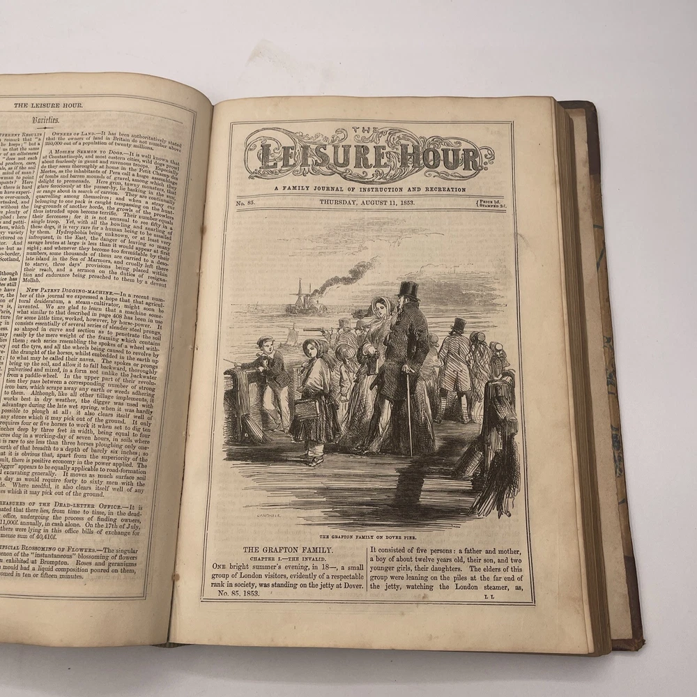 This is a rare and valuable copy of "The Leisure Hour Family Journal Of Instruction & Recreation Year Of 1853". It features beautiful leather binding, clear English language, and is illustrated with 1st edition graphics. The publisher, William Stevens, did an exceptional job of creating a literary masterpiece that will stand the test of time. This book is a great addition to any collection and is a must-have for literature enthusiasts. The book was printed in the United Kingdom in 1853 and is an original copy. It covers a range of topics related to literature and fiction, making it a great conversation piece for any book lover. 844 pages - front/rear board loose but attached. Some writing inside front rest of text clean