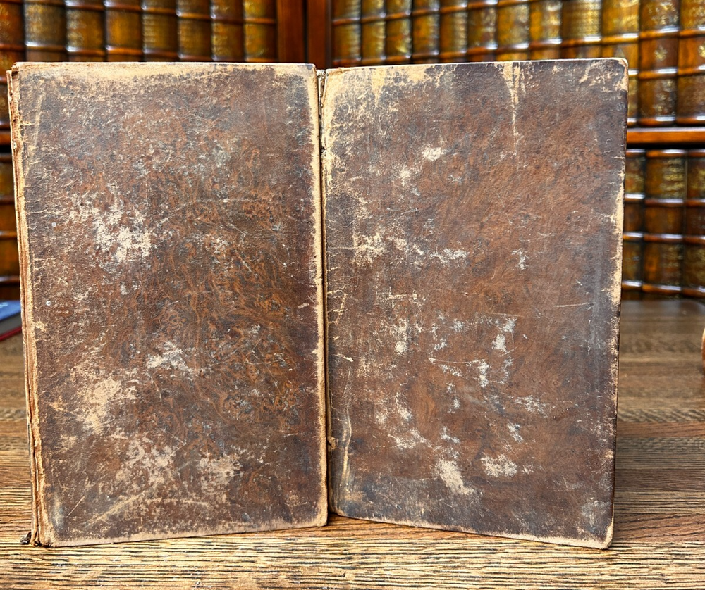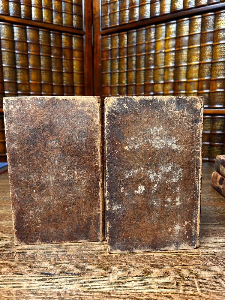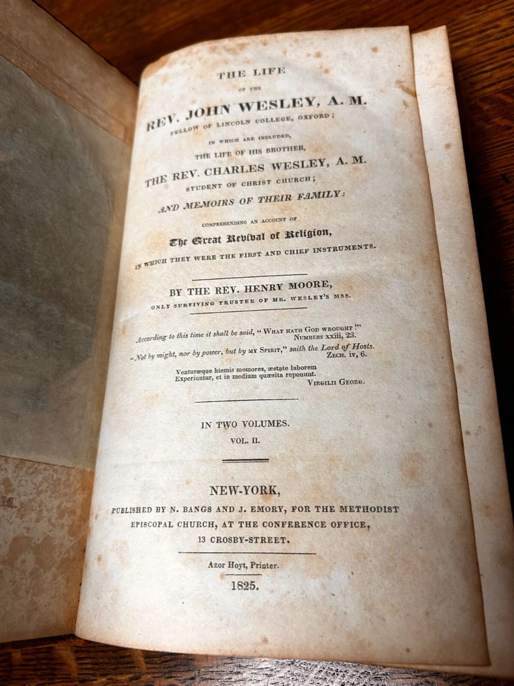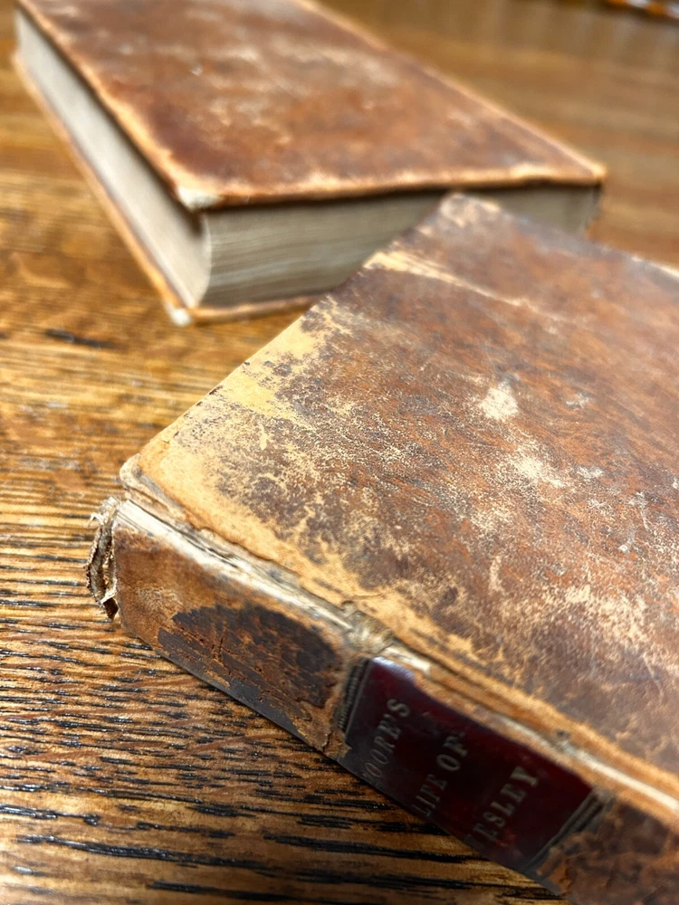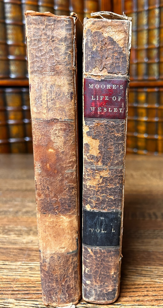 The Life of John Wesley, 2 Volumes Translated and compiled by Henry Moore Bangs and Emory Publishing 1825 Full Leather Good: Unmarked. No ownership name inside. Considerable rubbing to the leather, extremities and cover. Leather starting to deteriorate, as pictured. Fold lines particularly fragile. Hinges strong, the weakness is in the leather fold line exterior. Heavy chipping to spine leather with some pieces missing. Cover deterioration of leather. Small tear at the spine tail, holding, Age toned with considerable large age spots as pictured. One volume has a damp stain along edge of the title page but does not continue to text. Odor free. Considerable wear. Complete set like this, Rare. Scarce.