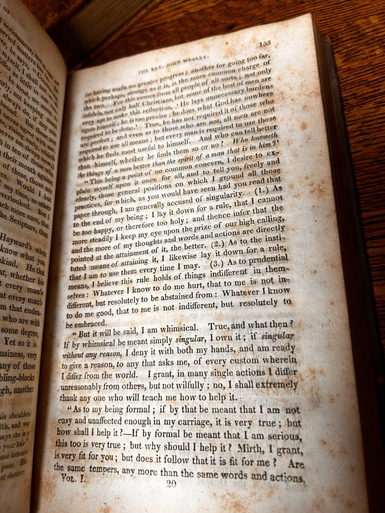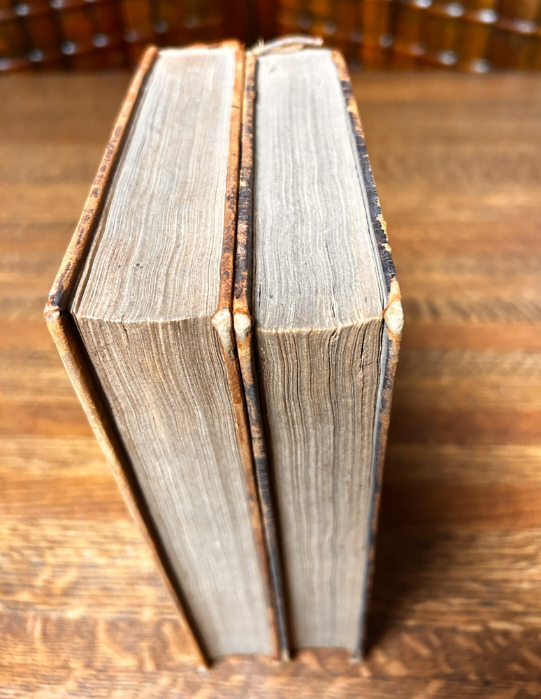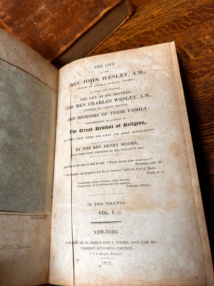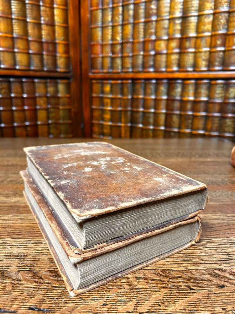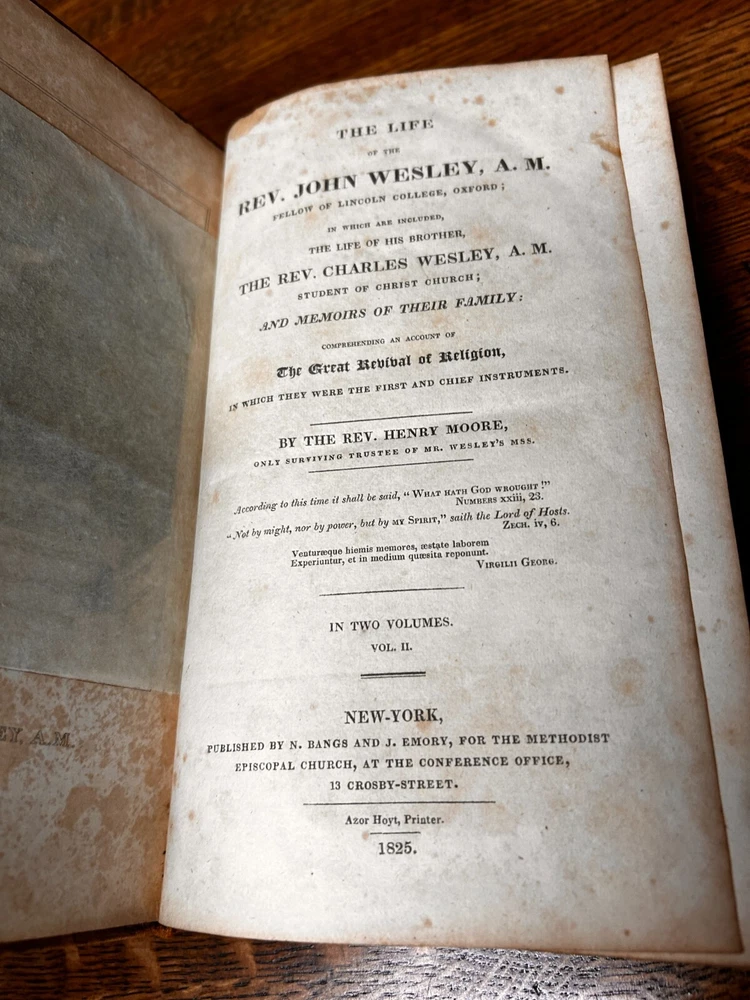 The Life of John Wesley, 2 Volumes Translated and compiled by Henry Moore Bangs and Emory Publishing 1825 Full Leather Good: Unmarked. No ownership name inside. Considerable rubbing to the leather, extremities and cover. Leather starting to deteriorate, as pictured. Fold lines particularly fragile. Hinges strong, the weakness is in the leather fold line exterior. Heavy chipping to spine leather with some pieces missing. Cover deterioration of leather. Small tear at the spine tail, holding, Age toned with considerable large age spots as pictured. One volume has a damp stain along edge of the title page but does not continue to text. Odor free. Considerable wear. Complete set like this, Rare. Scarce.