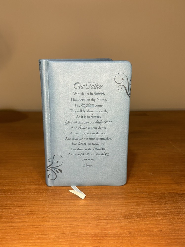 This blue leather-bound prayer journal is a beautiful addition to any collection. Measurements: 4 1/2" x 7". The journal is designed with the inscription of the "Our Father" prayer on the cover, making it a perfect gift for a loved one. The book is written in hardcover format, ensuring that it will last for years to come. The Lord's Prayer Journal is perfect for those who want to keep track of their prayers and reflections. It features a leather-bound cover that is both stylish and durable. The book is ideal for anyone who wants to add a touch of elegance to their prayer routine.