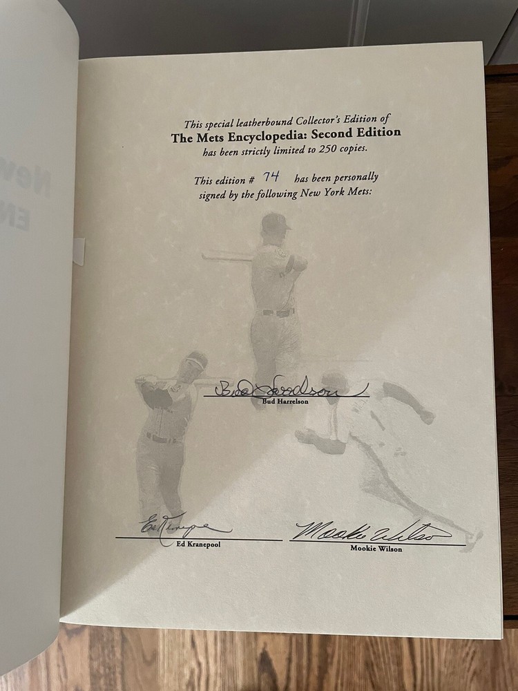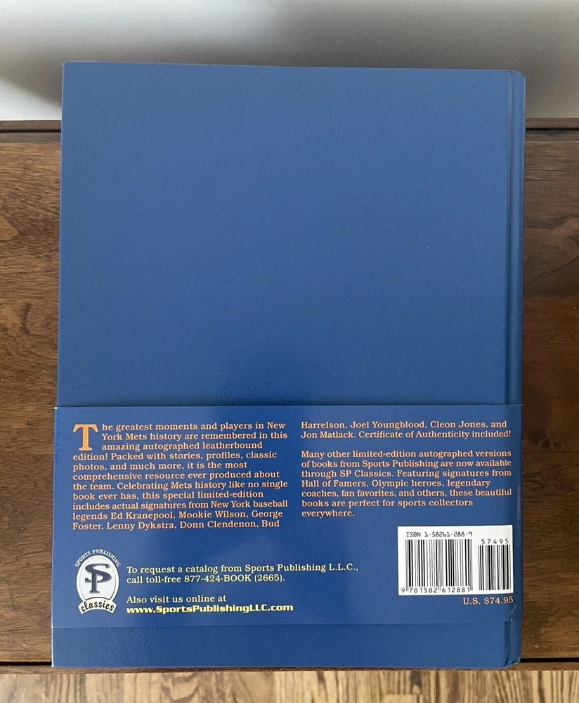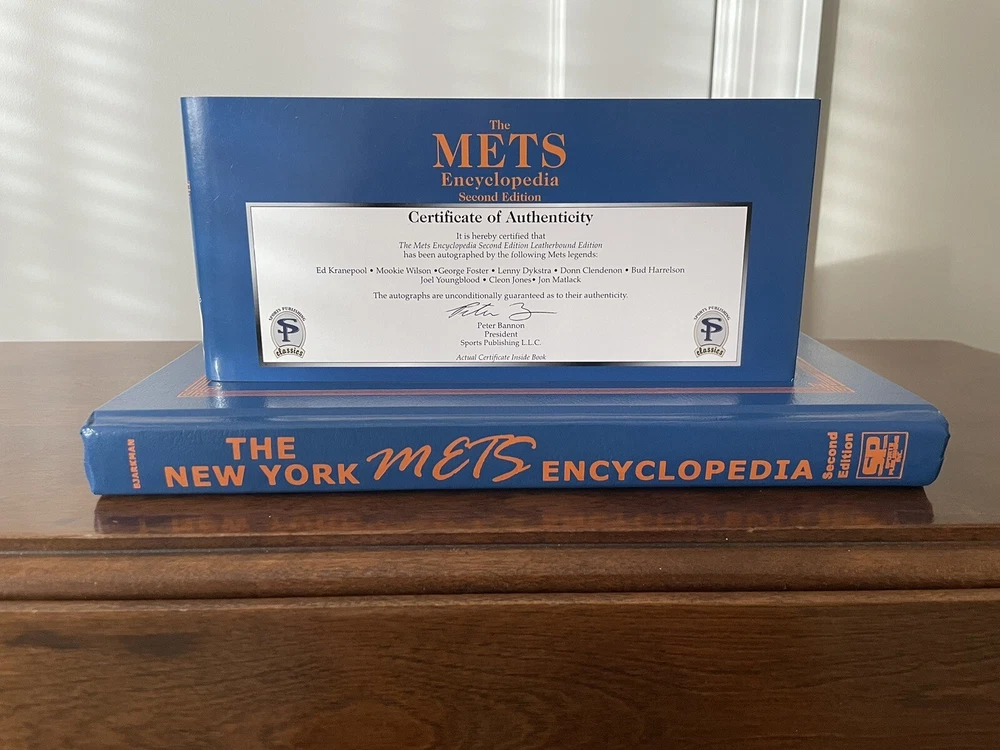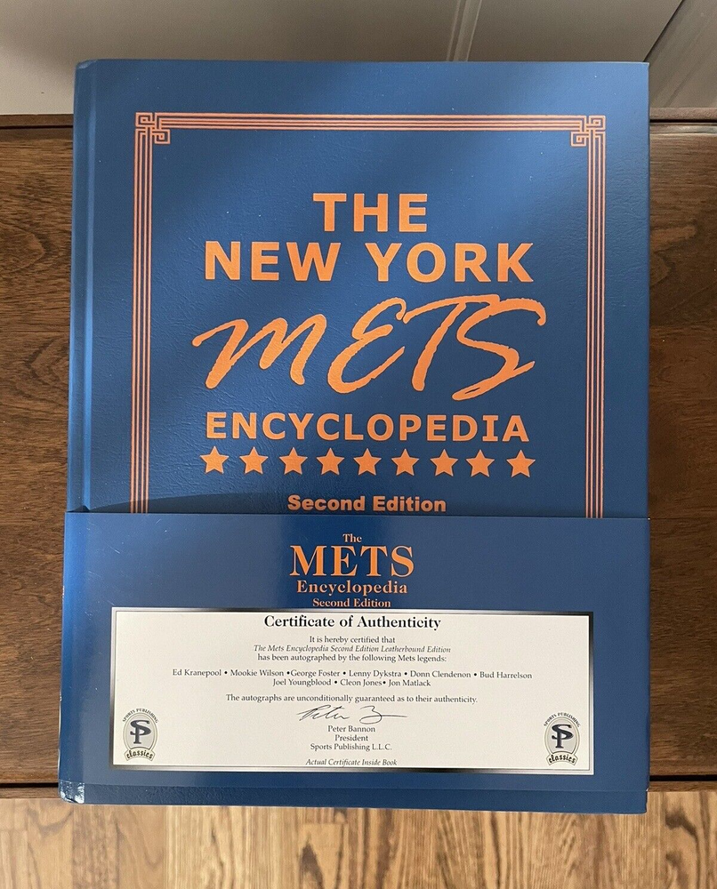 The New York Mets Encyclopedia Second Edition by Peter C. Bjarkman, COA Signed by 9 Players. Sports Publishing LLC. 2003. Please review all pictures and happy to answer any questions or provide additional photos. I try to capture all sides. See photos 8 and 9 for a small blemish on bottom left side. Sold as is. This is # 74 out of 250 copies of the limited leatherbound signed edition. The last picture shows the centerfold foldout. The book comes with the wrap around and the Certificate of Authenticity (photo 7). Autographed by: Ed Kranepool, Mookie Wilson, George Foster, Lenny Dykstra, Donn Clendeon, Bud Harrelson, Joel Youngblood, Cleon Jones, and Jon Matlack. This book will require a signature for delivery. It will be bubble wrapped and boxed for shipping with extra packing. Thanks for looking.
