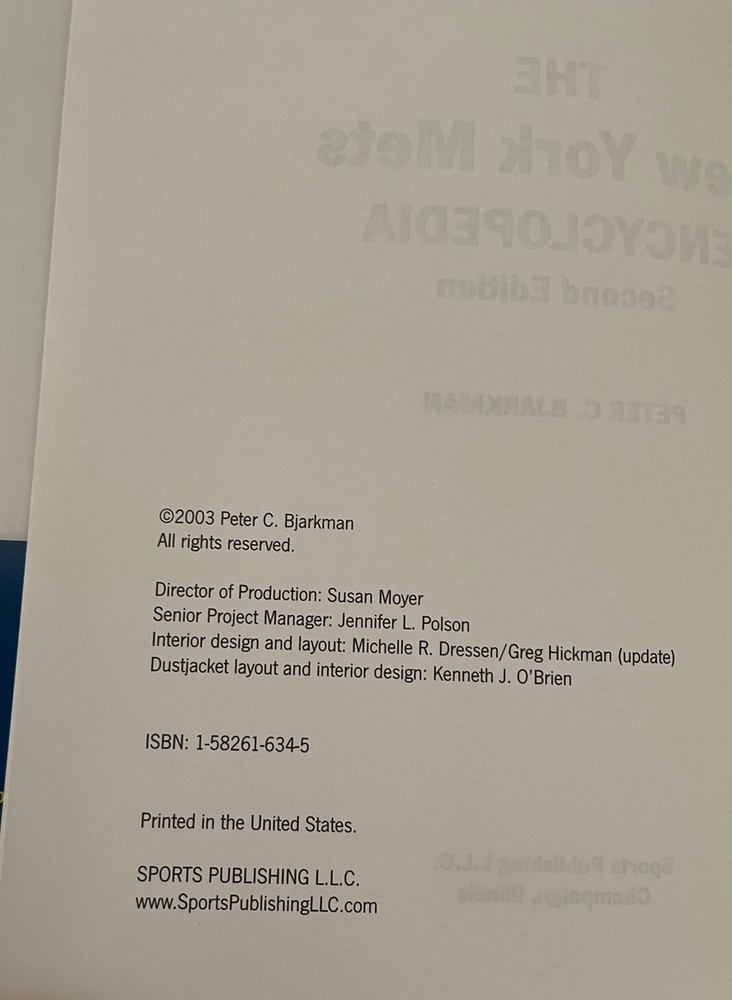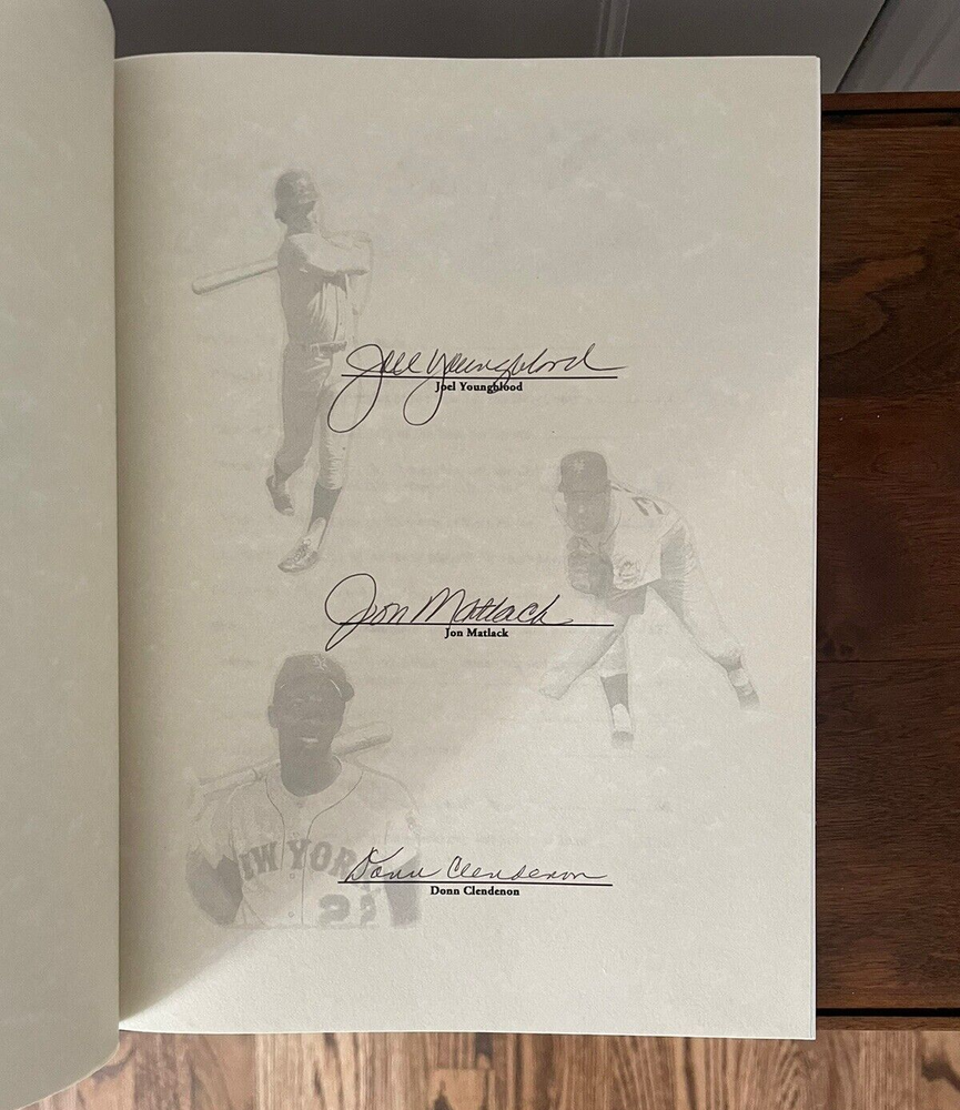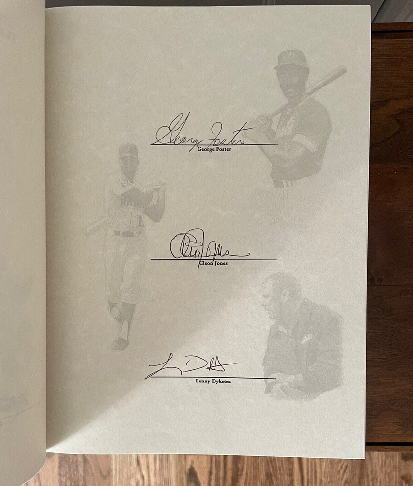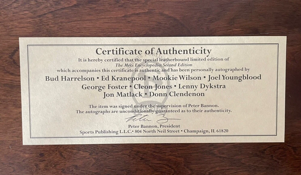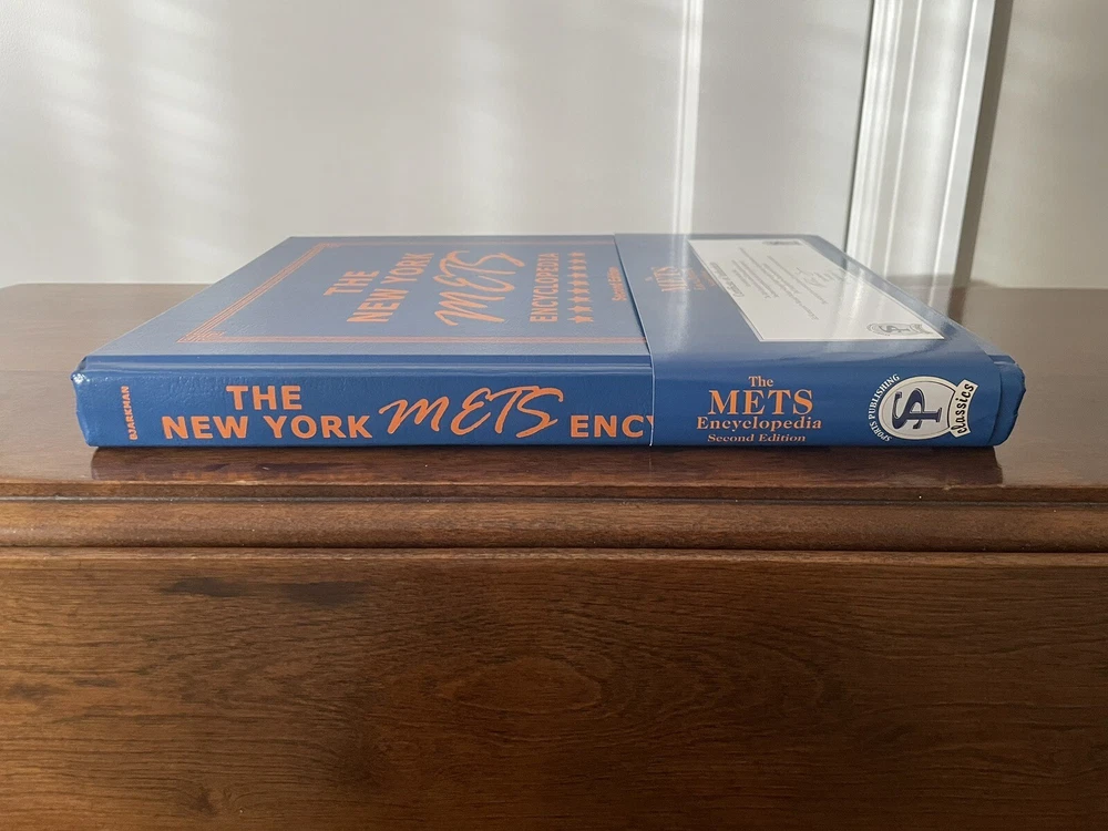 The New York Mets Encyclopedia Second Edition by Peter C. Bjarkman, COA Signed by 9 Players. Sports Publishing LLC. 2003. Please review all pictures and happy to answer any questions or provide additional photos. I try to capture all sides. See photos 8 and 9 for a small blemish on bottom left side. Sold as is. This is # 74 out of 250 copies of the limited leatherbound signed edition. The last picture shows the centerfold foldout. The book comes with the wrap around and the Certificate of Authenticity (photo 7). Autographed by: Ed Kranepool, Mookie Wilson, George Foster, Lenny Dykstra, Donn Clendeon, Bud Harrelson, Joel Youngblood, Cleon Jones, and Jon Matlack. This book will require a signature for delivery. It will be bubble wrapped and boxed for shipping with extra packing. Thanks for looking.