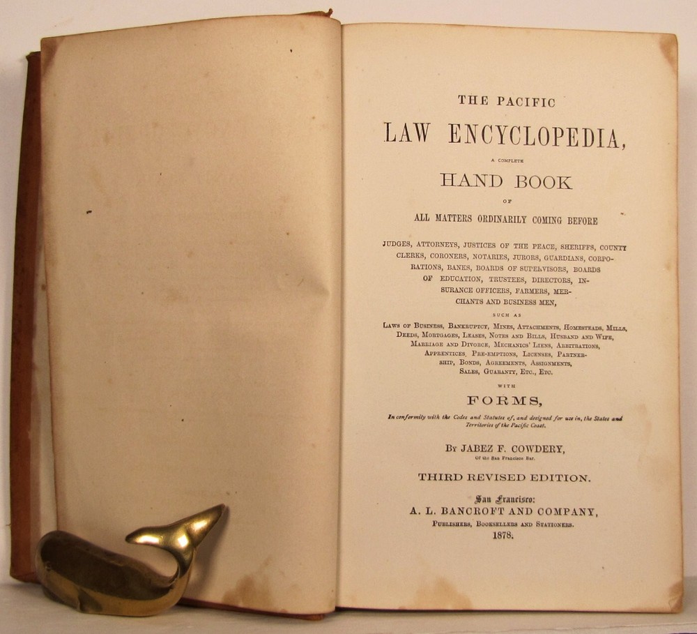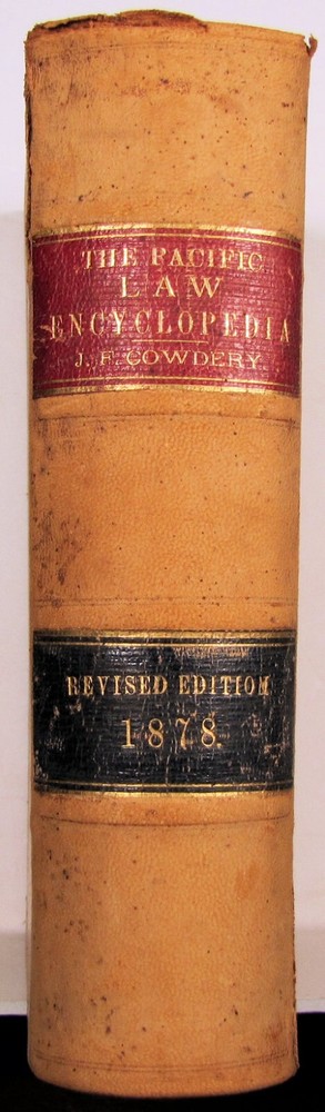 THE PACIFIC LAW ENCYCLOPEDIA, A COMPLETE HAND BOOK OF ALL MATTERS ORDINARILY COMING BEFORE JUDGES, ATTORNEYS, JUSTICES OF THE PEACE, SHERIFFS, COUNTY CLERKS, CORONERS, NOTARIES, JURORS, GUARDIANS, CORPORATIONS, BANKS, BOARDS OF SUPERVISORS, BOARDS OF EDUCATION, TRUSTEES, DIRECTORS, INSURANCE OFFICERS, FARMERS, MERCHANTS AND BUSINESS MEN, ... JABEZ F. COWDERY, A. L. BANCROFT AND COMPANY, San Francisco, 1878. Full leather with gilt over red and black swatches to the spine. General tiny fox spotting to the cover with a two and 1-1/2 inch outer spine edge split to the leather (small top edge fray and some soil). The binding is overall secure with clean pages. About 9 x 6-1/4 with 820 pages. Rare.