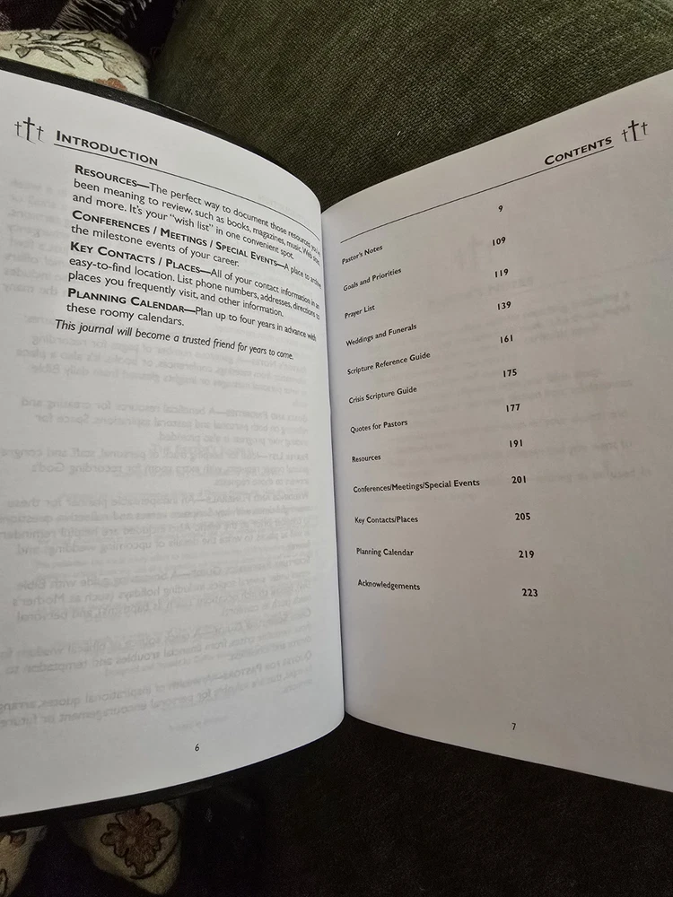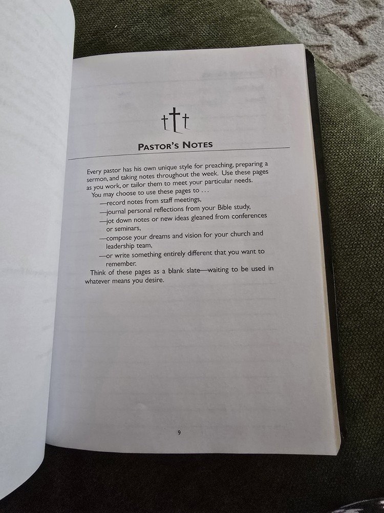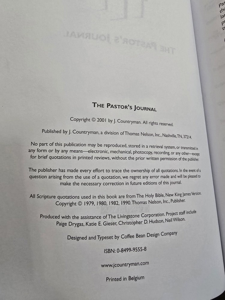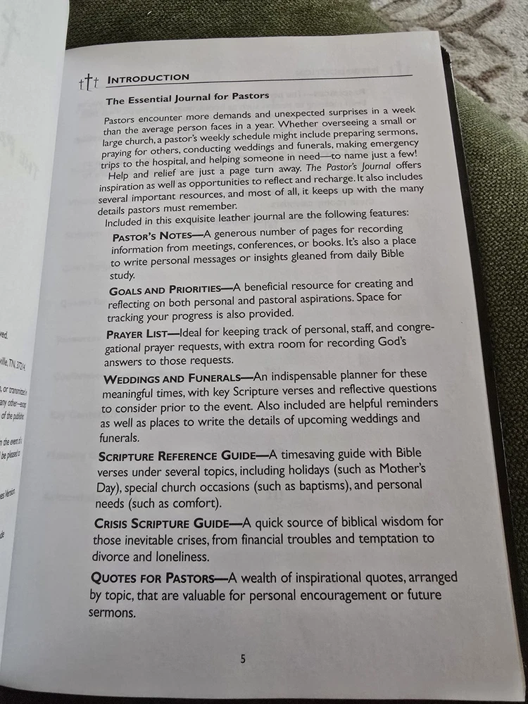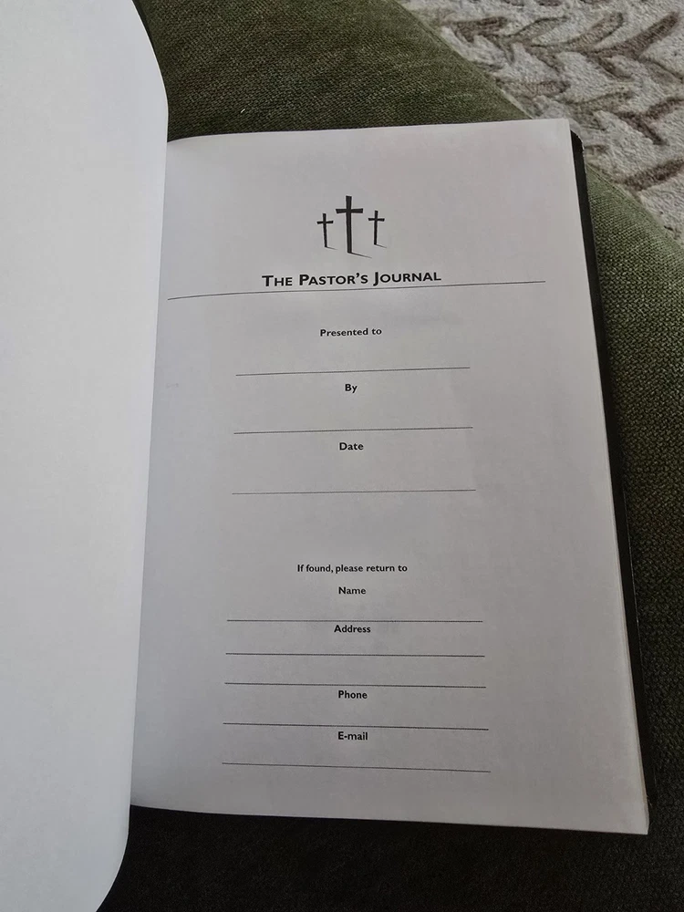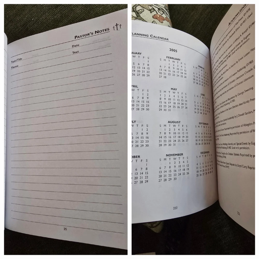 Unused copy of The Pastor's Journal. Please note: Included calendar only goes up to 2005, as this is an old publication. A pastor's week is filled with an endless assortment of demands and events - from weddings and funerals to sermon preparation and staffing issues. Until now, there was not a single resource that pastors could carry with them to manage these multiple demands. The Pastor's Journal, covered in rich Eurobond leather, includes the following features requested by pastors: 152 pages for sermon notes and preparation Scripture reference guide Prayer lists Staff / congregation / hospital contact information Funeral and wedding planner Priorities / goals for the year Sermon calendar Quotes to inspire and encourage And much more.