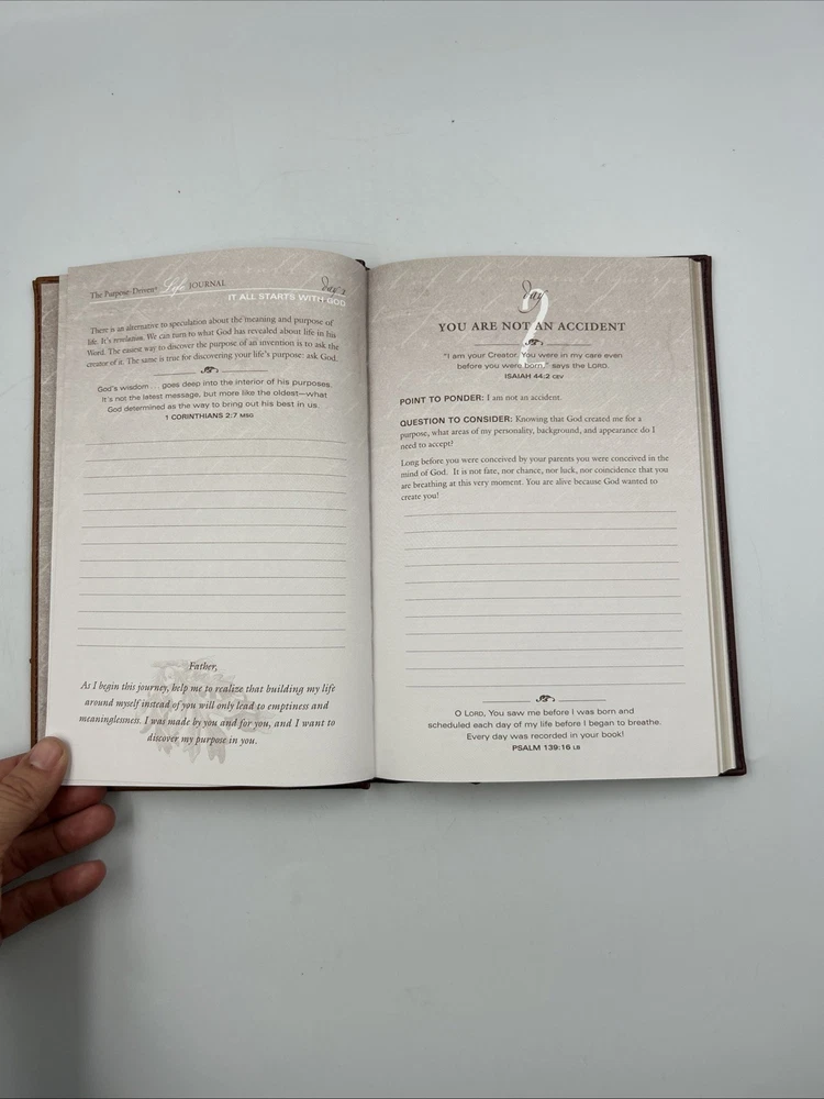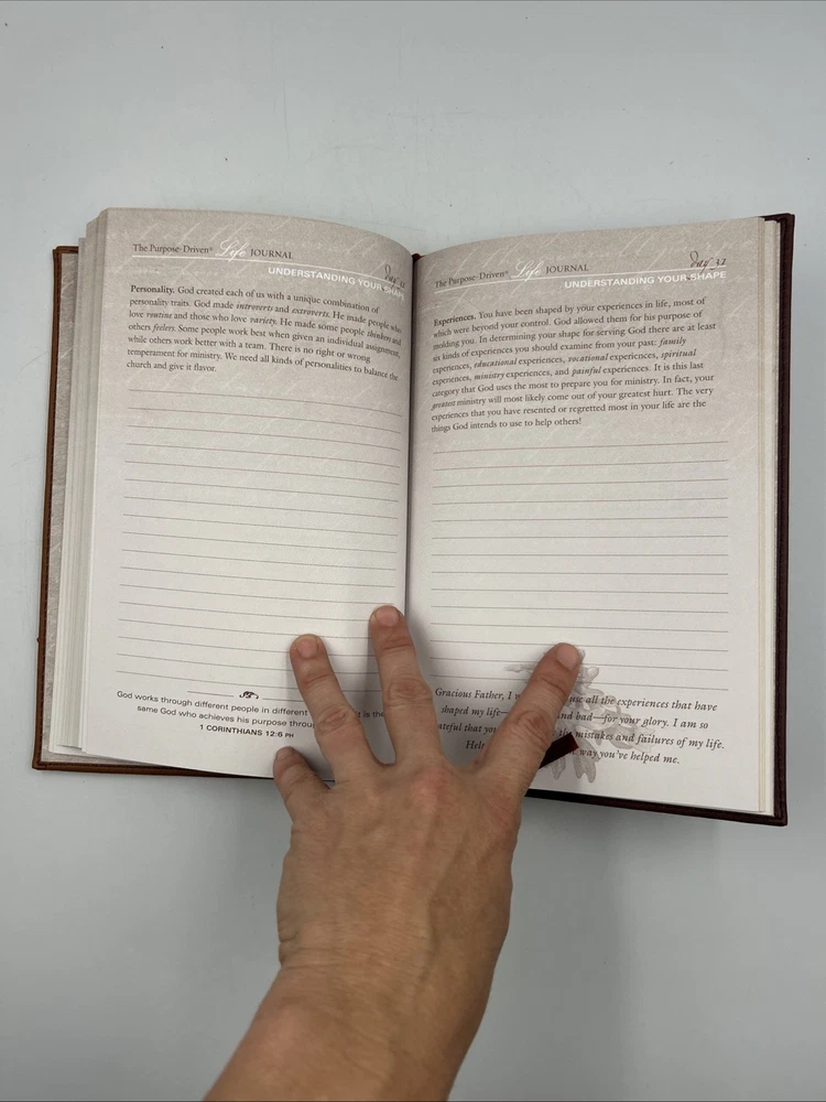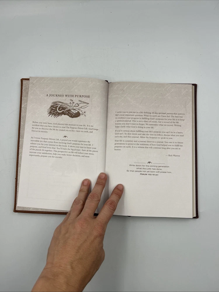 This deluxe journal, bound in leather, is a great tool for anyone looking to reflect on their purpose in life. With 160 pages of reflection prompts, it is the perfect companion to Rick Warren's best-selling book, "The Purpose Driven Life." Written in English and published by Zondervan in 2003, this journal is intended for young adults and adults alike. The journal is vintage and has a topic of Christian life and spiritual growth. It measures 9.3 inches in length, 6.1 inches in width, and 0.7 inches in height, with a weight of 15.9 ounces. It is a great addition to any collection of religious literature and a helpful tool for anyone seeking spiritual growth.