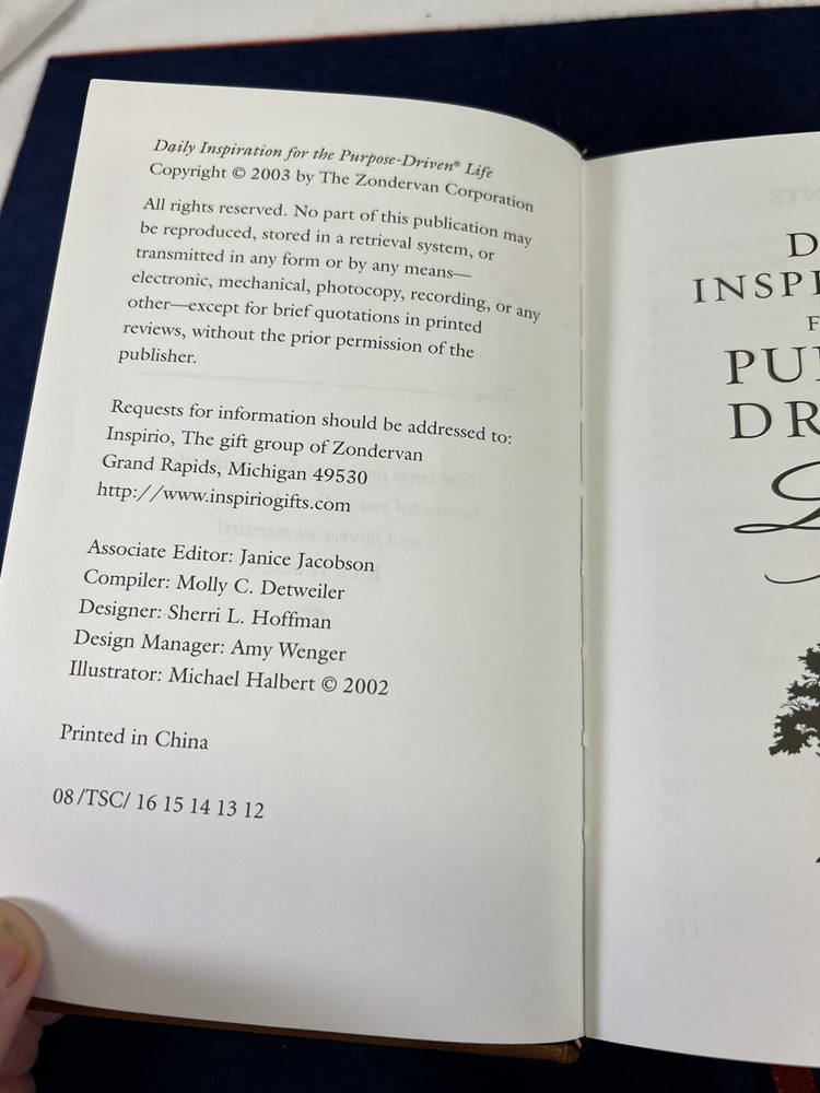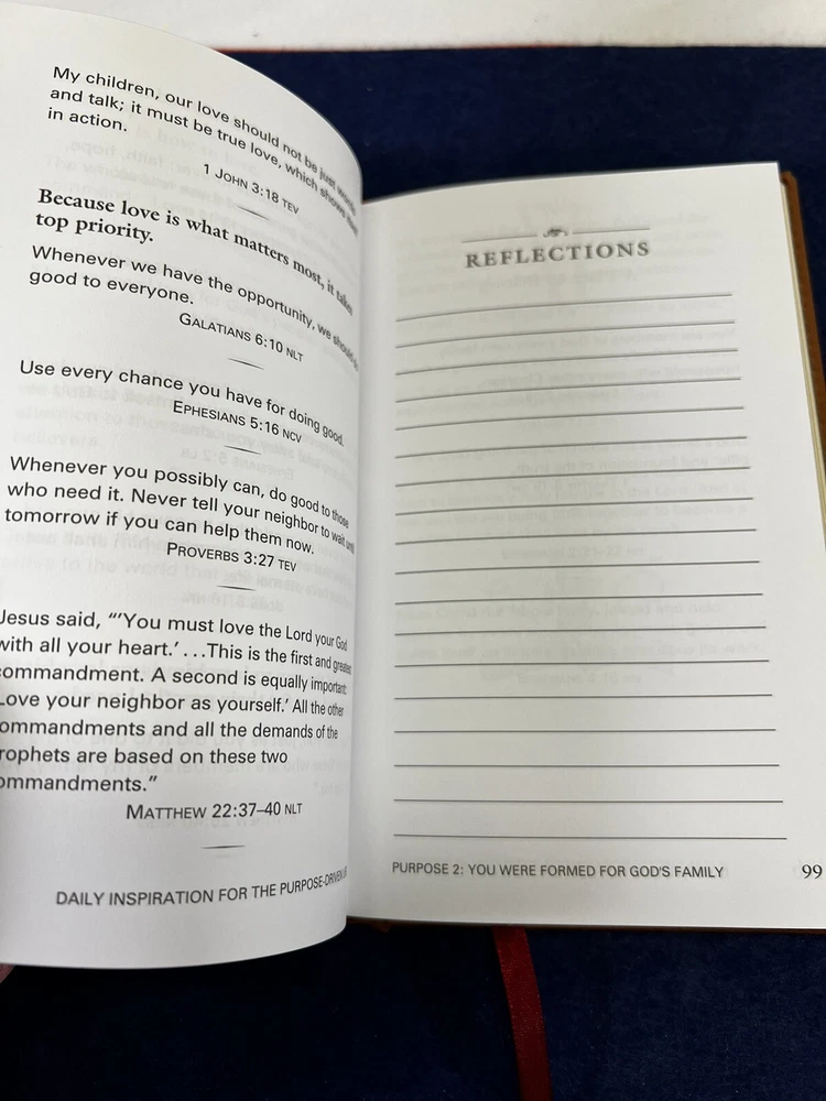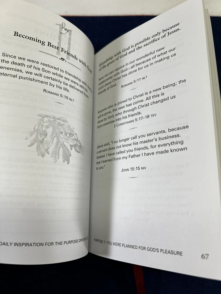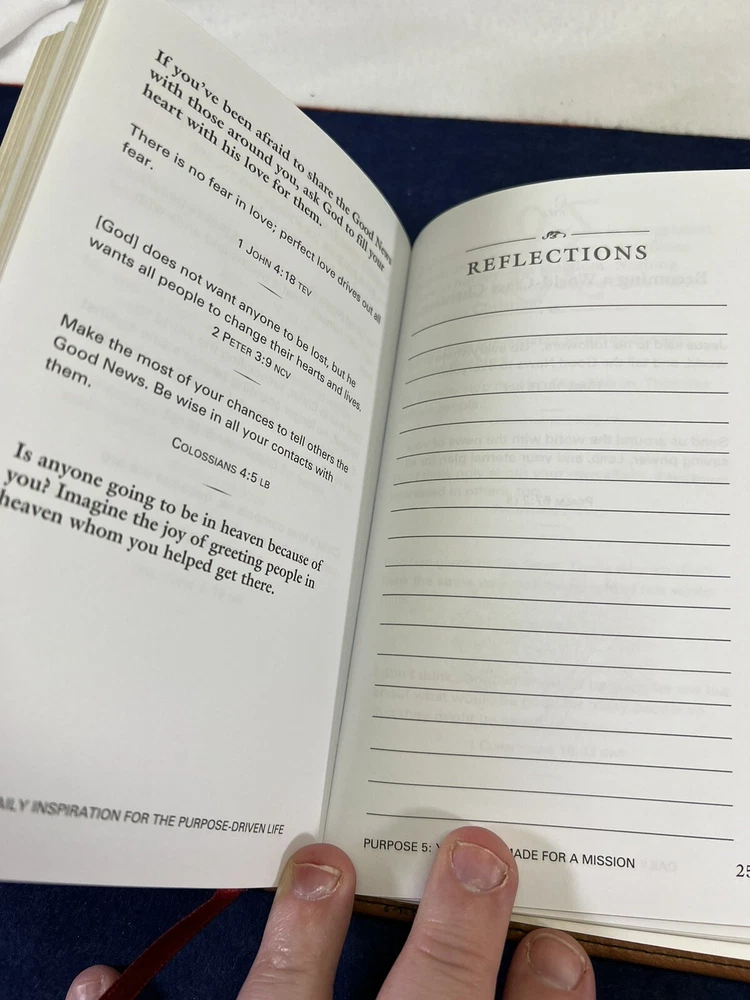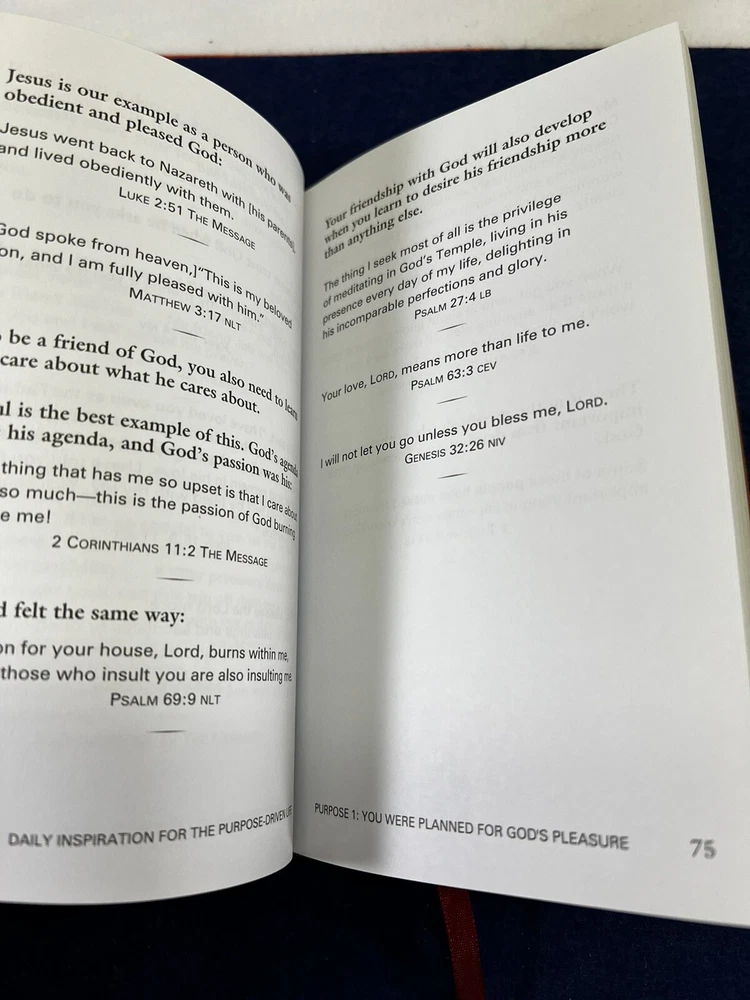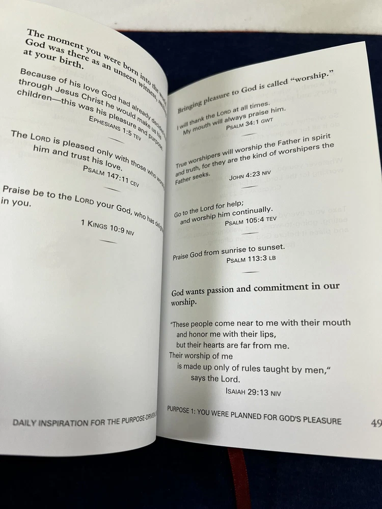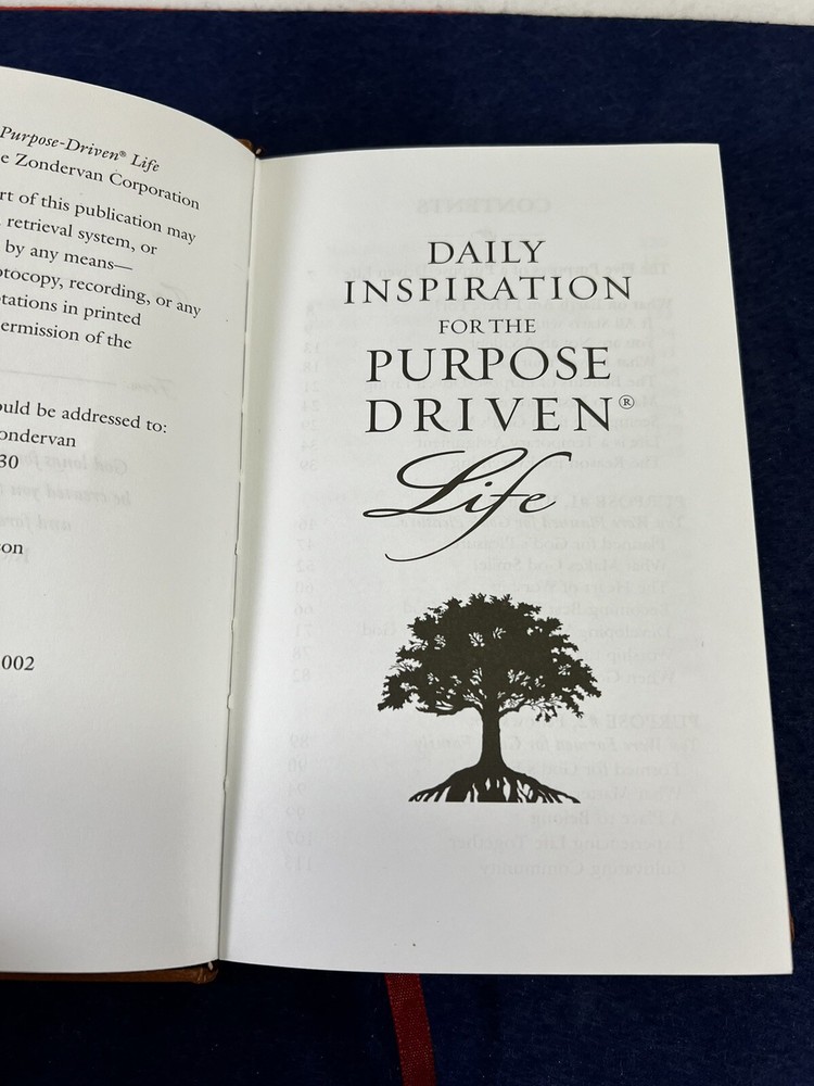 The Purpose Driven Life Rick Warren Leather Bound Daily Devotional No Rips or Writing in it. In Overall New Unused Preowned Condition Ships Media or Ground depending on weight. Thank you for viewing this listing if you have any questions about this listing please contact us directly. We offer no questions asked free returns. If you are not satisfied with this item for any reason simply open a return, ship the item back to us for free with us providing the shipping label, and when the item arrives and is inspected to make sure it is the same item we sold and is in the same condition as purchased, we will then refund your money. All Items are shipped Same business day if bought before 12:00 PM Eastern Standard Time or Next Business Day. If Item is bought on a Friday Saturday or Sunday It will ship out that Monday unless its a National Holiday. If Item is Bought on a Holiday The item will ship on the next available day. Thank you again for shopping with WNC Cherokee Trader, we hope that you have a wonderful day.