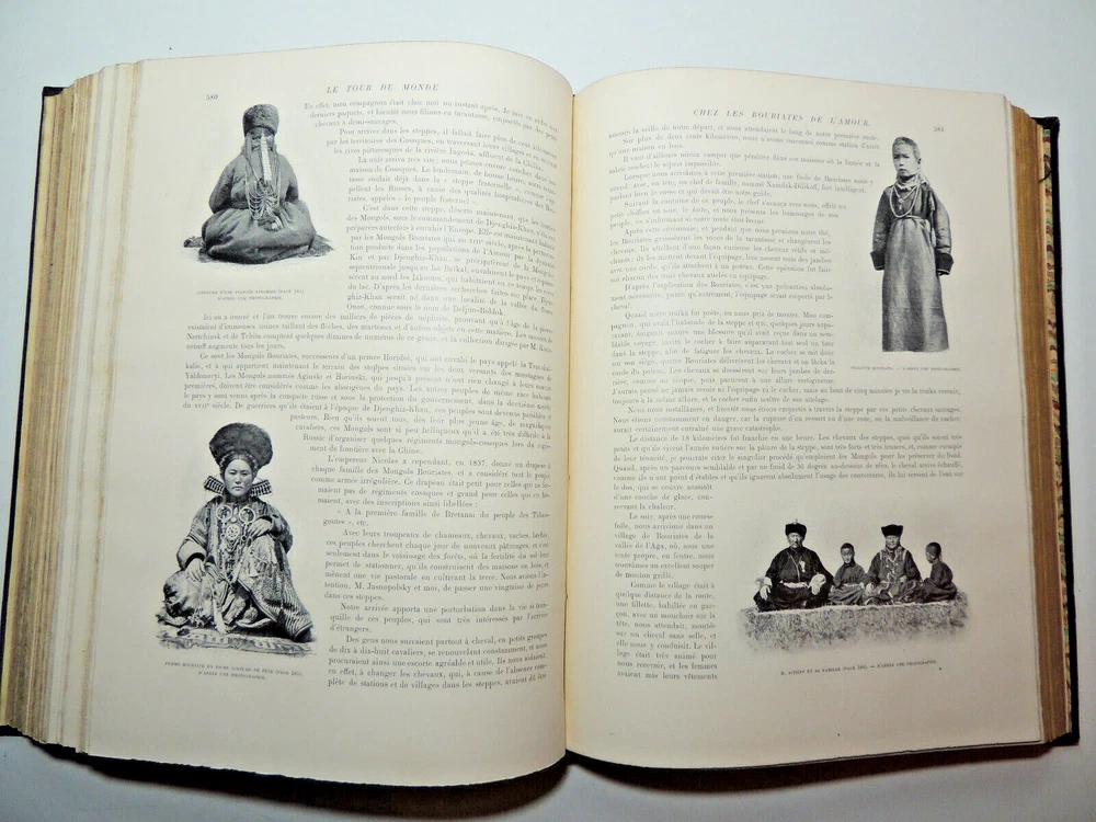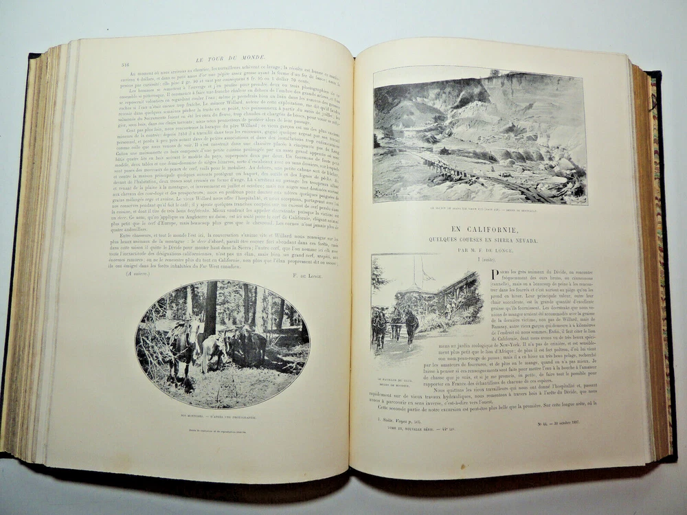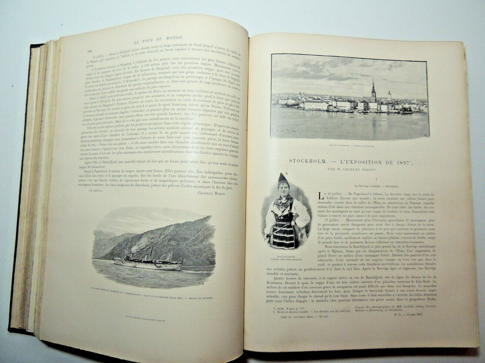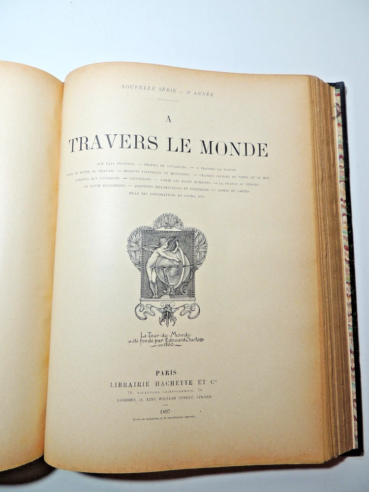 The Tour Of The World. Travel Journal 1897 New Series (Complete) The description of this item has been automatically translated. If you have any questions, please feel free to contact us. Le Tour du Monde, new travel journal edited by Edouard Charton New series. 1897 Table (excerpts): In Germany Journey to the historic towns of Franconia Nuremberg by Eugène Müntz. The dead towns of Siam by L. Fournereau. To the lands of Kerguelen islands of Saint-Paul and Amsterdam by E. Mercié. In Scotland by Marie Anne de Bovet. Fifteen months on the island of Cyprus by Emile Deschamps. In California some races in Sierra Nevada by F. de Longe. In the Land of Don Quixote by Aug.-G. Jaccaci. In the Land of the Buryats by M. Chimkievitch Complete volume 2 semester 1899, 32 x 24 cm. 624pp + Notebooks "around the world, 424pp. beautiful glossy paper, very richly illustrated with more than 500 partially full-page engravings. -- Fresh interior, beautiful copy. 3kg. Paris, Hachette 1897 Le Tour du Monde, new travel journal edited by Edouard Charton New series. 1897 Table (excerpts): In Germany Journey to the historic towns of Franconia Nuremberg by Eugène Müntz. The dead towns of Siam by L. Fournereau. To the lands of Kerguelen islands of Saint-Paul and Amsterdam by E. Mercié. In Scotland by Marie Anne de Bovet. Fifteen months on the island of Cyprus by Emile Deschamps. In California some races in Sierra Nevada by F. de Longe. In the Land of Don Quixote by Aug.-G. Jaccaci. In the Land of the Buryats by M. Chimkievitch Complete volume 2 semester 1899, 32 x 24 cm. 624pp + Notebooks "around the world, 424pp. beautiful glossy paper, very richly illustrated with more than 500 partially full-page engravings. -- Fresh interior, beautiful copy. 3kg. Paris, Hachette 1897 Caractéristiques spéciales Édition de luxe Date de publication 1897 Reliure Cuir Langue Français Époque XIXème Nom Voyage Sujet Voyages et exploration