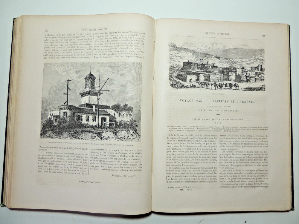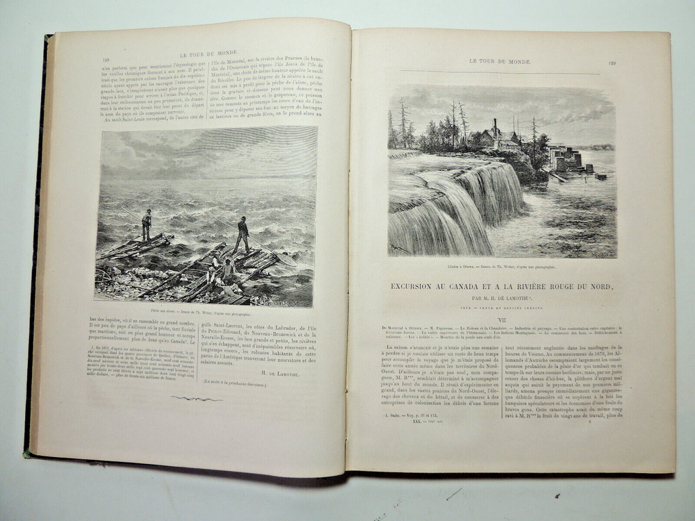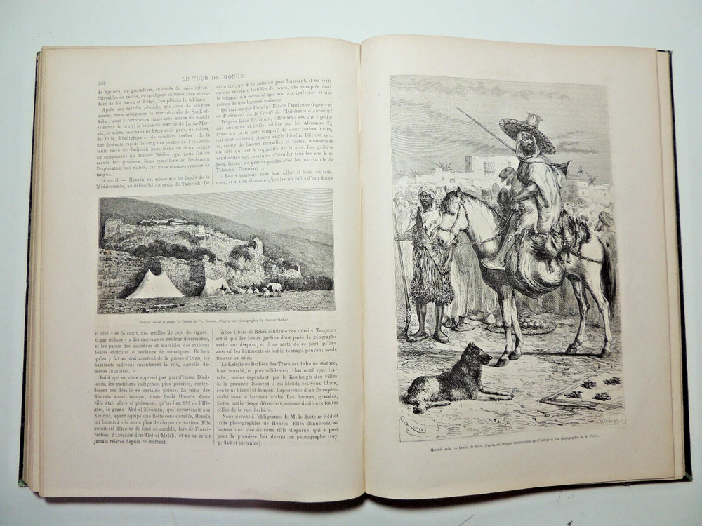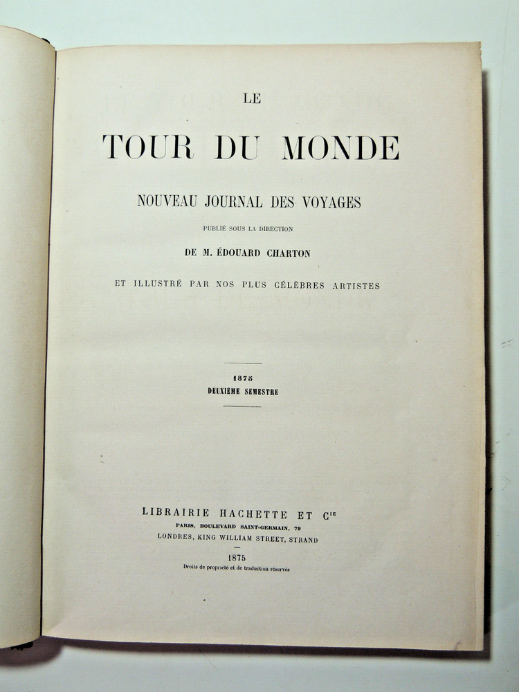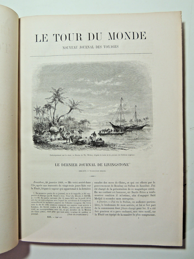 The Tour of the World, New Journal of Travels 1875. The description of this item has been automatically translated. If you have any questions, please feel free to contact us. LE TOUR DU MONDE, New Travel Journal 1875 (2nd semester) published under the direction of Mr. Edouard Charton and illustrated by our most famous artists Livingstone's last journal, (1866 - 1873, unpublished translation), Excursion to Canada and the Red River of the North by H. de Lamothe, Roquefort and its surroundings (Aveyron) by Adrien Roques and Jules Charton, Le Polaris - Le rafteau of ice by Lieutenant Tyson, Journey to China by Thomson, Storms and shipwrecks by Zurcher and Margollé, Journey to Lazistan and Armenia by the impressionist painter Théophile Deyrolle, Across Australia by Egerton Warburton, Tlemcen by de Lorral, Journey in Cochinchina by Doctor Morice. Among the designers: 22 drawings by Deyrolle, Bayard, Daniel Virginie, Delafosse, de Bar, Riou, Bassot, Benoist, Sorrel de Penne, Clerget. volume in-4, bound 32x25cm, half leather, rubbing, text on 2 columns, some foxing, nice copy, approximately 400pp. Hatchet other volumes on sale, group purchases! published under the direction of Mr. Edouard Charton and illustrated by our most famous artists Livingstone's last journal, (1866 - 1873, unpublished translation), Excursion to Canada and the Red River of the North by H. de Lamothe, Roquefort and its surroundings (Aveyron) by Adrien Roques and Jules Charton, Le Polaris - Le rafteau of ice by Lieutenant Tyson, Journey to China by Thomson, Storms and shipwrecks by Zurcher and Margollé, Journey to Lazistan and Armenia by the impressionist painter Théophile Deyrolle, Across Australia by Egerton Warburton, Tlemcen by de Lorral, Journey in Cochinchina by Doctor Morice. Among the designers: 22 drawings by Deyrolle, Bayard, Daniel Virginie, Delafosse, de Bar, Riou, Bassot, Benoist, Sorrel de Penne, Clerget. volume in-4, bound 32x25cm, half leath Auteur Edouard Charton Caractéristiques spéciales Illustré Reliure Cuir Langue Français Époque XIXème Sujet Voyages et exploration