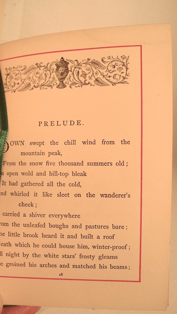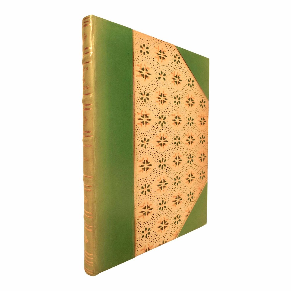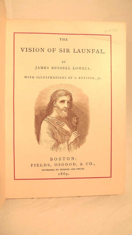 The late 19th century decorative illustrated leather book, Lowell's The Vision of Sir Launfal is a long verse parable originally published in 1848. Lowell, who was influenced by the works of Alfred, Lord Tennyson, and Thomas Malory, offers his version of the Grail story in this tale of a knight who decides not to take a journey in search of the Holy Grail after he learns, during the course of a long dream, that the real meaning of the Grail is charity. The poem is written in iambic tetrameter and is divided into two parts, each with a prelude. Although set in the medieval era, the poem contains moving descriptions of the American landscape. Title: The Vision of Sir Launfal Author: James Russell Lowell Publisher: Field, Osgood, & Co. (Successors to Ticknors and Fields). Printing: Hazell, Watson & Viney, London. Publication date: 1869. Binding/description: Bound for Brentano's ca. 1900 in three quarter green leather over antique white floral decorated paper boards, spine gilt-decorated with five raised bands, green marble endpapers, upper leaf edge gilt. Author note: He was an American poet, critic, essayist, editor, and diplomat whose major significance probably lies in the interest in literature he helped develop in the United States. He was a highly influential man of letters in his day, but his reputation declined in the 20th century. This long poem was enormously popular, extolling the brotherhood of man, and during the period made Lowell the most popular new figure in American literature. Binding note: Brentano's was the elite bookstore in 1946 located on Fifth between 47th and 48th. In 1946, Brentano's had stores in major cities across the country and famously in Paris. Most bookshop sales in New York in 1946 took place in chains like Brentano's or in the book departments of major department stores like Macy's. Many New Yorkers had been greeted through the years at the door by a dignified, impeccable elderly gentleman with pince-nez glasses at the front door. Many did not realize that this was Brentano's president, Arthur Brentano. He had an air of erudition, although he had not been to high school. Brentano's had a venerable history. It dated back to a newsstand opened by August Brentano, an Austrian immigrant with a withered arm, in 1853. It originally stood in front of the New York hotel at a time when newspapers were more often hawked by newsboys on the street. Brentano created a niche by carrying newspapers from Europe as well as the New York journals. He later changed locations and added a few books. He opened his first real bookstore in a basement in 1860. From the start, he catered to the carriage trade, offering books and periodicals not obtainable elsewhere. He followed the northward march of upscale retailers from lower Broadway near Washington Square to Union Square in 1870, a block away from Tiffany. This store became a tourist attraction as a place where one might catch a glimpse of one of the era's literary celebrities. Dimensions: 0.5ʺW × 5ʺD × 6.75ʺH Condition Notes: Very good; gently sunned spine, upper corner of text pages effected by light damp stain, strong square spine, clean light age-toned pages. A beautiful copy.