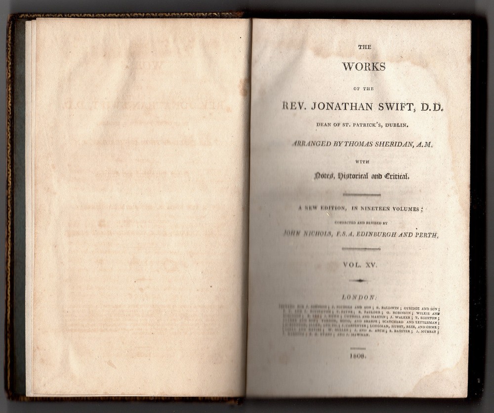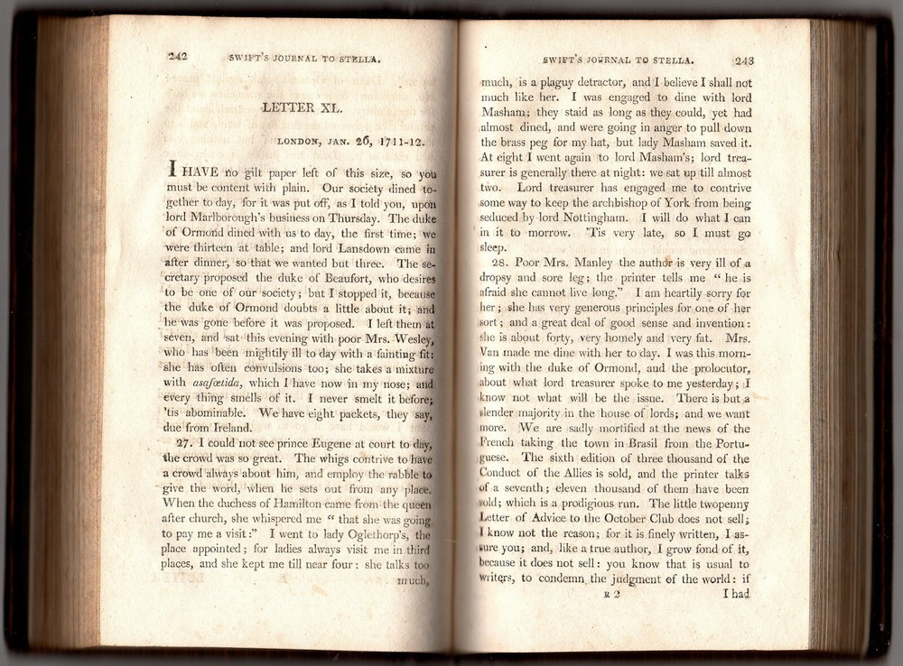 The Works of the Rev. Jonathan Swift, D.D., Dean of St. Patrick's, Dublin, Volume XV, Arranged by Thomas Sheridan, A.M., with Notes, Historical and Critical, A New Edition, In Nineteen Volumes, Corrected and Revised by John Nichols, F.S.A. Edinburgh and Perth, printed by C. and R. Baldwin, Printer, London, UL, 1808 — 431 pages — not illustrated. The Fifteenth Volume contains: Journal to Stella, Letter XX, April 5, 1711 through Letter LXV, June 6, 1713.