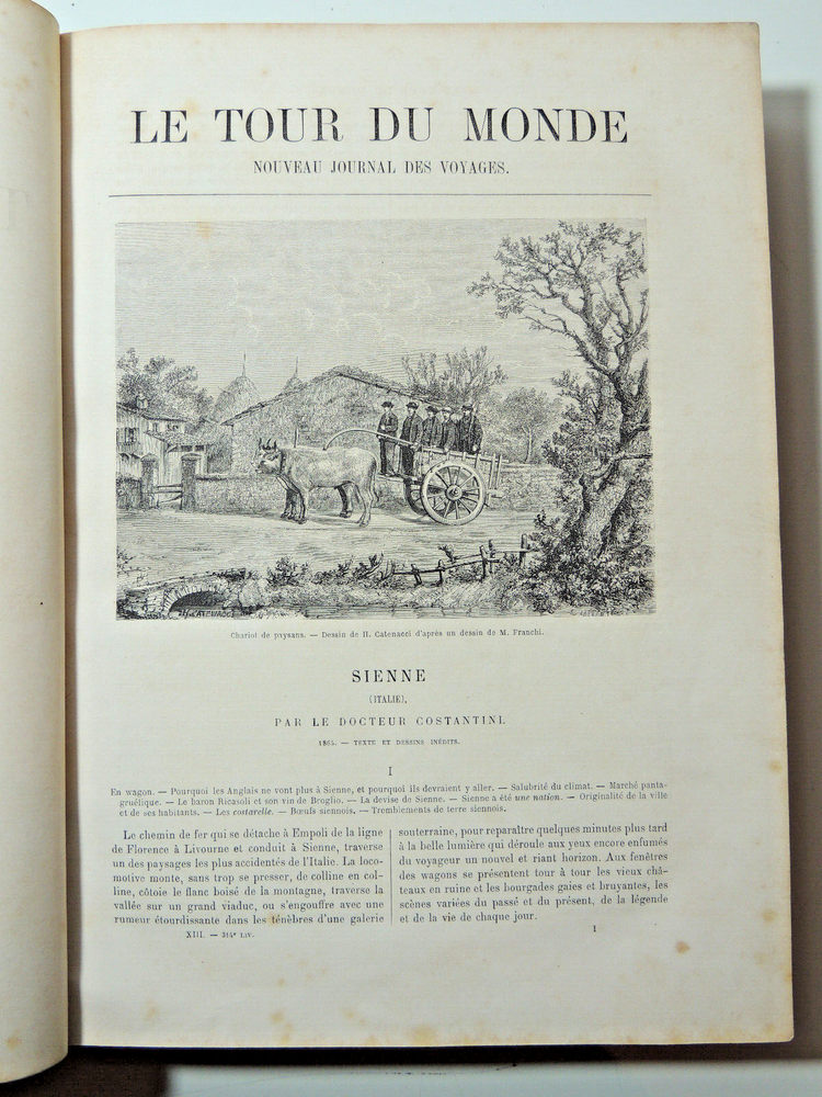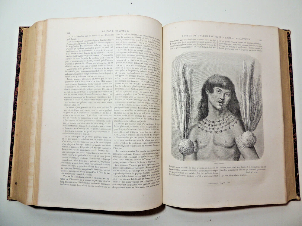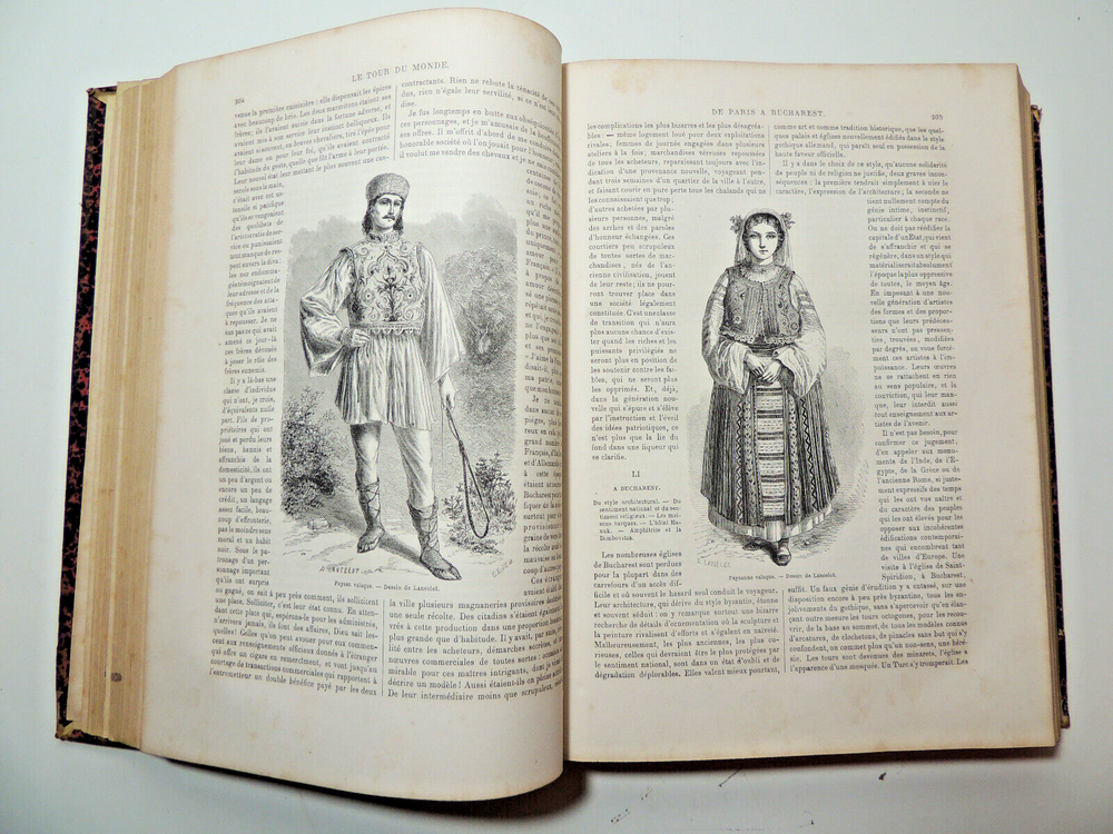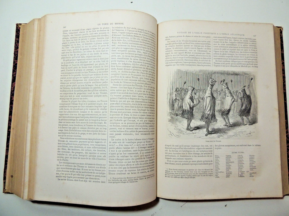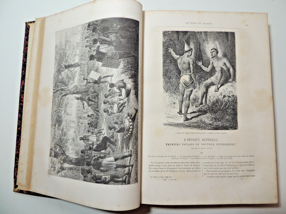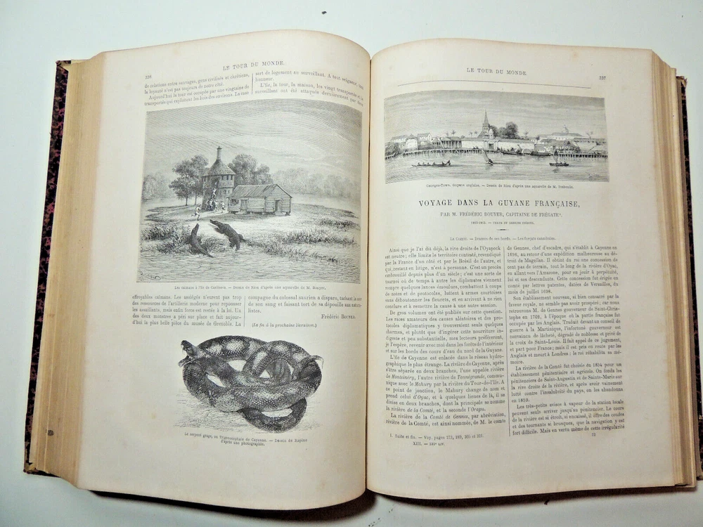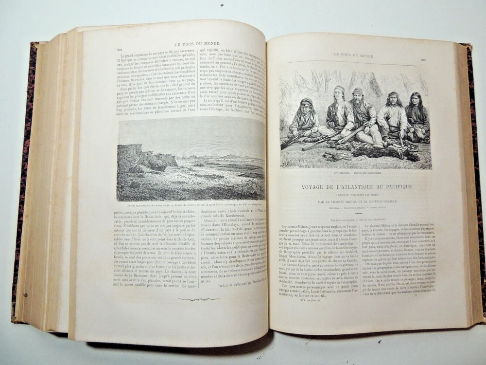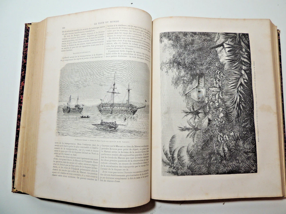 The World Tour. Travel Journal 1866 (complete) The description of this item has been automatically translated. If you have any questions, please feel free to contact us. Le Tour du Monde, new travel journal edited by Edouard Charton New series. 1866 Table (excerpts): Japan, by A. Humbert, 1863-1864; Travel from the Pacific Ocean to the Atlantic Ocean through South America. Peru, 11th stage, by P. Marcoy, 1848-1860; Travel to Eastern Sudan, by Trémeaux, 1848-1850; Exploration of Upper Asia, by the Schlaglintweit brothers, 1854-1857; Voyage from the Atlantic to the Pacific (north-west route by land), by Viscount Milton and Dr Chealde, 1862-1864; Journey to the volcanoes of central France, by F. de Lanoye, 1864; Travel to Spain: Seville, by G. Doré and Ch. Davillier, 1862 Complete volume 2 semesters, 32 x 24 cm. very richly illustrated with more than 500 partially full-page engravings, 436 + 436pp, fresh interior, beautiful copy. 3kg. Paris, Hachette 1866 Le Tour du Monde, new travel journal edited by Edouard Charton New series. 1866 Table (excerpts): Japan, by A. Humbert, 1863-1864; Travel from the Pacific Ocean to the Atlantic Ocean through South America. Peru, 11th stage, by P. Marcoy, 1848-1860; Travel to Eastern Sudan, by Trémeaux, 1848-1850; Exploration of Upper Asia, by the Schlaglintweit brothers, 1854-1857; Voyage from the Atlantic to the Pacific (north-west route by land), by Viscount Milton and Dr Chealde, 1862-1864; Journey to the volcanoes of central France, by F. de Lanoye, 1864; Travel to Spain: Seville, by G. Doré and Ch. Davillier, 1862 Complete volume 2 semesters, 32 x 24 cm. very richly illustrated with more than 500 partially full-page engravings, 436 + 436pp, fresh interior, beautiful copy. 3kg. Paris, Hachette 1866 Caractéristiques spéciales Édition de luxe Date de publication 1866 Reliure Cuir Langue Français Époque XIXème Nom Voyage Sujet Voyages et exploration