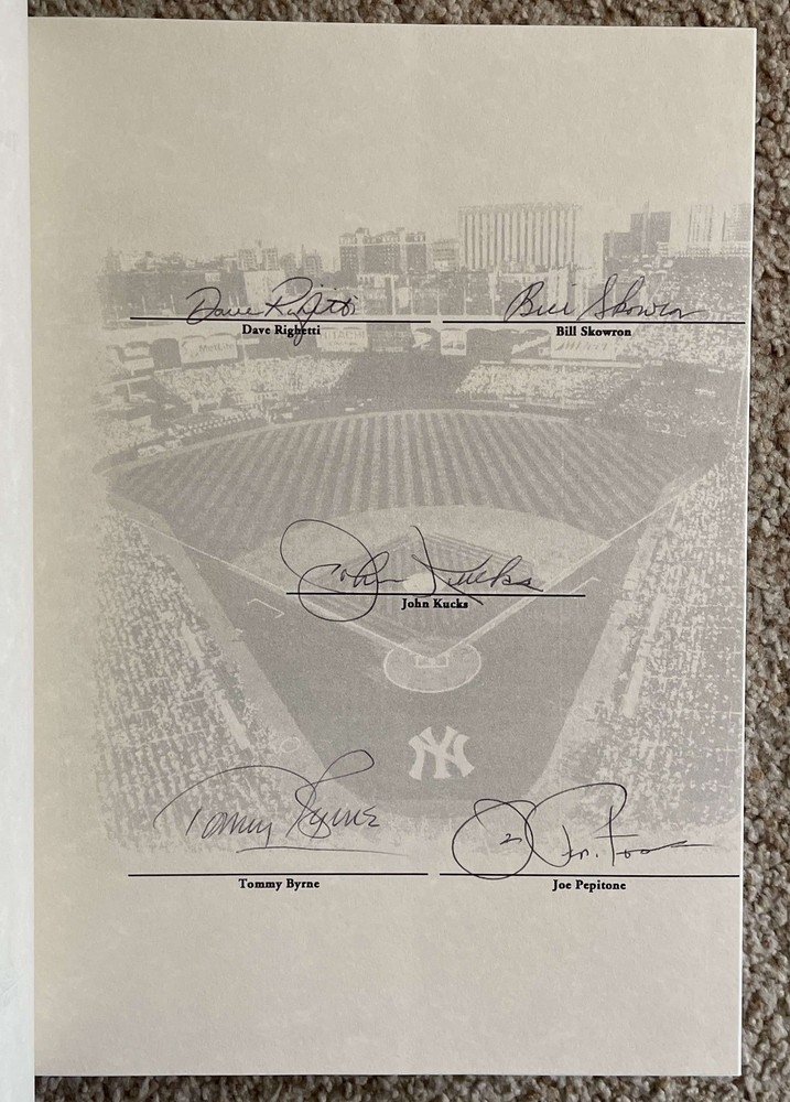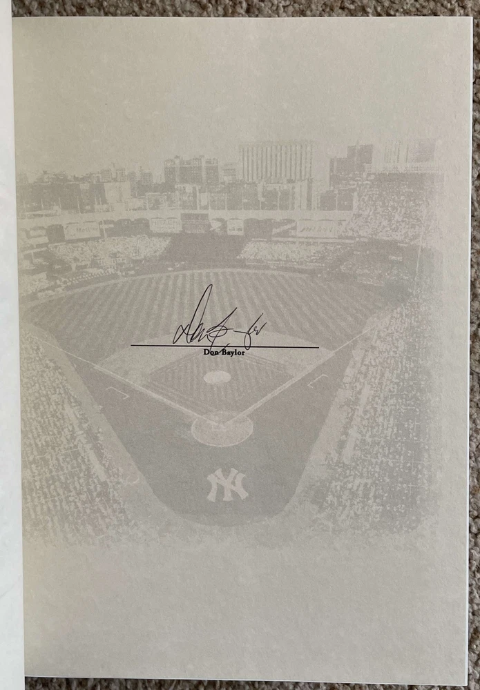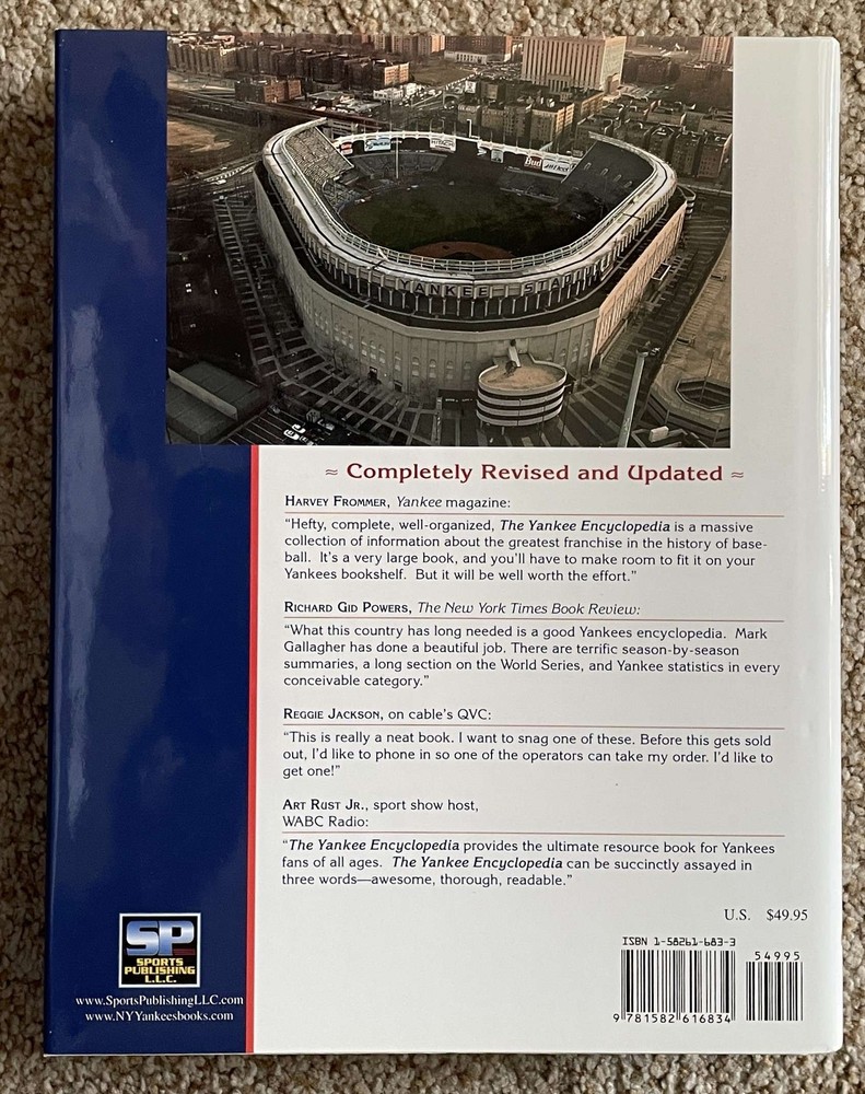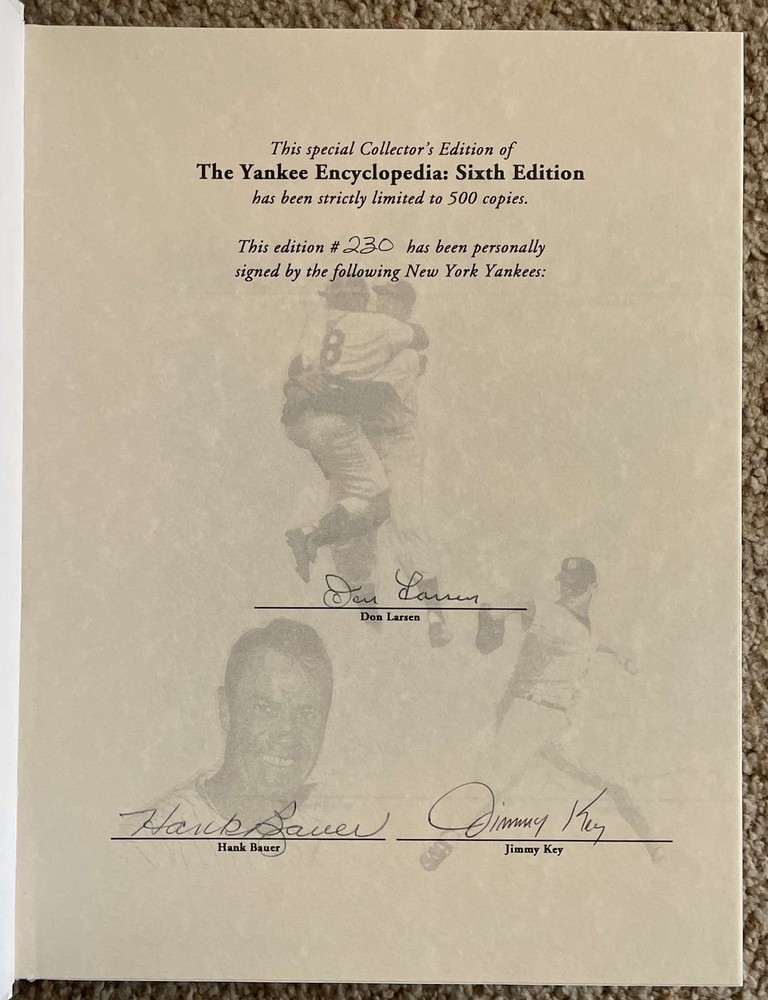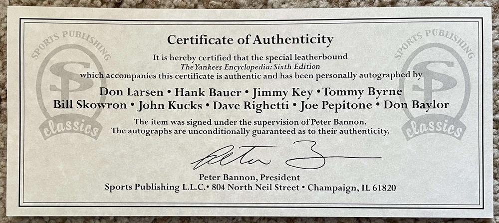Delve into the rich history and lore of America's favorite pastime with "The Yankee Encyclopedia: Sixth Edition." Authored by Mark Gallagher, this collector's edition is a treasure trove of baseball information, perfect for enthusiasts and fans of the sport. With its beautiful leather binding, dust jacket, and certificate of authenticity, this book is not just a read; it's a collectible. From the depths of baseball's legends to its lesser-known stories, this encyclopedia spans 500 pages and encompasses topics that cater to both the casual fan and the serious collector. Signed by nine Yankee greats and including illustrations that bring the text to life, it's a hefty addition to any library, weighing in at 68 ounces with dimensions of 11.3 by 8.4 by 1.7 inches. Two small dimples in dust jacket back, else VF/VF. Brand new and unread, opened only to photograph the signature pages.