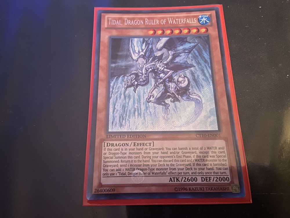 This limited edition secret rare card, CT10-EN001, features Tidal, Dragon Ruler of Waterfalls, with a power of 2600 and a toughness of 2000. The card belongs to the Yu-Gi-Oh! TCG game and has been manufactured by Konami in the United States. The card is standard-sized and falls under the Collectible Card Games category of Toys & Hobbies. The card is in ungraded condition and is perfect for collectors who are looking for a rare and valuable addition to their collection. The card is in English language and is classified under the Creature/Monster Type as Dragon. This card is a must-have for any Yu-Gi-Oh! TCG enthusiast and is a great addition to any collection.