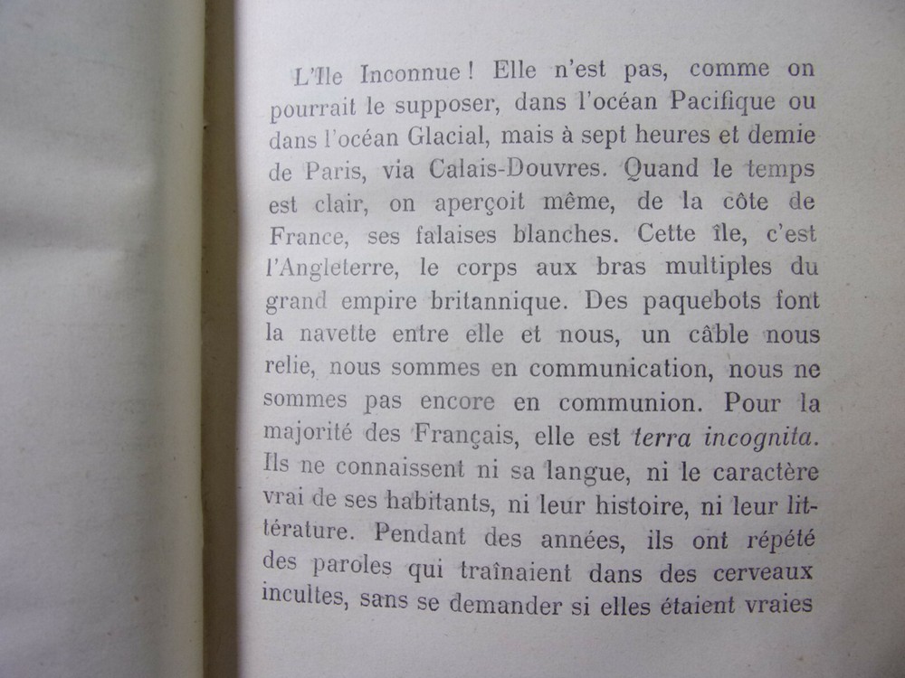 Pierre de Coulevain. L’ÎLE INCONNUE ( Angleterre ) Saint-Olaf - Londres Jeanne Philomène Laperche, alias Pierre de Coulevain, est une écrivaine française née à Bordeaux le 9 avril 1853. Son journal, écrit lors d'un séjour de plusieurs mois en Angleterre. vol relié demi cuir, 180x130, tranche de tête dorée, bon état intérieur, 592pp Calmann Lévy, vers 1920 ref/139