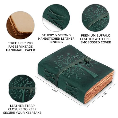 Return Policy Fast Delivery Trusted seller Tree of Life Journal – 6 X 4 (A6) inches – 200 Antique Deckle Edge Handmade Paper – Book of Shadows – Turquoise Color - Vintage Leather Bound Journal for Women & Men Product Description EXQUISITE & UNIQUE LEATHER COVER - This journal is completely handcrafted by rural artisans using cruelty-free water buffalo leather that is 1.5 millimeters thick. It features precise deep embossing on the cover and durable leather cord binding. This leather journal offers a soft touch exterior with a natural, distressed look that’s truly exclusive. WATERCOLOR PAPER - Tree-free and environmentally friendly Handmade deckled edges virgin paper made from cotton waste which gives you Unique and rustic deckled edges add a touch of elegance to your projects because Each sheet is meticulously crafted by skilled artisans. Each sheet has a thickness of 150 (GSM), which makes it suitable for use with any dry or wet medium and any type of pen or marker, without any blotting. VARIETY OF COLORS & SIZES - offers the widest range of leather in various colors, including shades of brown, grey, pink, green, Fuchsia, Turquoise, Black, Tan, Red, Aqua and blue, available in four different sizes: small (6 X 4 inches/A6), medium (8 X 6 inches/A5), large (10 X 7 inches), and extra-large (13 X 8 inches) with 200 Pages. MULTIPLE USE - This leather journal from is versatile and can be used for a variety of purposes, such as a sketchbook, pregnancy journal, Bible journal, prayer journal, wedding guest book alternative, and more. You can also use it to attach photos and create a beautiful vintage photo album, record your thoughts, and pass it down to future generations, making it an item with endless possibilities. PROMISE TO OUR BUYERS - Why choose the Vintage Leather Journal? Because provides genuine 1.5 mm thick water buffalo leather covers that will keep the inner pages safe for centuries. The 150 GSM thick pH-neutral virgin cotton paper will always maintain your artwork's quality for centuries. The lifespan of pure cotton paper is approximately 10 times longer than that of normal paper. Shipping Returns Payment Shipping Shipping is FREE to all addresses other than APO/PO boxes in the lower 48 states. All our stock ships from US-based warehouses. Shipped via USPS or UPS (depending on location and package weight) Unless stated otherwise, all orders will ship within 24-72 hours of your payment being processed. Check our feedback to see the great reviews of FAST shipping we offer. Returns Seller does not accept returns Payment We currently accept payment via eBay managed payments only. Once payment is cleared, we will dispatch your shipment within 1-3 business days. Please refer to the "Shipping" tab for more information regarding shipping speed to your destination.