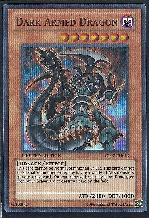 =====You are Getting===== USA Seller Yugioh Dark Armed Dragon - CT07-EN016 - Super Rare Limited Ed NM =====Shipping===== We also do combined shipping for all the items you buy from us! We will do our best to ship all the items within 2 business days after payment is received and we will double check before we send. Please double check your address to prevent any unnecessary delay. ===Others=== Please contact us if there are any questions or problems. We will try our best to respond as fast as possible. Please leave us positive feedback and we will leave you feedback too once we receive feedback from you. If there are anything that you are not satisfied with your purchase, please do not hesitate to give us a message. We strive to make great communication with our buyers. Happy buying or bidding!! Thank You!!