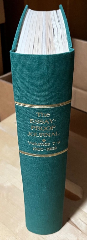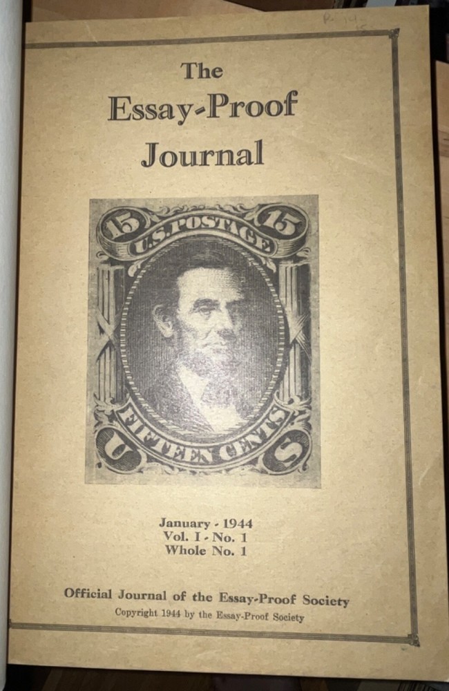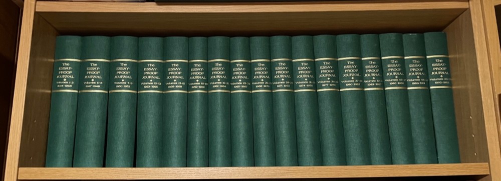 Essay-Proof Society. THE ESSAY-PROOF JOURNAL. Volumes 1–50 (1944–1993), complete, as issued in 200 illustrated numbers. Uniformly bound in seventeen volumes. 8vo, recent green cloth; spines ruled, lettered and decorated in gilt; original printed or pictorial card covers bound in. Approximately 10,000 pages. Some issues worn or with stained covers. Issues are mostly near fine; the bindings are new. While primarily philatelic, the Essay-Proof Journal is also highly relevant to banknote collectors and students of engraving. Over a half century, its many thousands of pages of text and illustrations touched on virtually every aspect of the topic. Recently bound to better preserve the set. Very rarely encountered complete and more-so bound. Clain-Stefanelli 555. Ex. Eric P. Newman Library. Ex Eric P. Newman Numismatic Education Society. Ex. George F. Kolbe Library. Except that it's not bound in leather, you will not find a better set than this one! Very heavy, hence will cost a lot to ship. But I will pack it well. Or you can pick it up in New Jersey upon prior arrangement.
