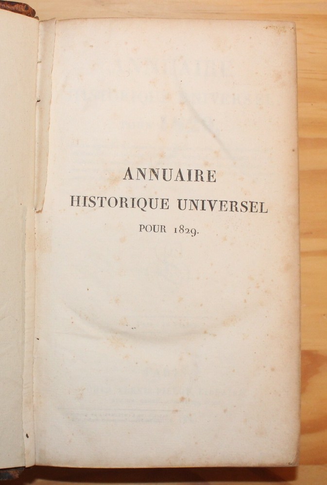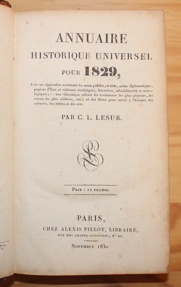 Universal Historical Directory for 1829 By CL Lesur Year 1829 in details. Published in 1830 by Alexis Pillot in Paris . Pages: 302 Size: 13 x 21 cm Fair condition, worn leather cover. Packed corners to restore. Fresh interior but traces of folds on the pages. Universal Historical Directory for 1829 By CL Lesur Year 1829 in details. Published in 1830 by Alexis Pillot in Paris. Pages: 302 Size: 13 x 21 cm Fair condition, worn leather cover. Packed corners to restore. Fresh interior but traces of folds on the pages.