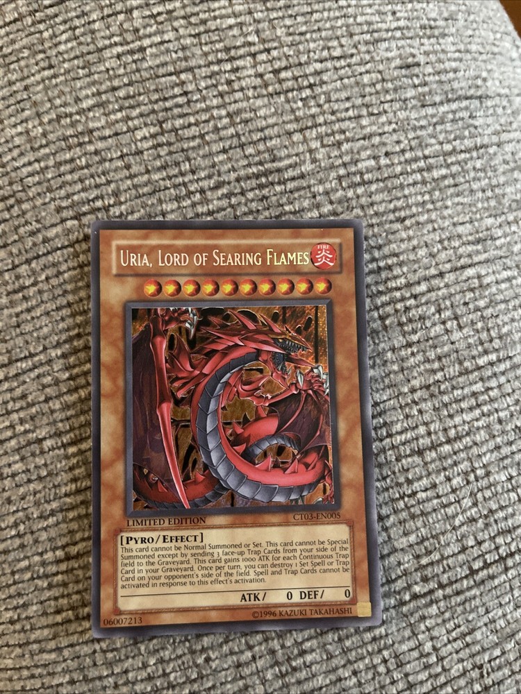 This limited edition collectors tin features the powerful Uria, Lord of Searing Flames from the Yu-Gi-Oh! TCG. With a secret rare rarity, this card is a must-have for any serious collector. The card number is CT03-EN005 and it was manufactured by Konami in 2006. The card is an effect type with no defense or toughness, but it is able to deal 0 attack power. It belongs to the Fire attribute and Pyro creature/monster type. The card is in English language and comes in the 2006 Collectors Tin set. Don't miss out on the chance to add this rare and sought-after card to your collection.