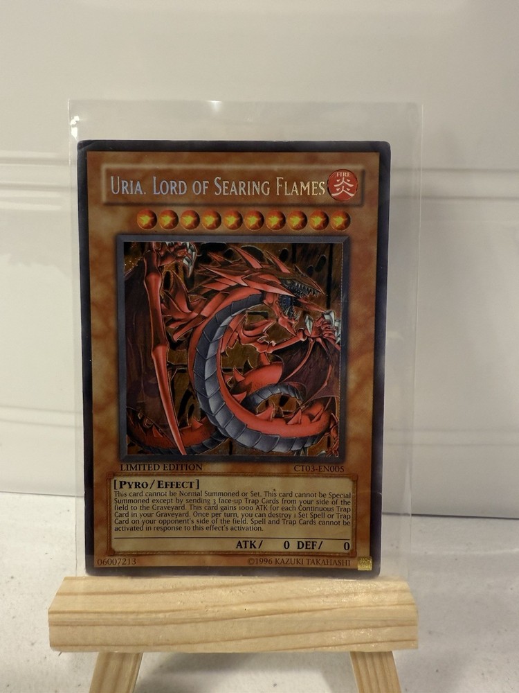This limited edition card from the 2006 Collector's Tin is a must-have for any Yu-Gi-Oh! TCG enthusiast. With its fiery attribute and pyro monster type, Uria, Lord of Searing Flames is a powerful effect card that can add some heat to your deck. The card features a stunning secret rare rarity and is in English language. The card's defense and attack power is at 0, making it a fast-paced card that can turn the tides of any game. The card is manufactured by Konami and has the card number CT03-EN005. Don't miss out on the chance to add this limited edition card to your collection.