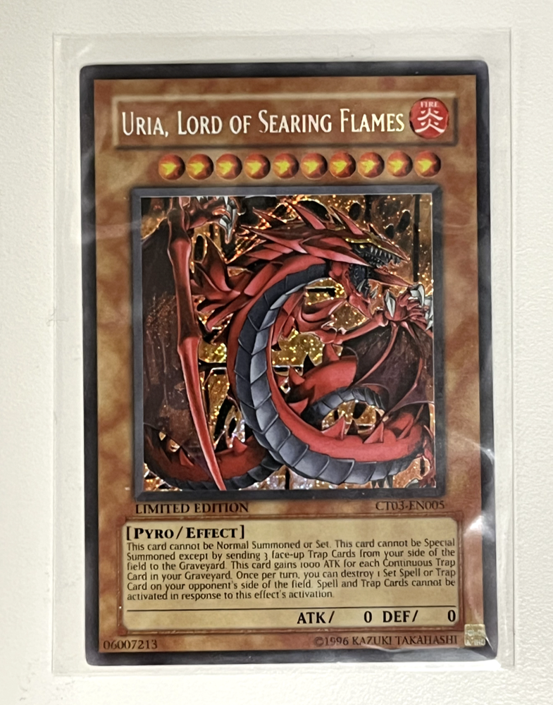 Please, carefully read the following: Image shown is a stock photo and does not reflect the actual card you will be receiving. Please refer to the condition guide below, the title and item description for what you will be receiving. Please also be aware that due to plastic shortages, orders may not always come in a plastic toploader but will always be protected as much as possible to prevent damage. You will receive 1x Uria, Lord of Searing Flames - CT03-EN005 - Secret Rare - Limited Edition - Condition: Moderately Played Please refer to the Title and Item Description above for the item being purchased. Delivery delays: Deliveries may not always fall within the estimated delivery dates when shipping outside of Canada and USA. Many factors may contribute to delays in delivering the package such as weather and customs. Please note that delivery to international locations may take up to 8 weeks to arrive . We always ship out orders within 1 business day and after dropping off with the post office, delivery times are out of our control. Feedback: We will always leave positive feedback for you and we ask if you can do the same for us. If there is any reason why the transaction was not up to your expectations, please message us before leaving feedback so we can address the issue. Combined shipping: To receive a combined shipping quote, please make sure that you commit to purchasing on ebay.ca . This allows us to send you a combined shipping invoice before payment. Shipping within the USA (6-10 Business days): FREE! Shipping within Canada (3-8 Business days): FREE! Shipping and handling delay: We aim to ship all orders within 1 business day. We do not ship on weekends and holidays. Condition Guide: We do not sell any cards that are in MINT condition, the best condition that we offer is near mint. Near Mint (NM) - Cards in Near Mint condition show minimal to no wear from shuffling, play or handling and can have a nearly unmarked surface, crisp corners and unblemished edges outside of a few minimal flaws. A Near Mint card may have a tiny edge nick or a tiny scratch or two, but overall look nearly unplayed with no major defects or flaws. Lightly Played (LP) - Cards in Lightly Played condition may have minor border or corner wear or even just slight scuffs or scratches. There are no major defects such as water damage, bends or issues with the structural integrity of the card. Noticeable imperfections are okay, but none should be too severe or at too high a volume. Moderately Played (MP) - Cards in Moderately Played condition exhibit condition issues visible at a casual glance. Cards in Moderately Played condition can have border wear, corner wear, scratching or scuffing, creases or whitening, minor dirt buildup or any combination of mild examples of these marks. A Moderately Played card may have some form of a more major marking, such as spot water damage or creasing that doesnʼt affect card integrity, but not in combination with other issues such as scratches, scuffs or border/edge wear and not impacting a large area of the card. Heavily Played (HP) - Cards in Heavily Played condition show a severe amount of wear. Heavily Played condition can include cards that have major creasing, major whitening, major border wear or any combination of those flaws. (These flaws cannot prevent the card from being tournament playable when sleeved.) Damaged - Cards in Damaged condition can exhibit a tear, bend or crease that may make the card illegal for tournament play, even in a sleeve. Cards in Damaged condition may have extreme border wear, extreme corner wear, heavy scratching or scuffing, folds, creases or tears or other damages that impacts the structural integrity of the card.